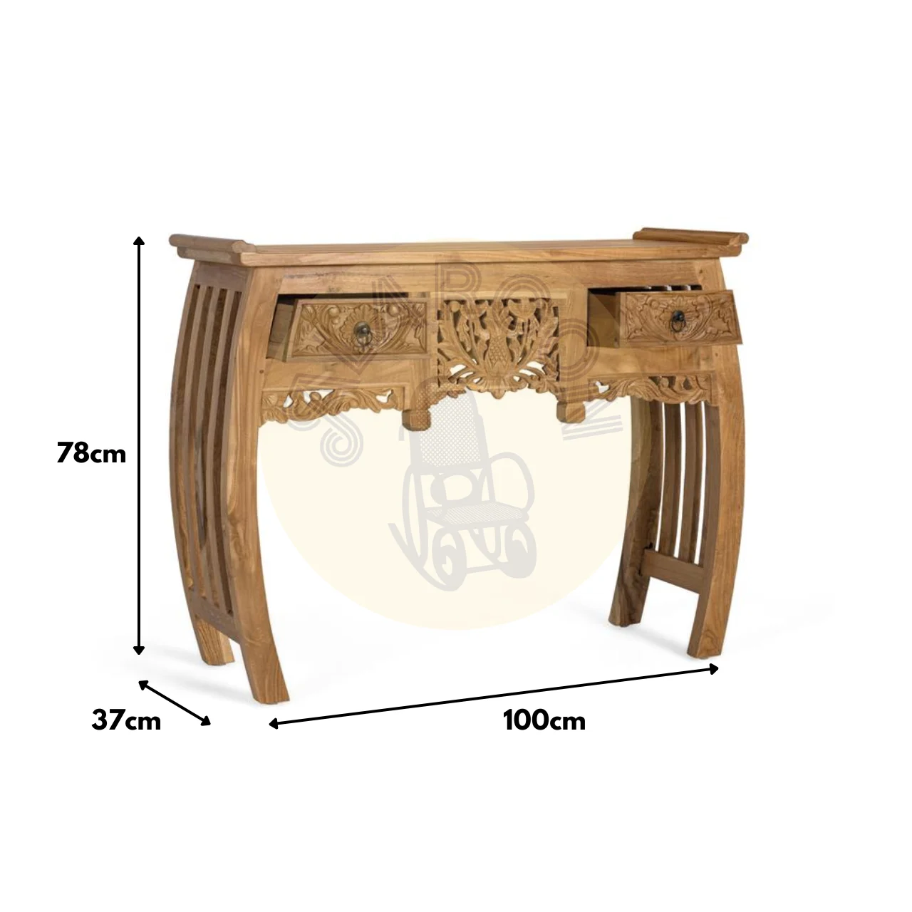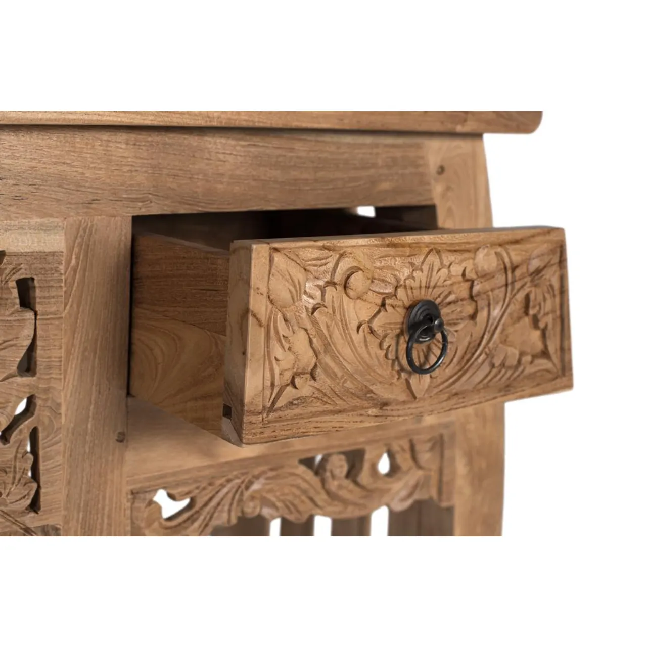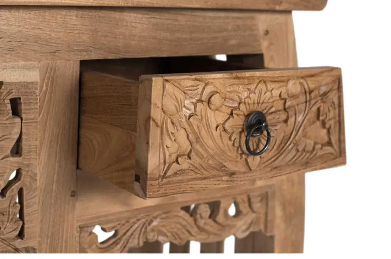 Con unas medidas de 100 cm de largo, 78 cm de alto y 37 cm de ancho, incorpora dos cajones frontales tallados a mano con delicados motivos florales y un panel central calado que aporta ligereza visual y un toque decorativo distintivo.