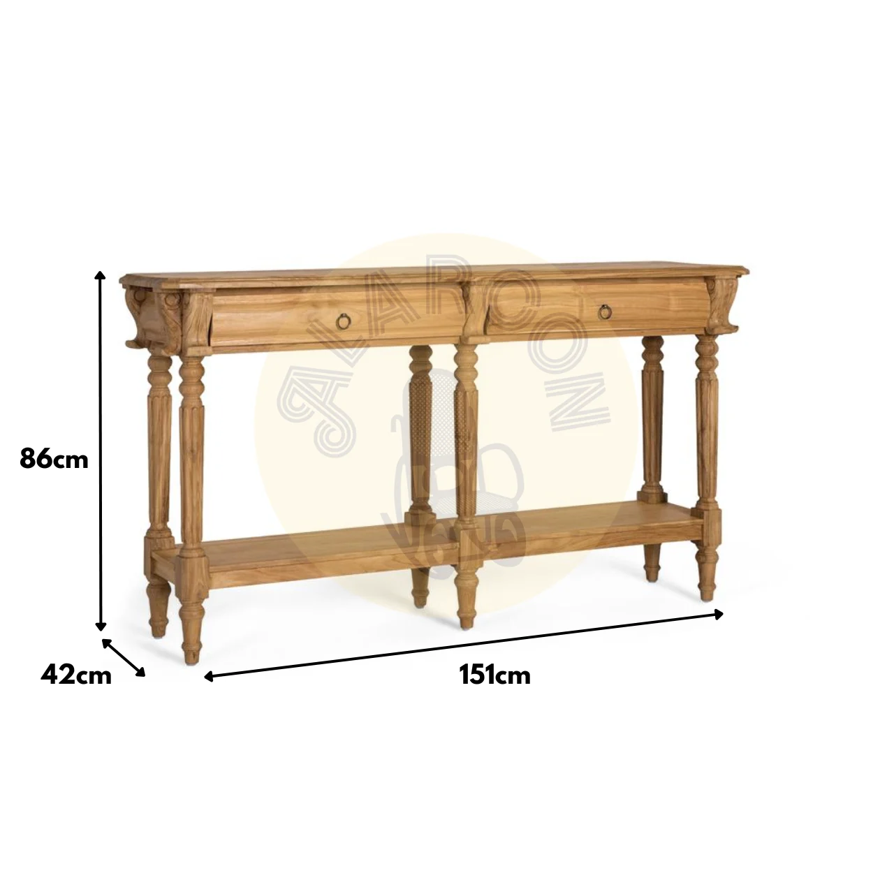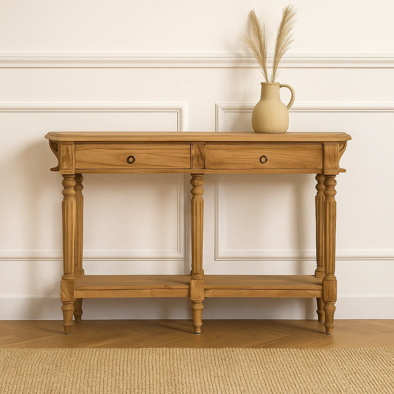 La consola de madera maciza de teca combina artesanía tradicional y diseño atemporal en una pieza de gran carácter decorativo. Su acabado natural resalta las vetas y matices únicos de la madera, aportando calidez y elegancia a cualquier espacio.
