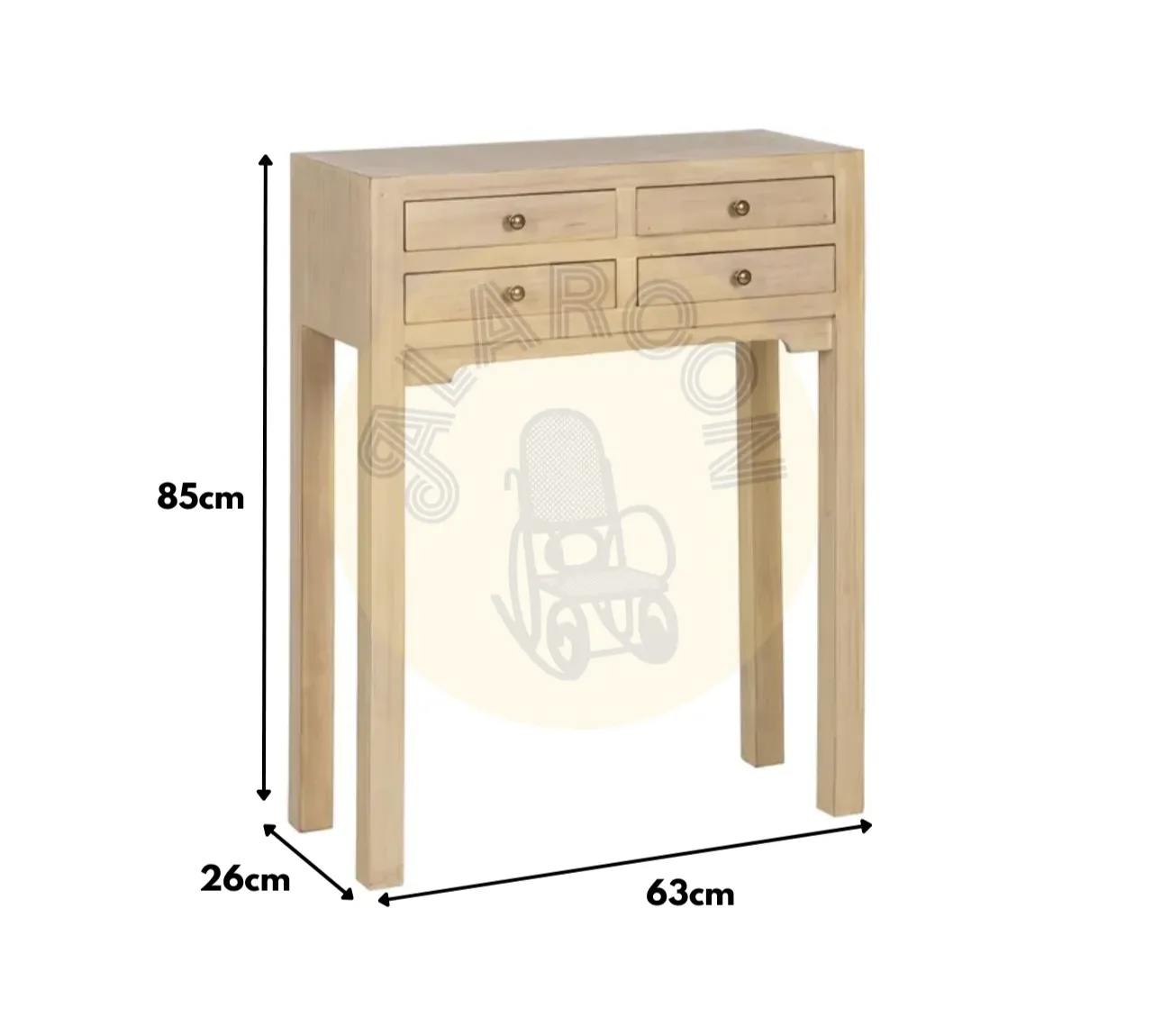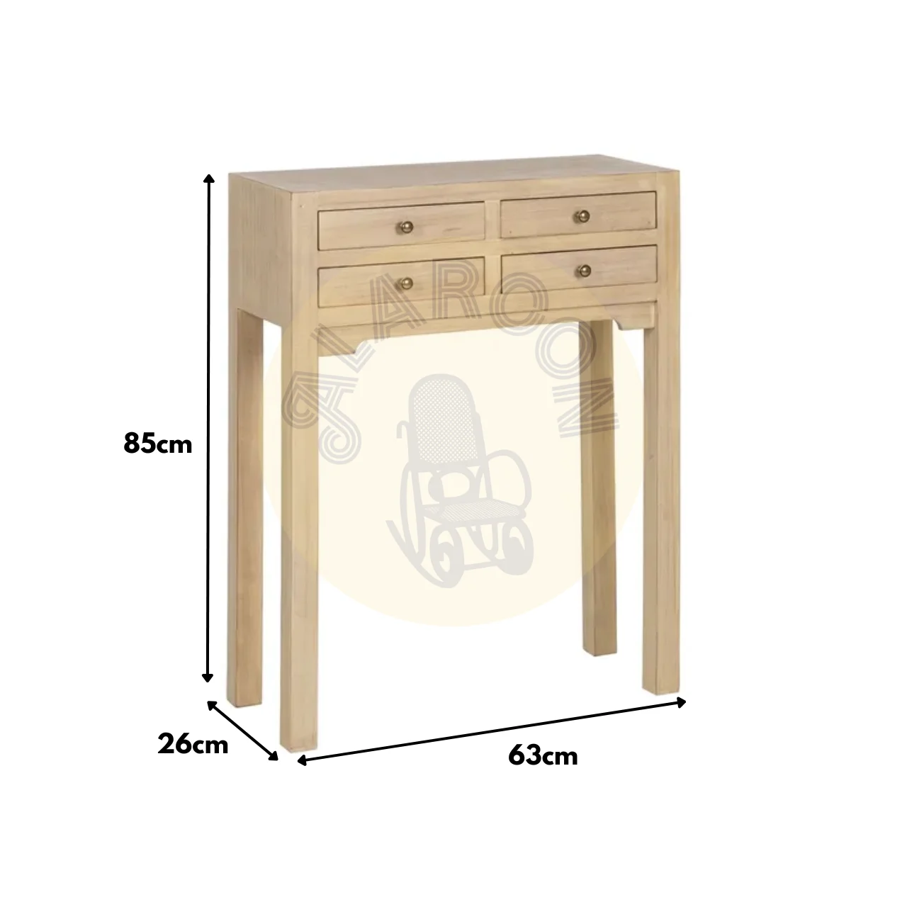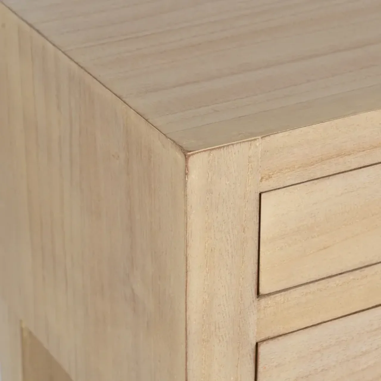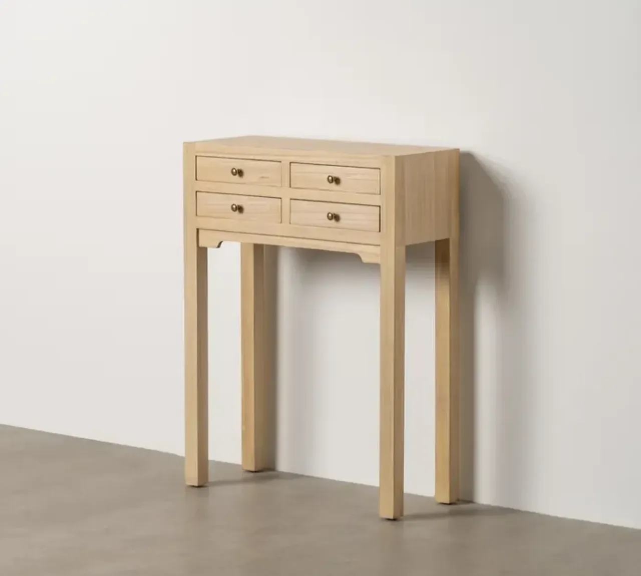 La consola en madera natural combina una estructura de DM con un revestimiento de paulonia, creando un diseño ligero y funcional que aporta calidez y estilo a cualquier estancia.