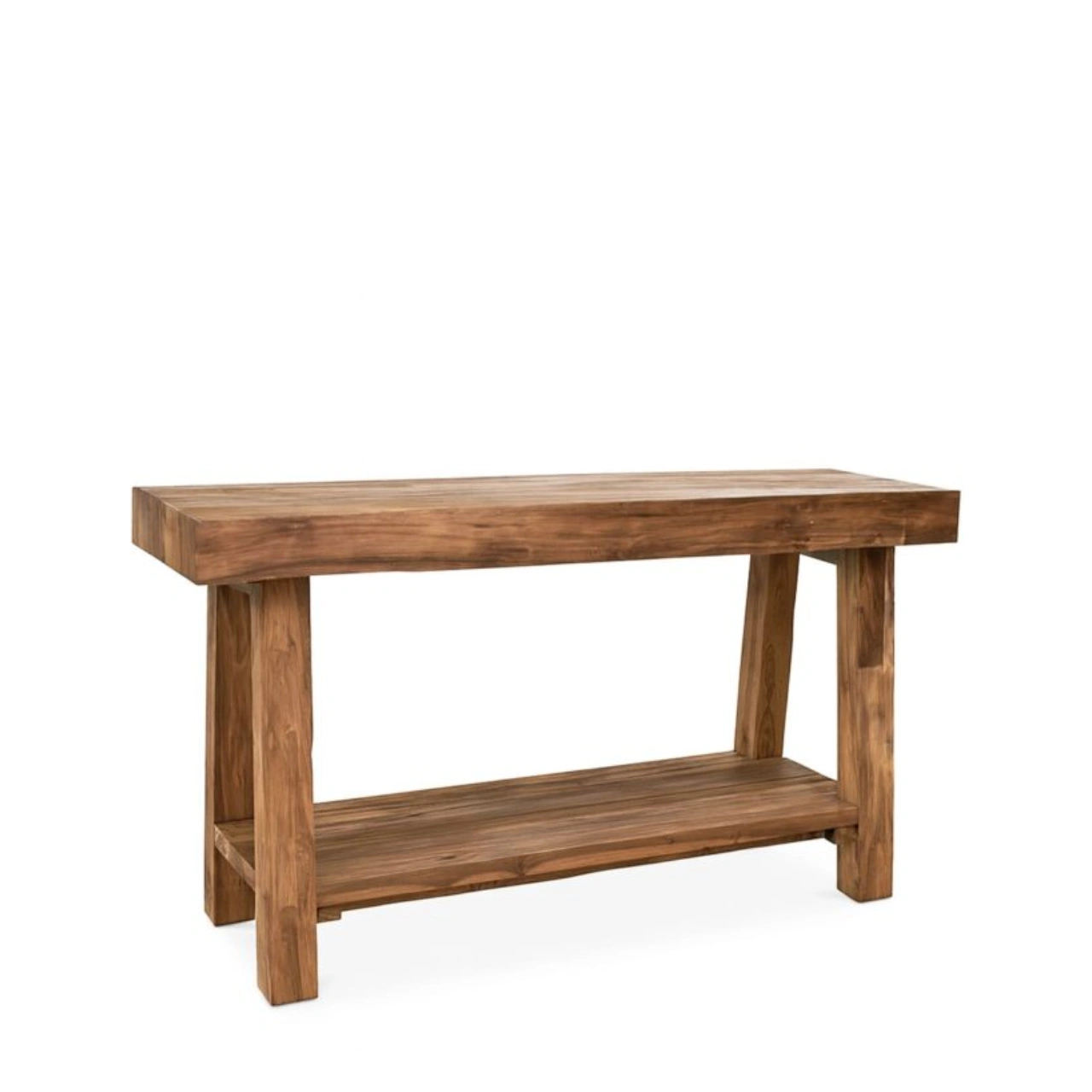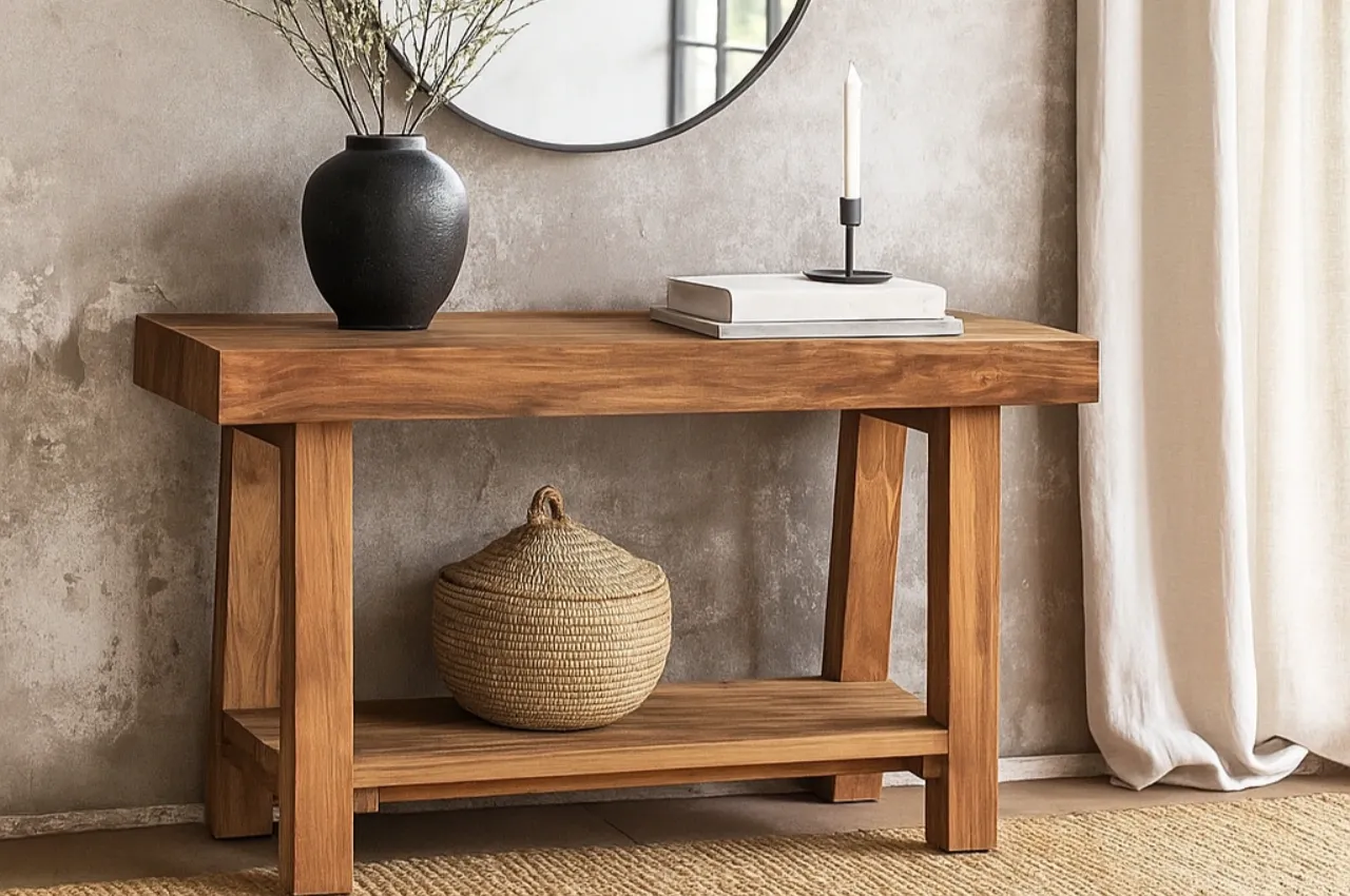 Realza el ambiente con esta consola de madera de teca reciclada, un material de gran resistencia, textura natural y una estética auténtica que aporta carácter a cualquier entrada o salón. Su fabricación artesanal hace que cada pieza sea única, mostrando variaciones que refuerzan su personalidad y un estilo cálido y atemporal.