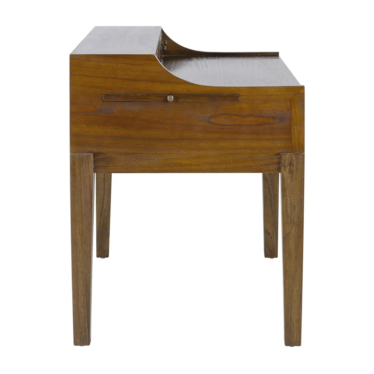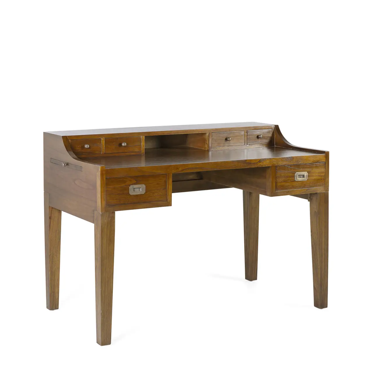 Maximiza el espacio de tu hogar u oficina con las dimensiones eficientes de este escritorio: ancho de 150cm, profundidad de 70cm y una altura cómoda de 75cm. La combinación de cajones y bandejas ofrece una gran versatilidad para guardar documentos, material de oficina u objetos personales. Los detalles en bronce ofrecen un contraste sublime con la madera, resultando en un mueble que combina funcionalidad y estética.