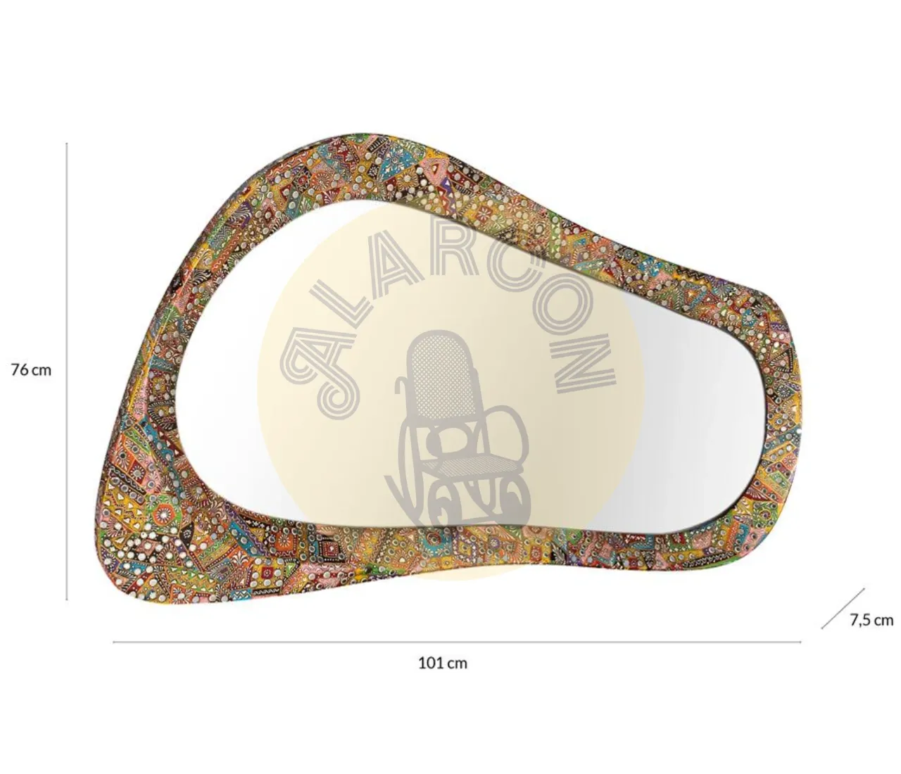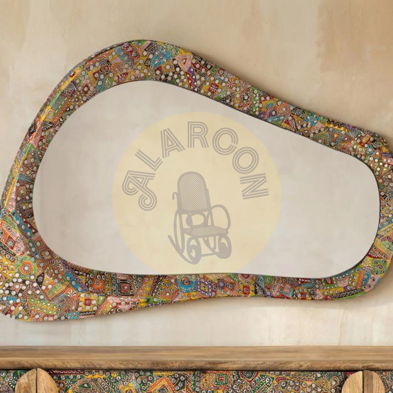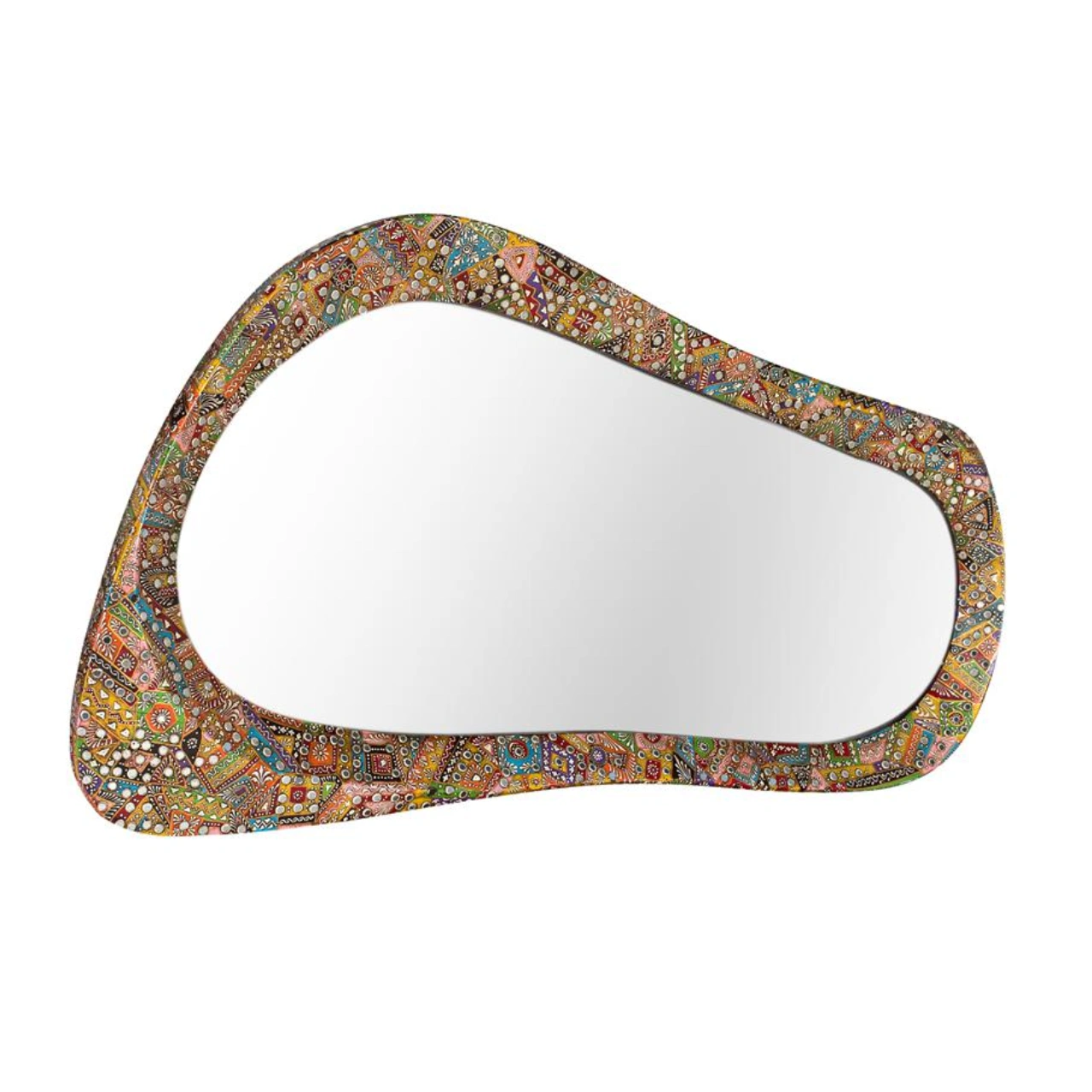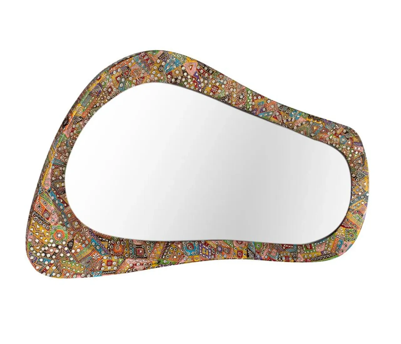 Aporta personalidad a tu hogar con este espejo decorativo étnico de diseño orgánico irregular, creado con un marco artesanal con incrustaciones multicolor que convierte cada pieza en un elemento visual único. Su estética artística realza la decoración y lo posiciona como protagonista en salones, recibidores o dormitorios con estilo natural o étnico.