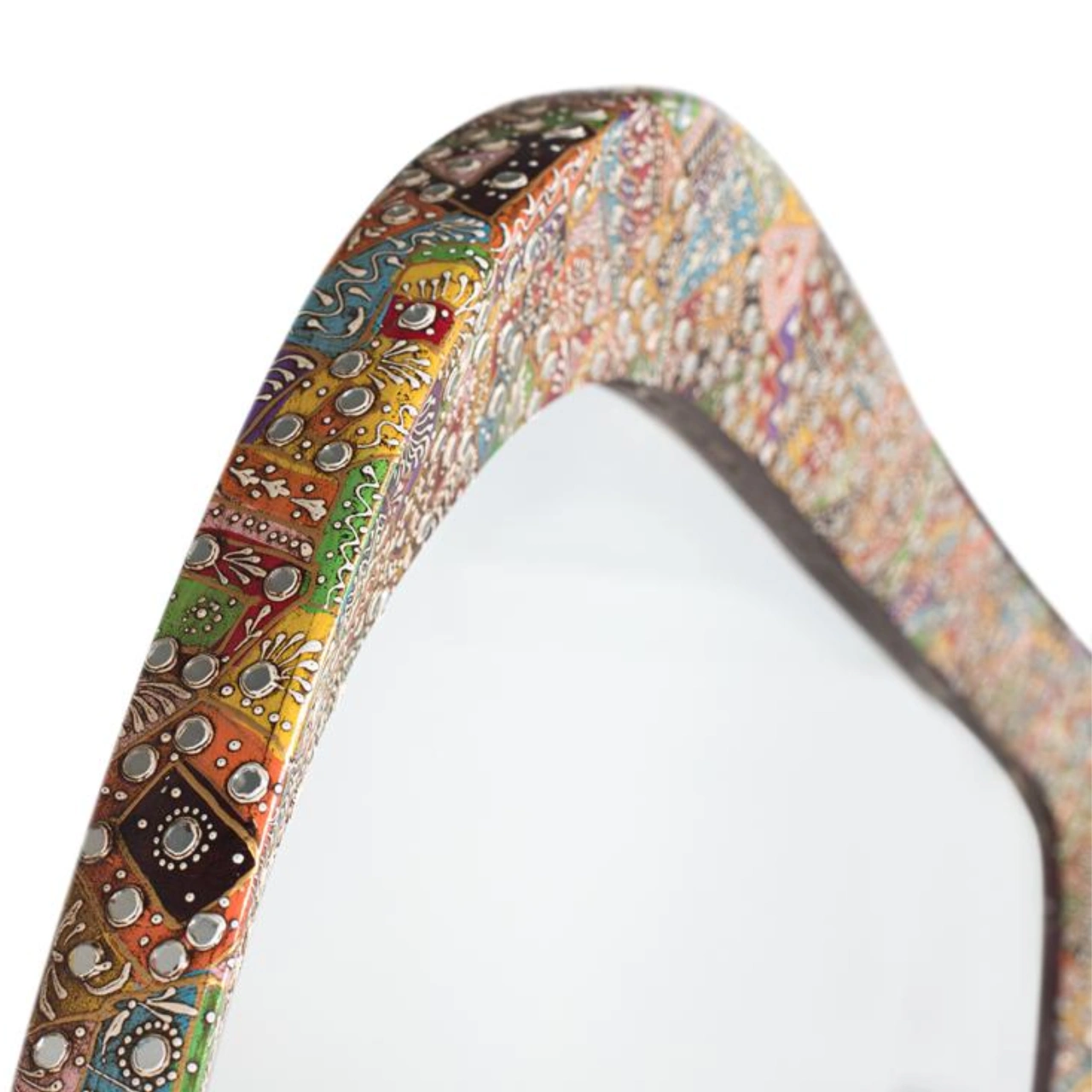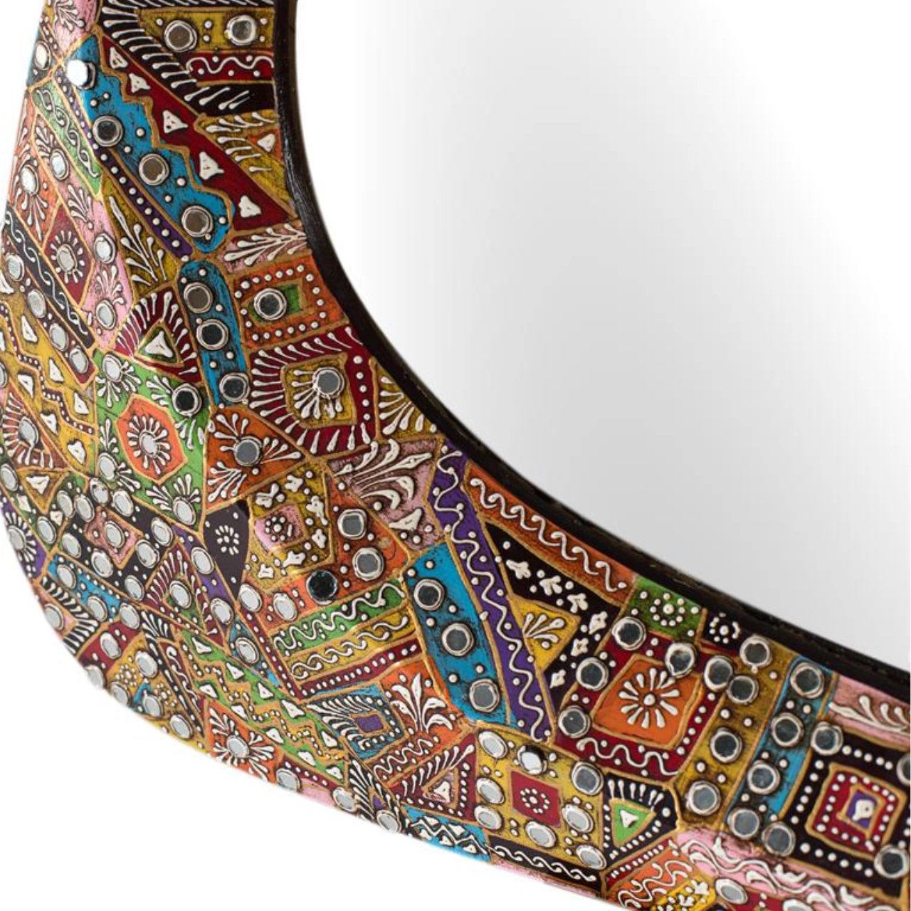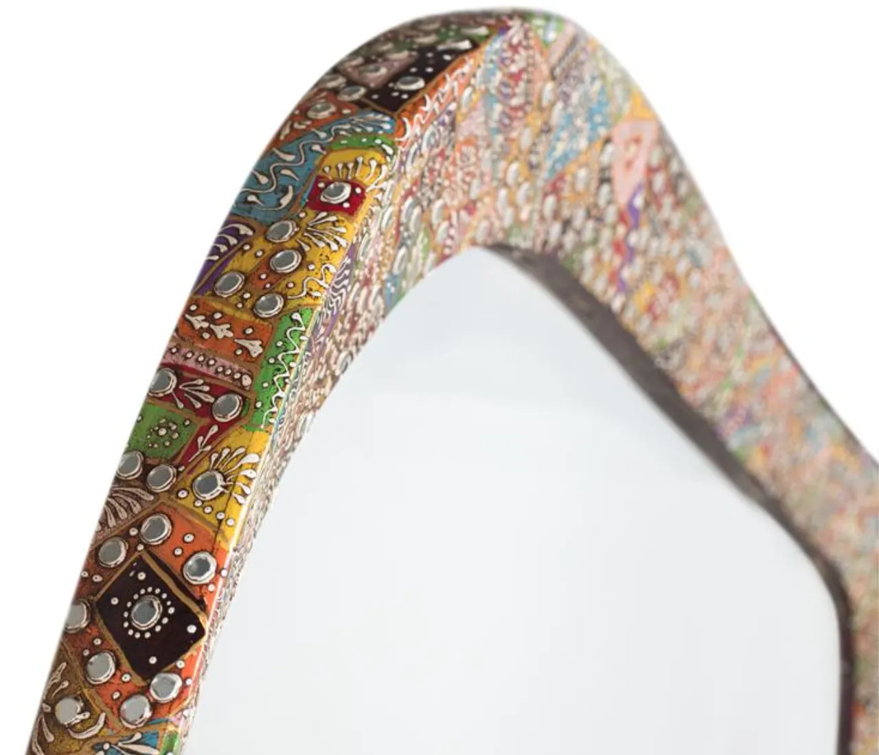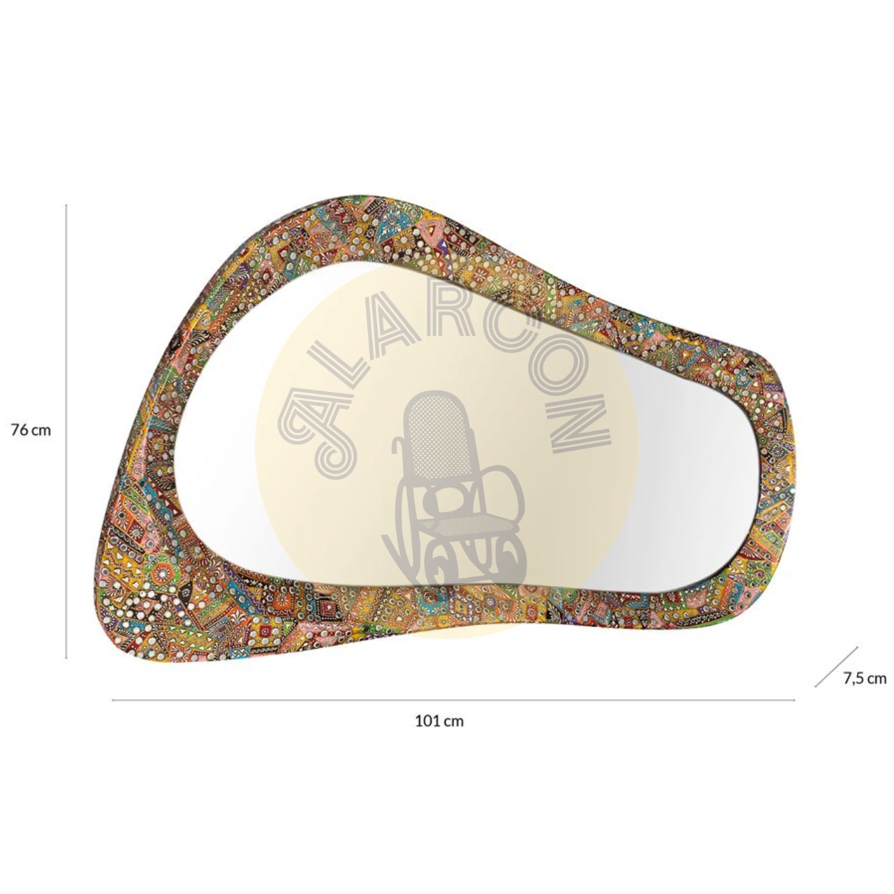 Aporta personalidad a tu hogar con este espejo decorativo étnico de diseño orgánico irregular, creado con un marco artesanal con incrustaciones multicolor que convierte cada pieza en un elemento visual único. Su estética artística realza la decoración y lo posiciona como protagonista en salones, recibidores o dormitorios con estilo natural o étnico.