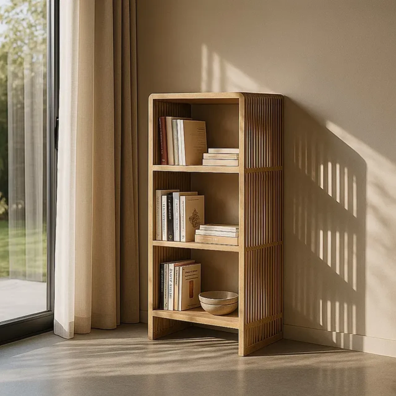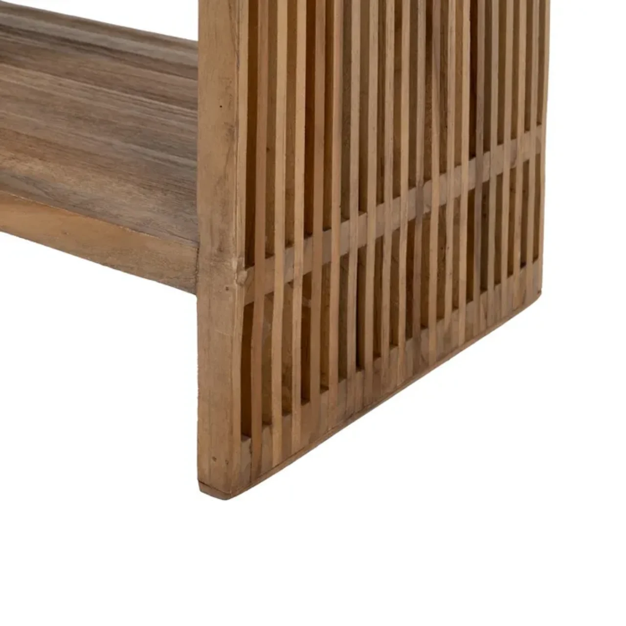 La estructura en teca presenta líneas limpias, pensada para almacenamiento y exposición discreta en salón u otros espacios de uso diario.