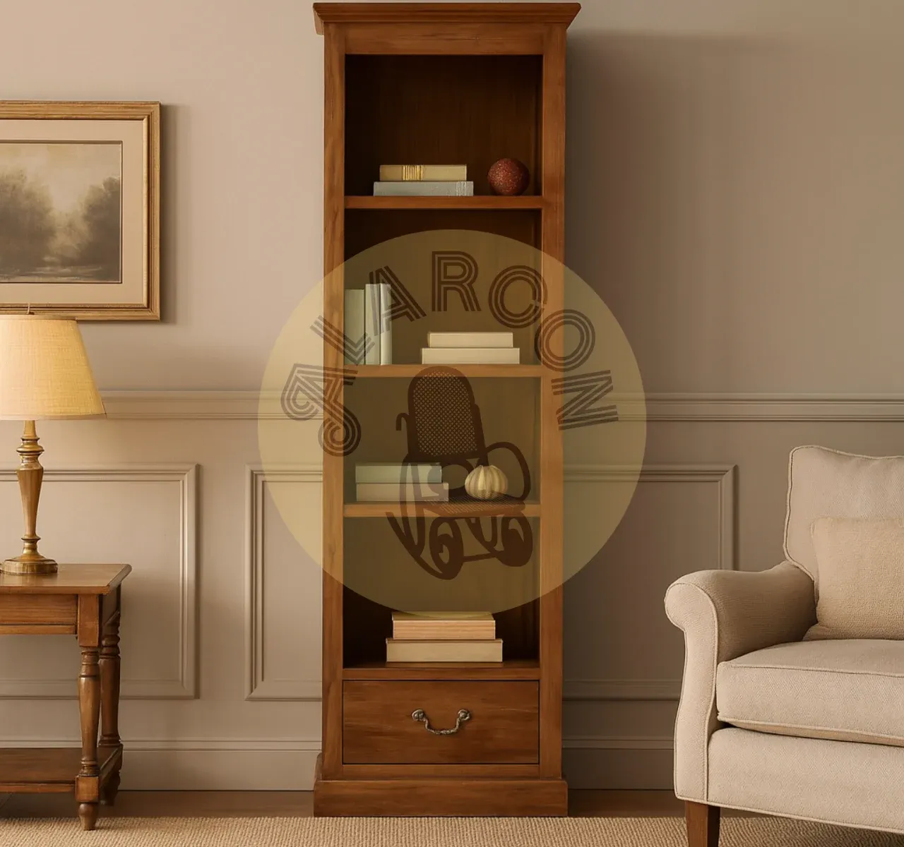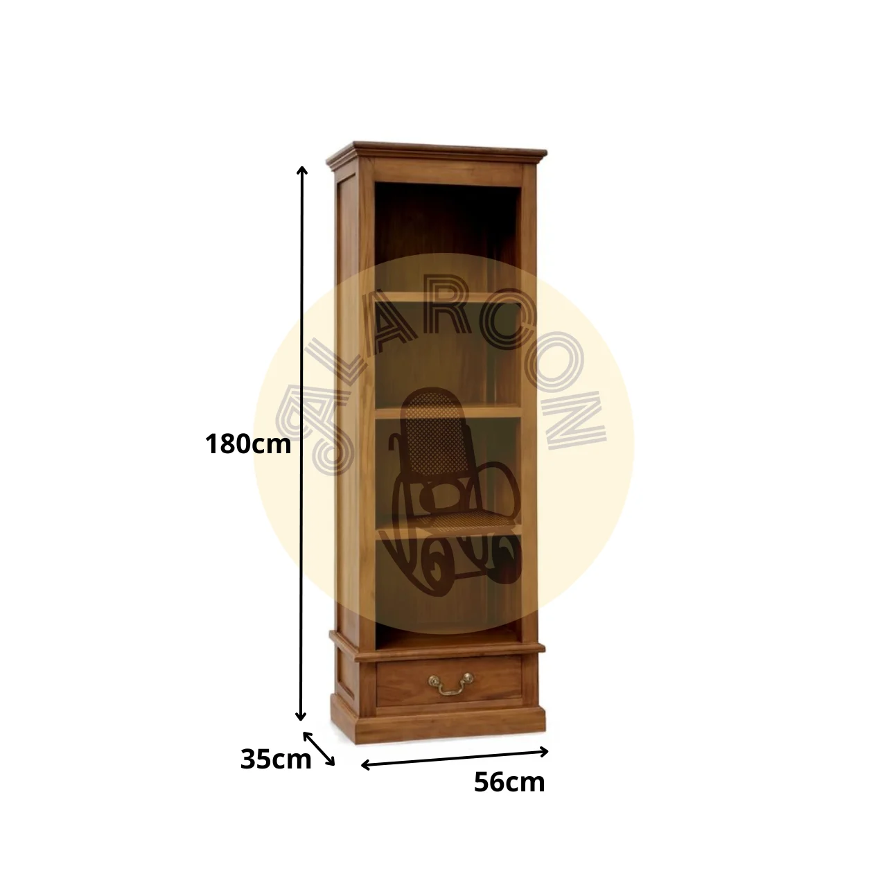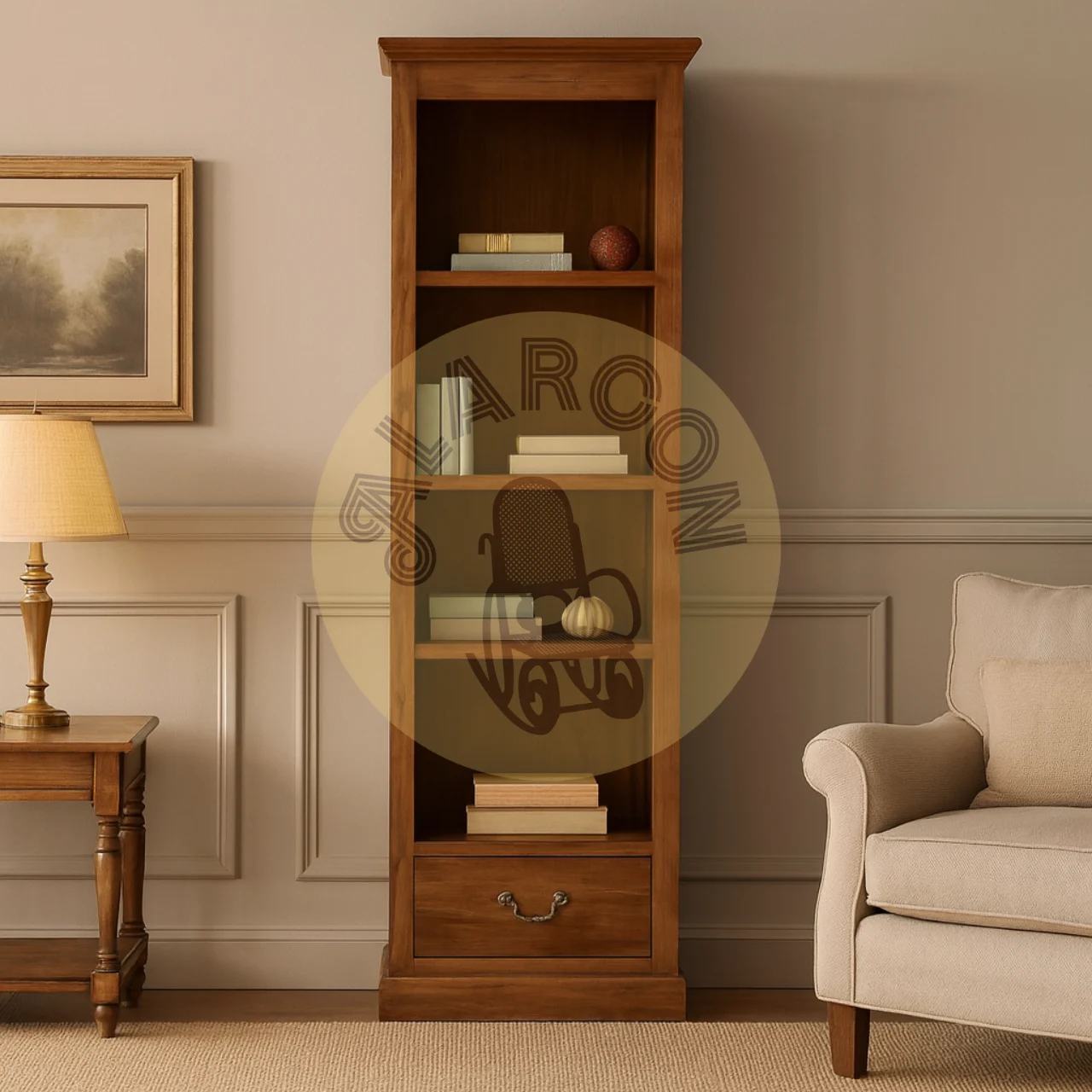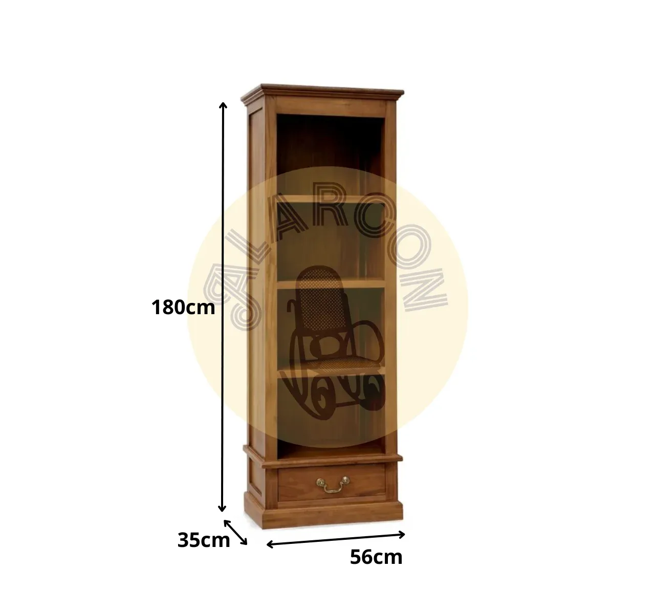 Fabricada en madera de caoba maciza, esta librería destaca por su acabado artesanal y su diseño atemporal. Cada pieza está hecha a mano, ofreciendo una textura y tono únicos que realzan la calidez de cualquier estancia.