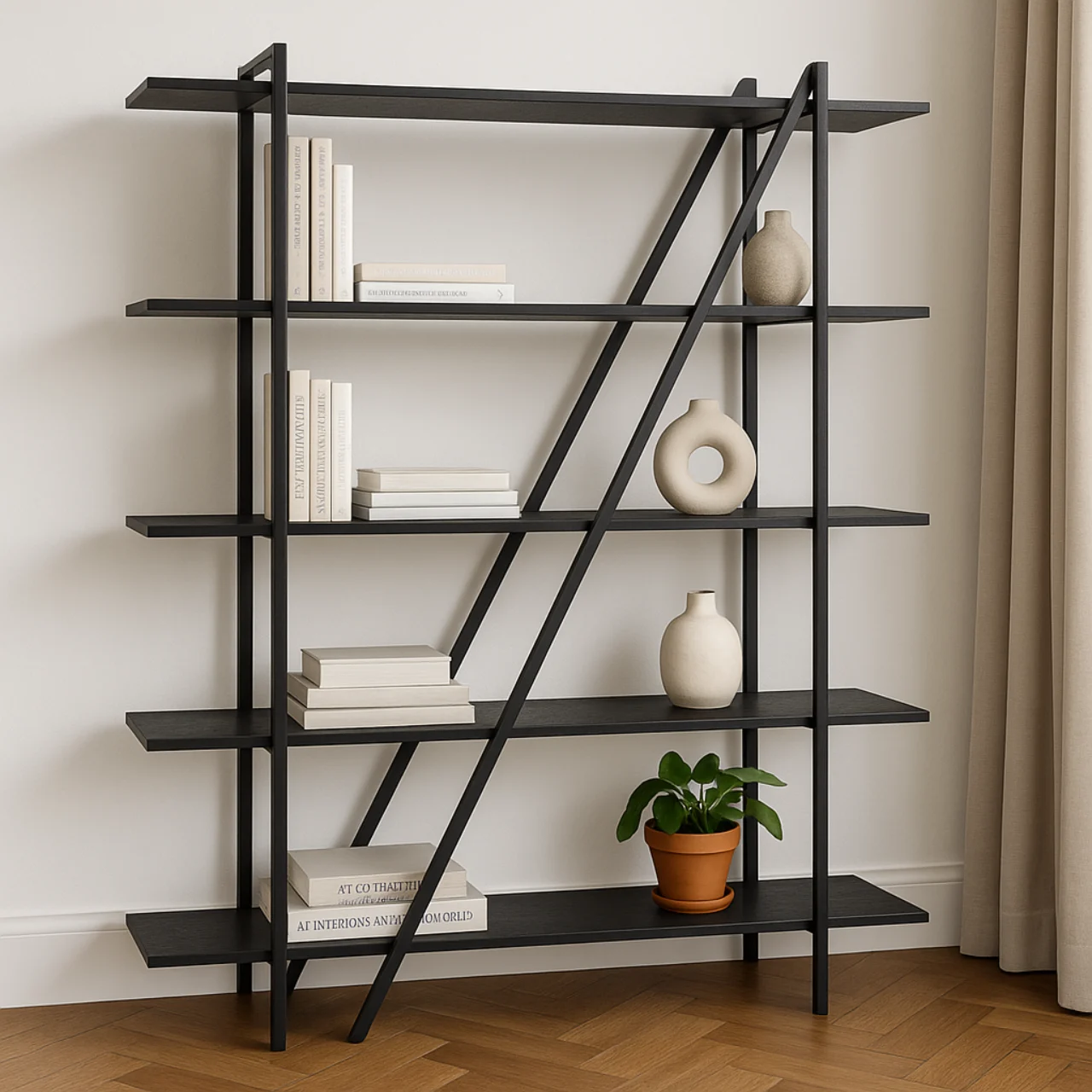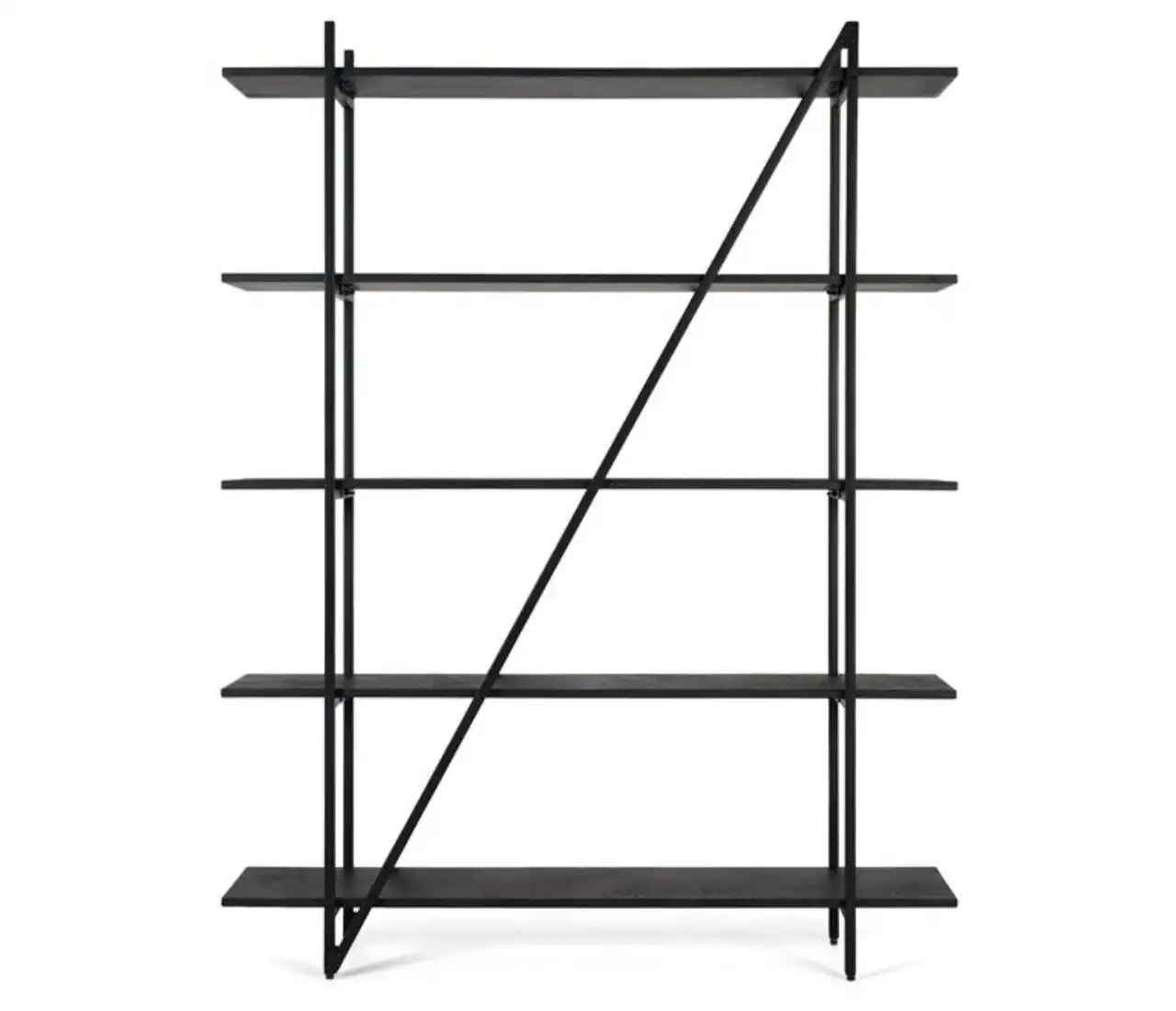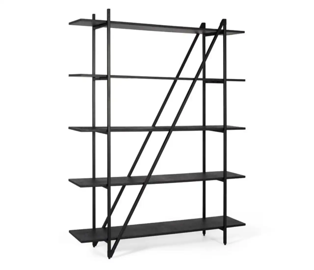 Con cinco niveles, ofrece una capacidad generosa para organizar libros, objetos decorativos o accesorios cotidianos. La disposición abierta permite que la luz atraviese la estructura, aportando ligereza visual y evitando bloqueos en la percepción del espacio.