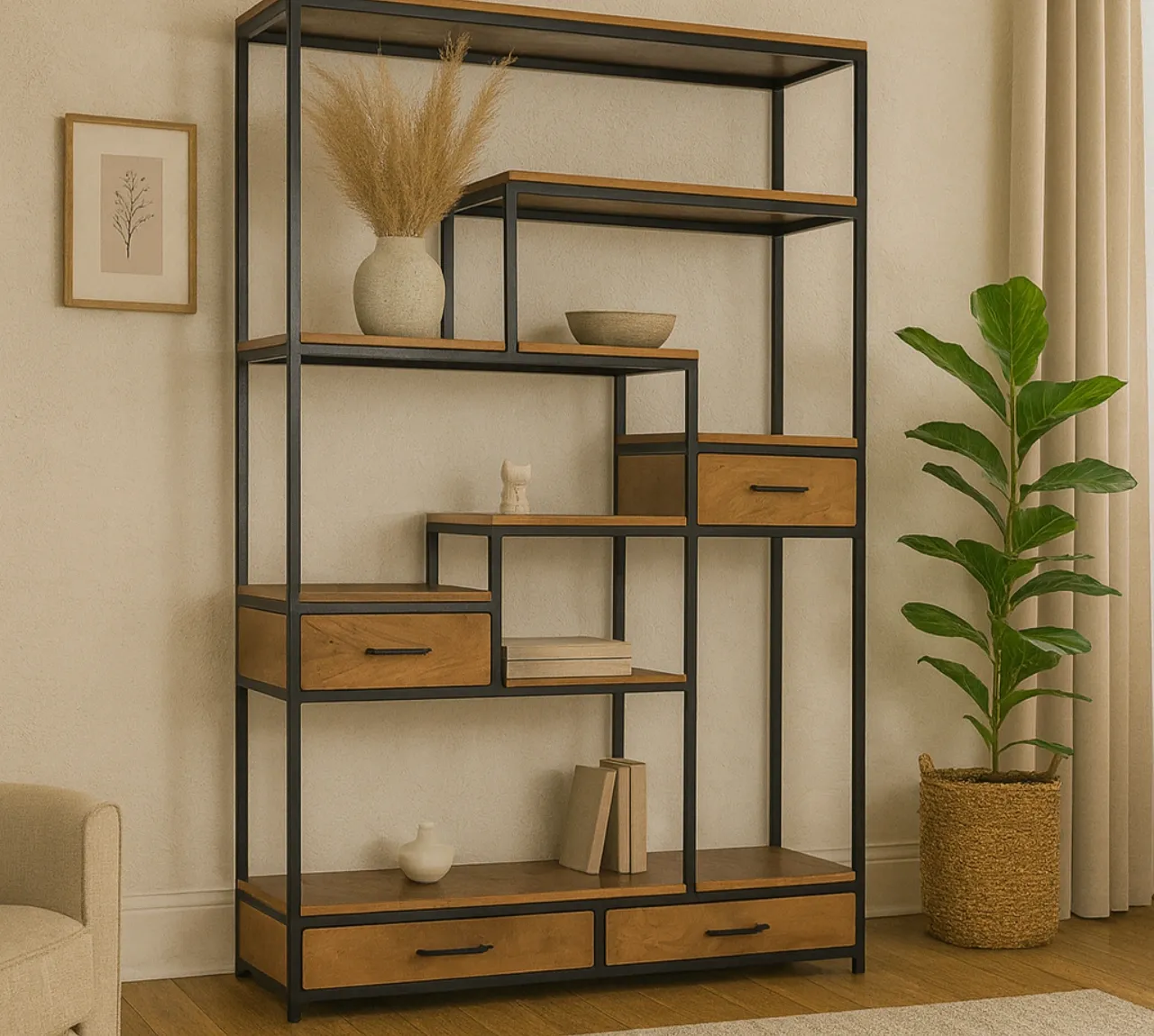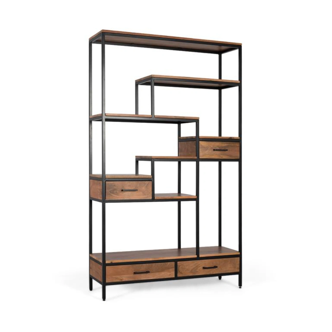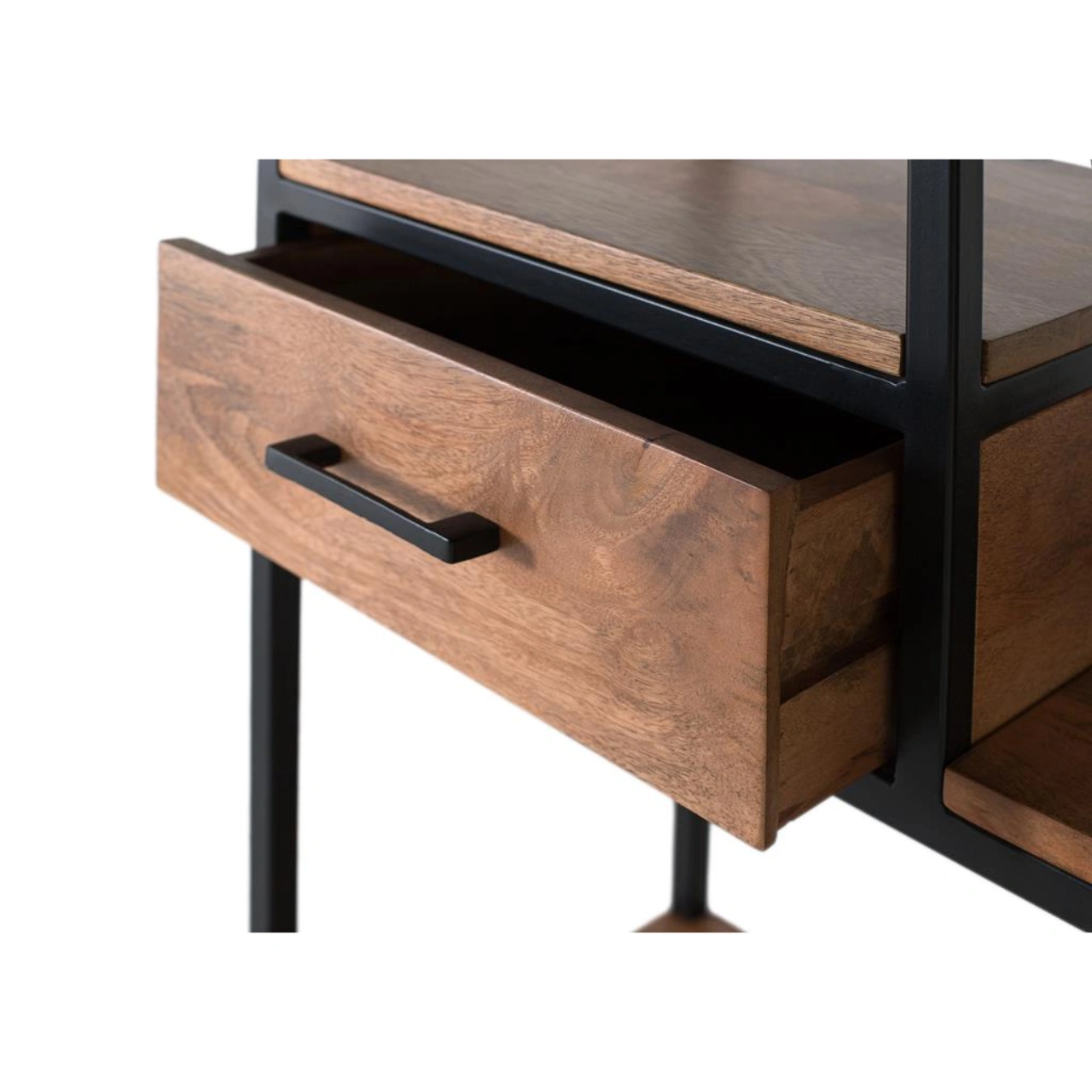 Los estantes en madera de mango, con su acabado natural y vetas visibles, añaden un contraste orgánico que refuerza la personalidad del diseño. Además, incorpora cuatro cajones distribuidos en distintos niveles, perfectos para mantener orden y optimizar el almacenamiento de pequeños objetos.