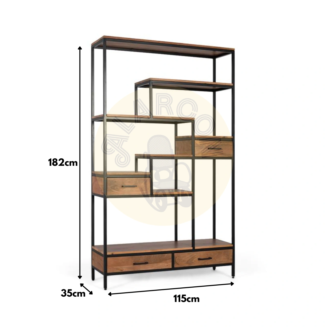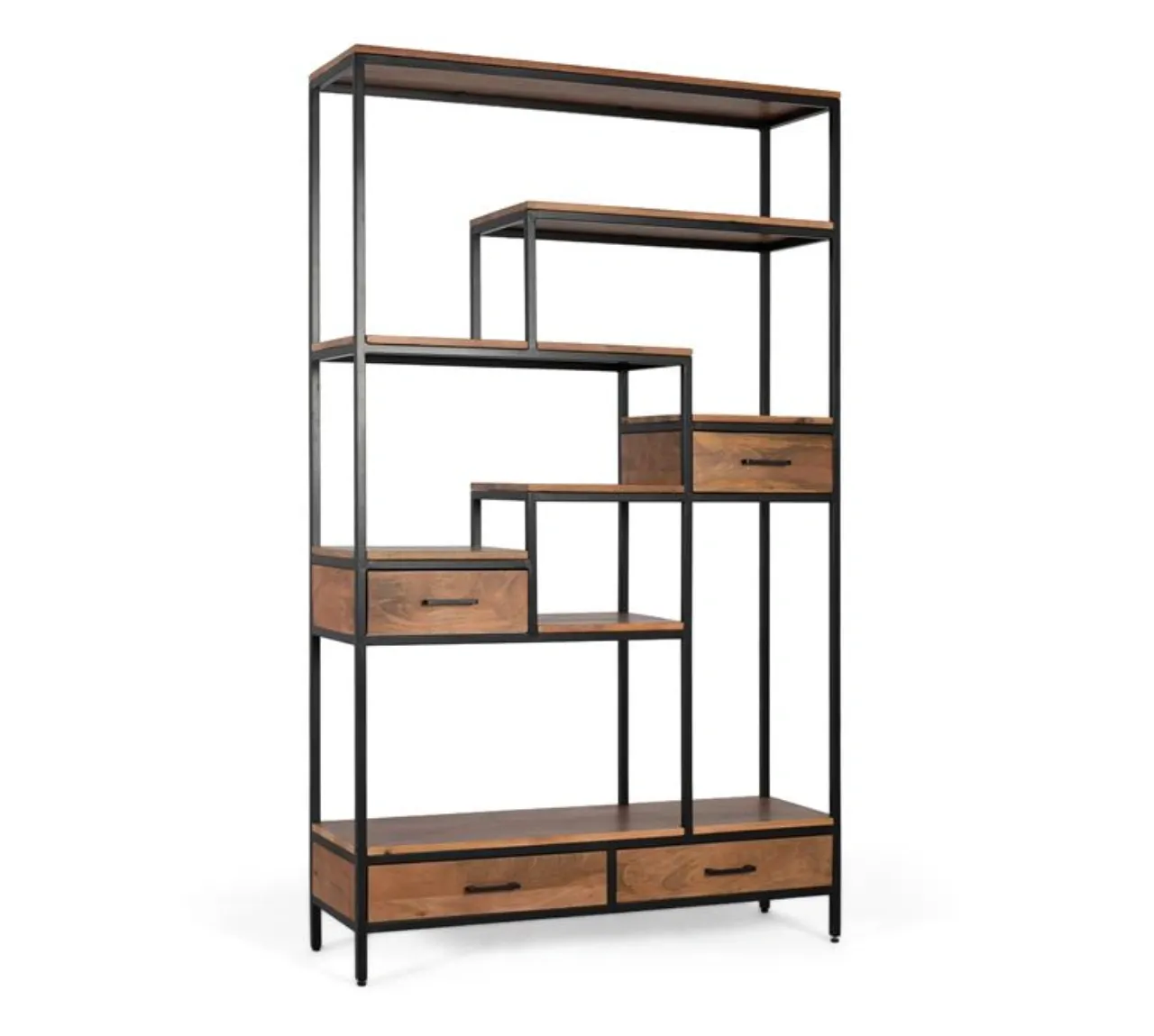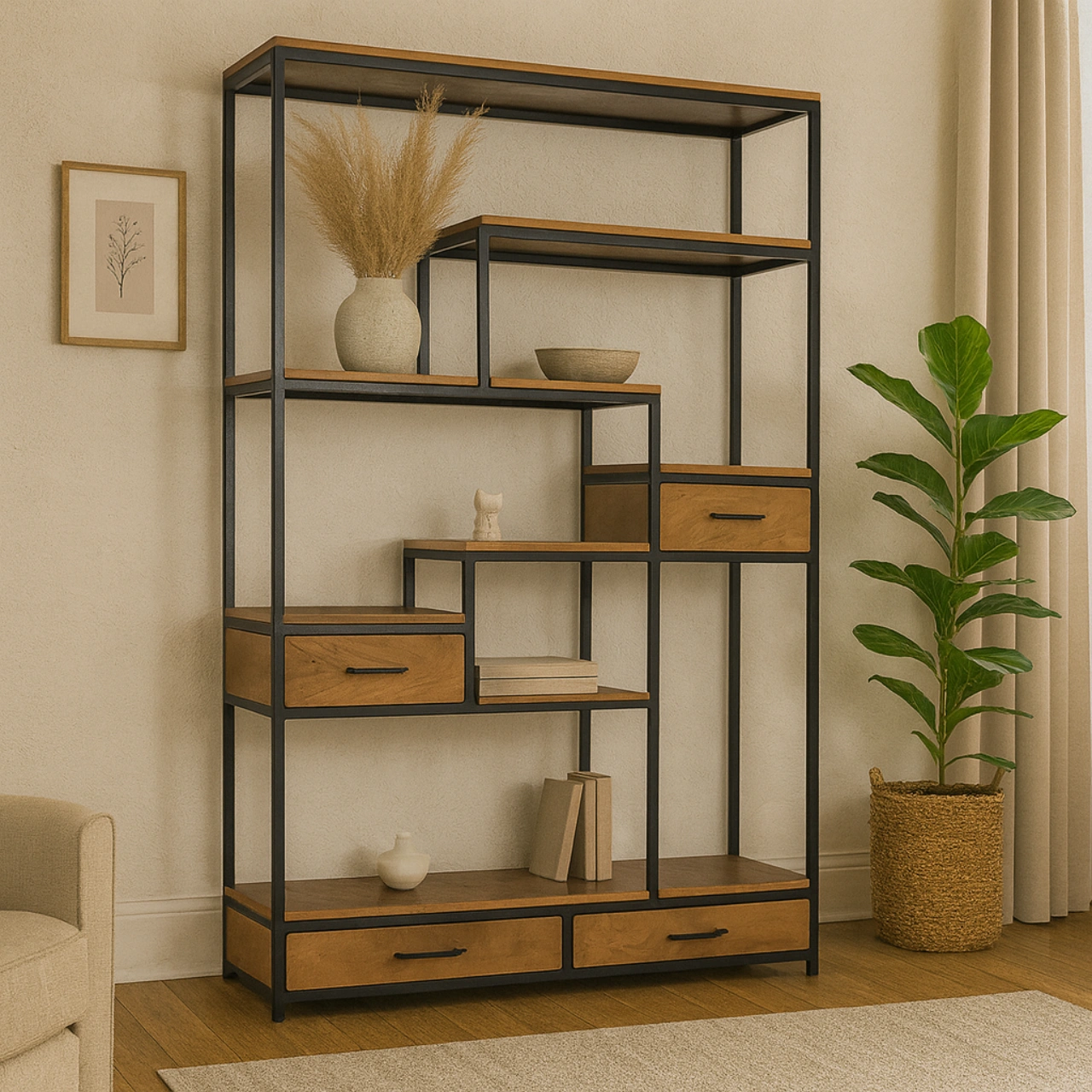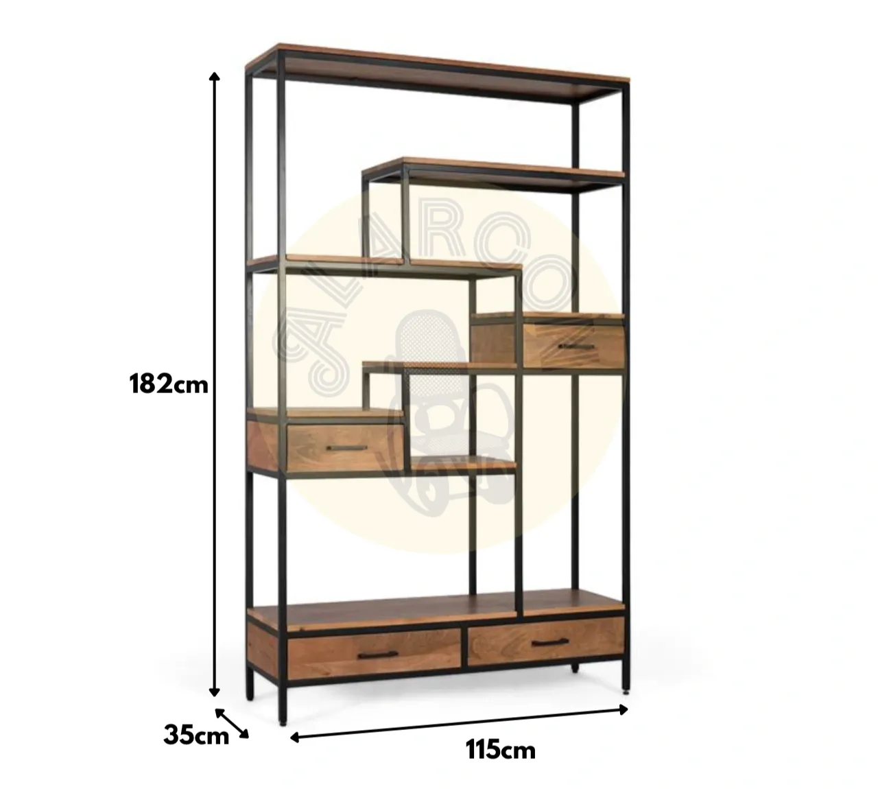 Los estantes en madera de mango, con su acabado natural y vetas visibles, añaden un contraste orgánico que refuerza la personalidad del diseño. Además, incorpora cuatro cajones distribuidos en distintos niveles, perfectos para mantener orden y optimizar el almacenamiento de pequeños objetos.