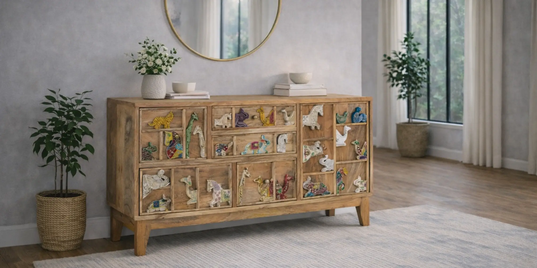 Si te inclinas por el estilo industrial, nuestras cómodas y cajoneras de hierro y madera reciclada te proporcionan una apariencia vanguardista y moderna, perfecta para complementar espacios urbanos y sofisticados. Por otro lado, si prefieres un ambiente más cálido y acogedor con un toque exótico, te encantarán nuestras opciones de estilo étnico. Realizadas en madera y decoradas con motivos y texturas étnicas, estas piezas aportan una sensación de viaje y aventura a cualquier habitación.