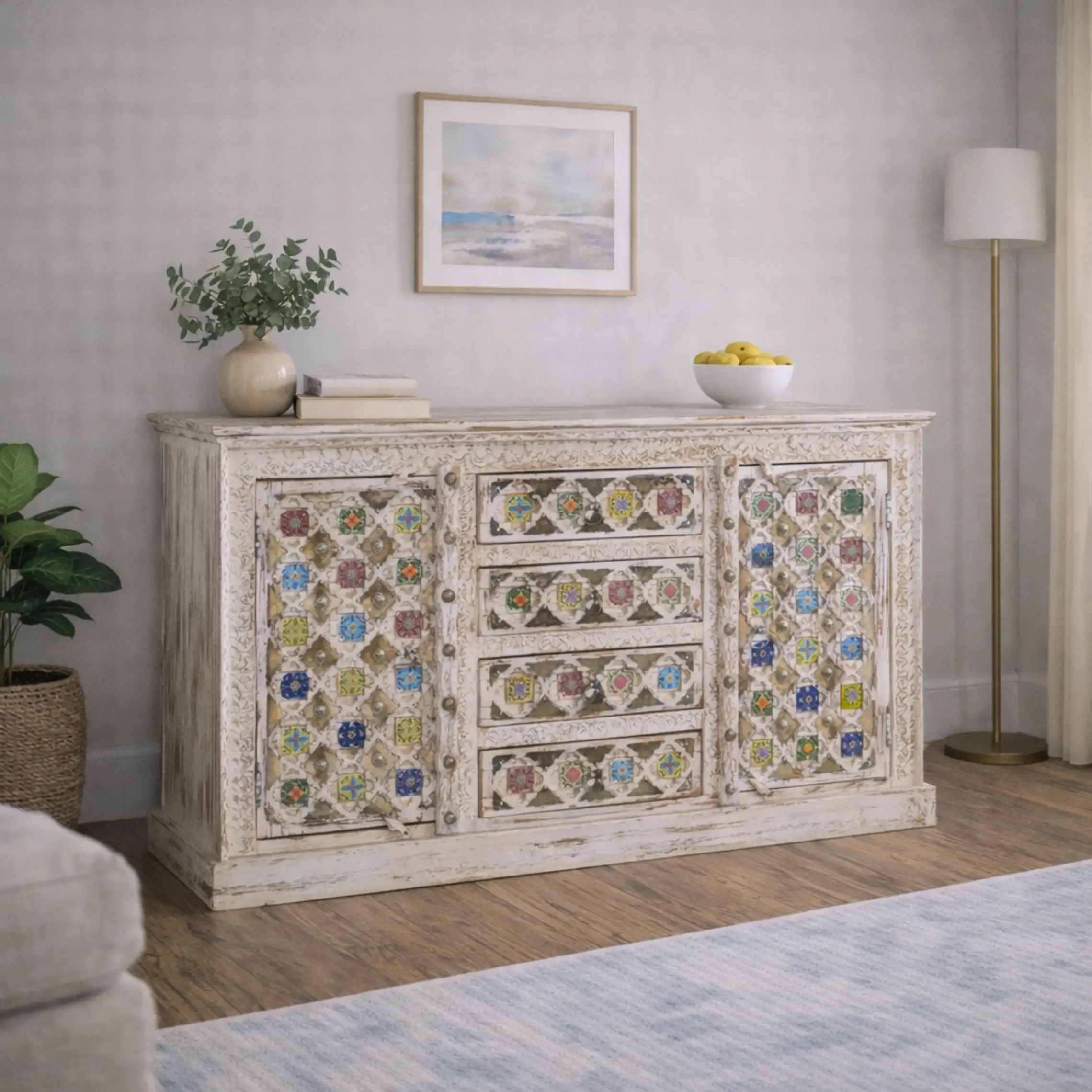 El uso del blanco envejecido como color principal en esta colección le da una luz especial a cualquier ambiente. Este tono desgastado, que imita el paso del tiempo de manera intencionada, aporta esa sensación de hogar cálido y vivido que tanto nos atrae del estilo rústico. Pero lo que realmente destaca en Bakhra es su capacidad para combinar ese fondo blanco con toques multicolor decapados, aplicados de forma sutil y equilibrada.