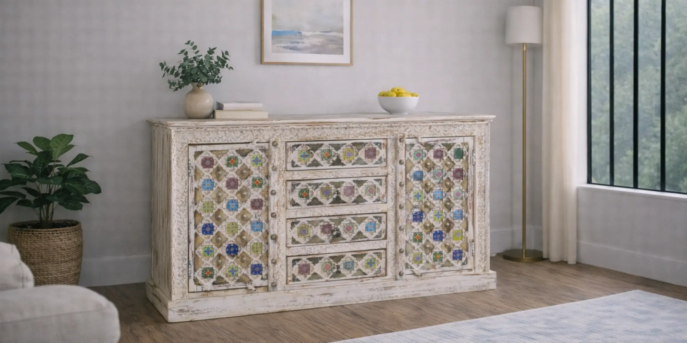 Estos toques multicolor, a menudo en cajones o paneles, le dan a cada mueble una presencia única y alegre, rompiendo la monotonía y aportando dinamismo sin perder la armonía del conjunto. Es una paleta pensada para convivir con elementos de decoración naturales, textiles neutros o incluso estilos más eclécticos. En un comedor, una alacena Bakhra se convierte fácilmente en la pieza protagonista. En una sala, una consola o vitrina de esta colección transforma el ambiente sin necesidad de recargar.