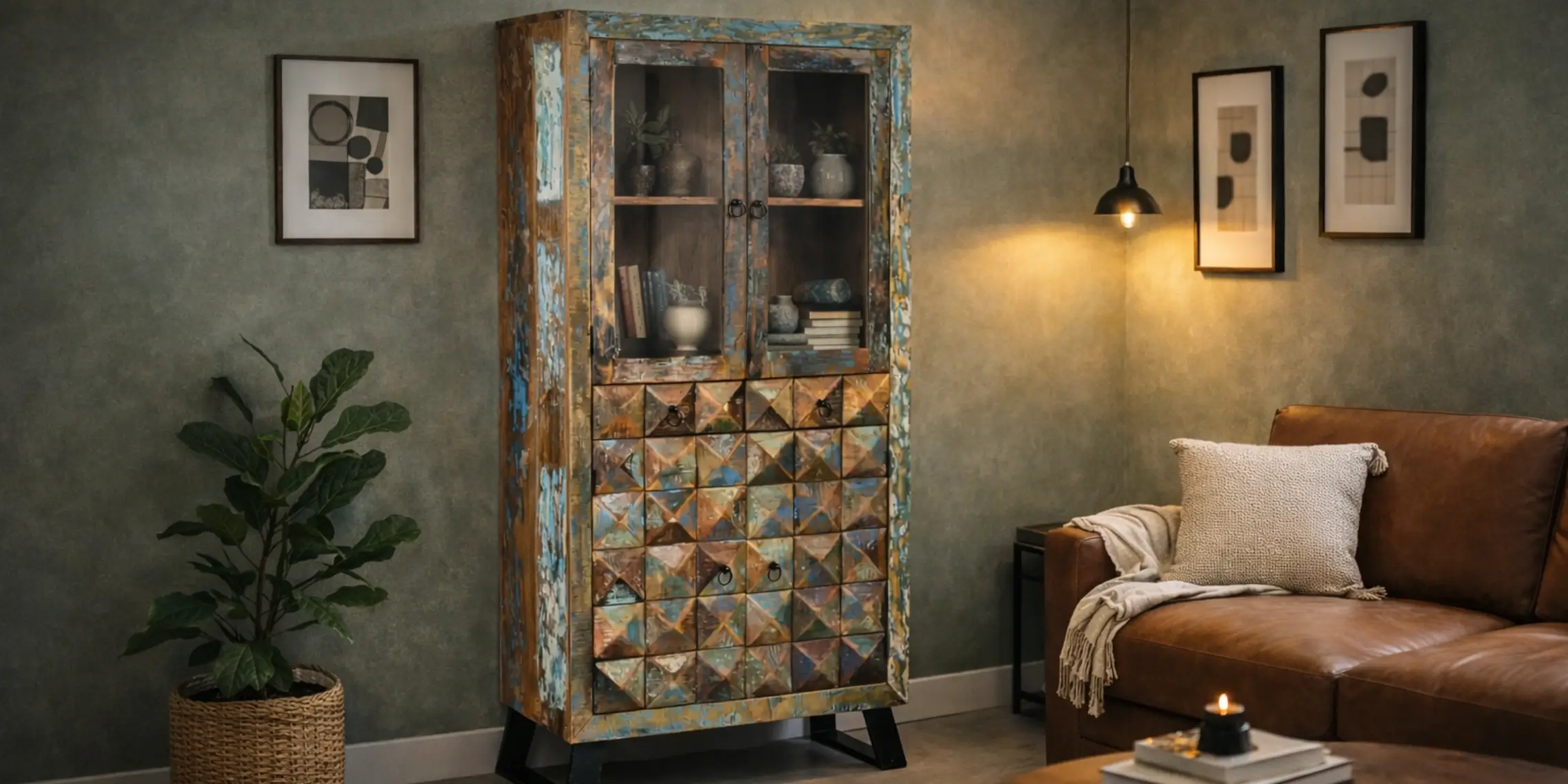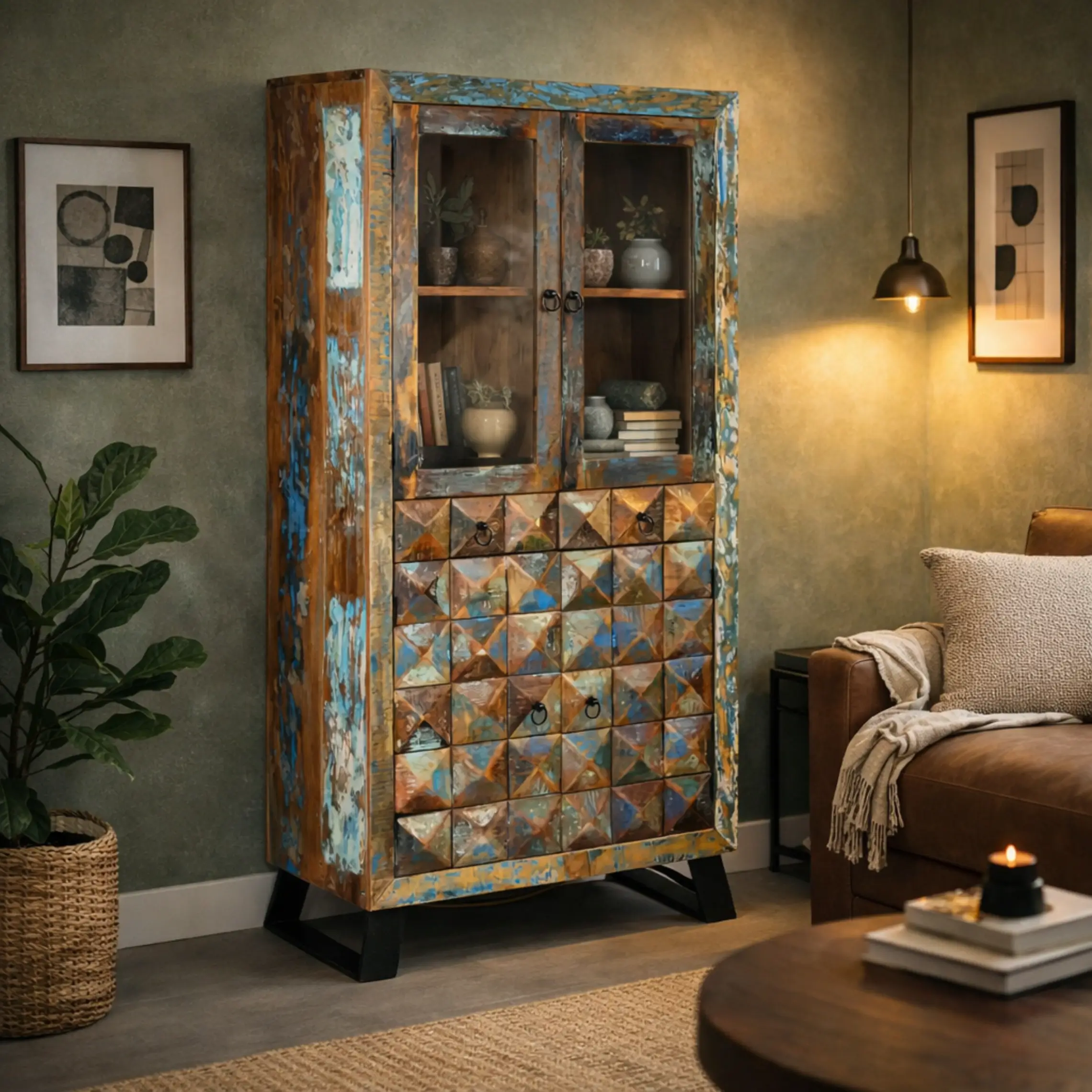Los muebles de diamante reciclado están construidos con madera reutilizada combinada con estructura metálica, lo que garantiza solidez y durabilidad. Esta mezcla ofrece un resultado estético potente: la madera aporta calidez y variedad visual, mientras que el metal añade resistencia y un toque industrial muy marcado.