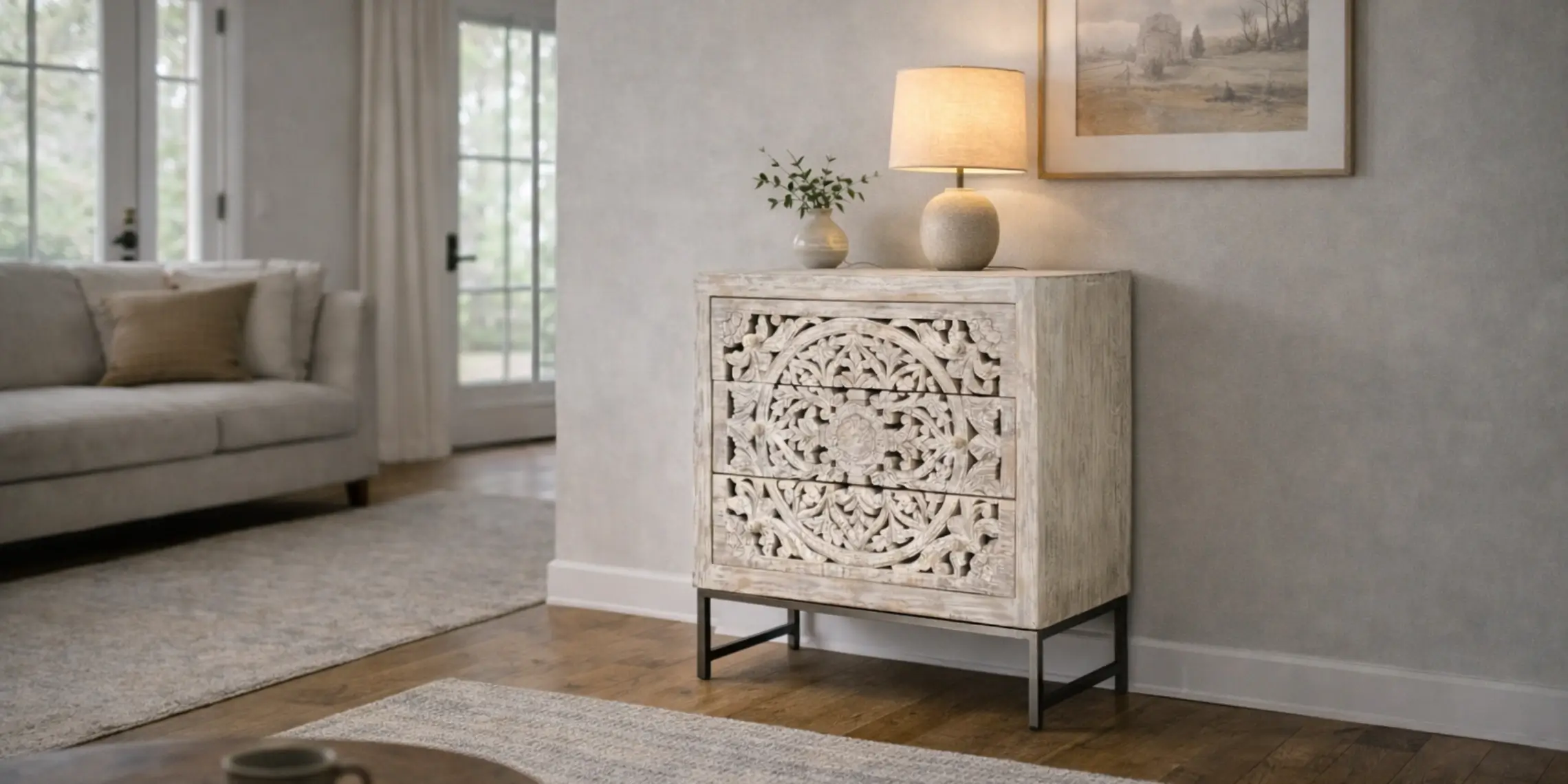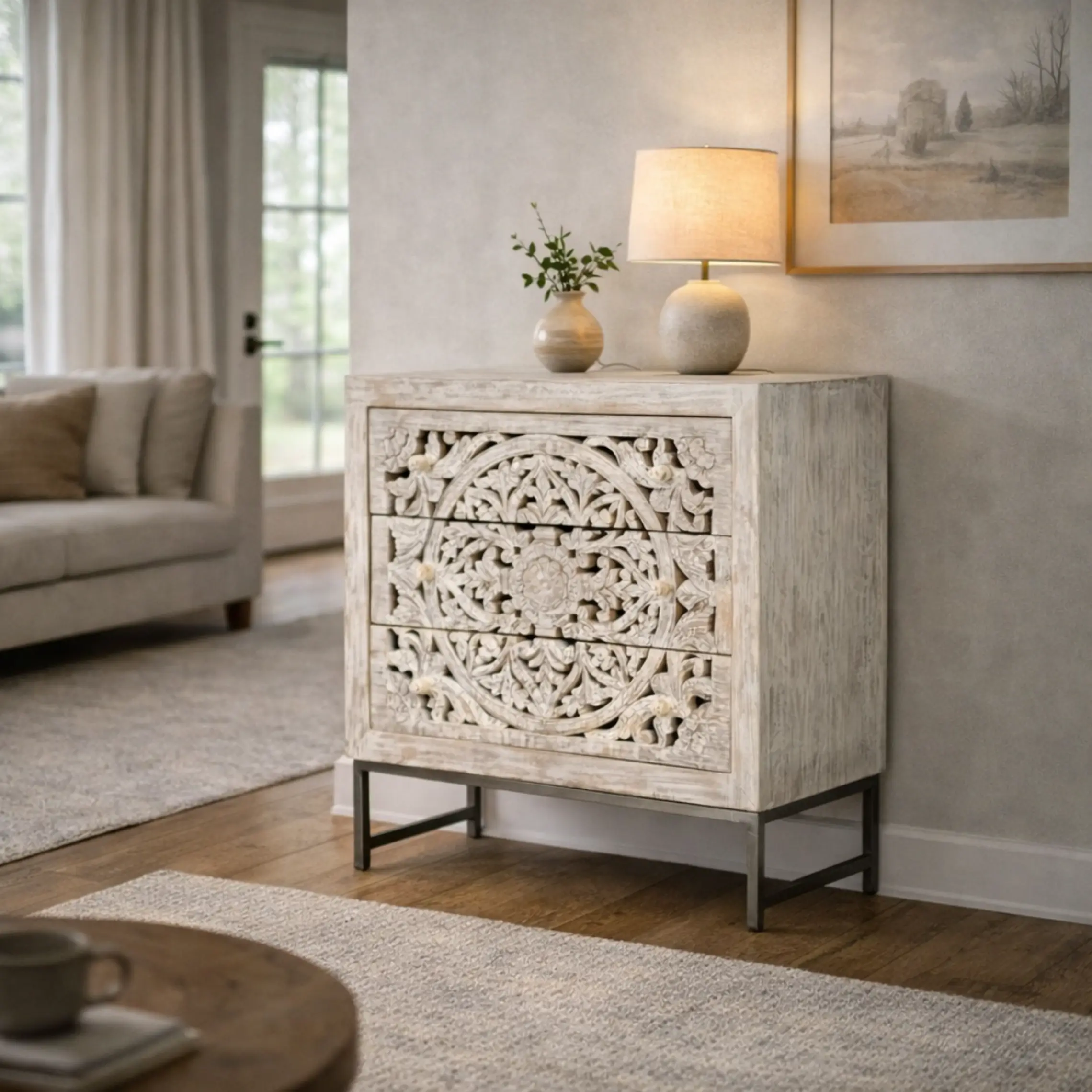 Cada pieza de la colección Mykonos es fabricada artesanalmente en India, donde los talleres combinan carpintería tradicional con técnicas modernas de acabado.
