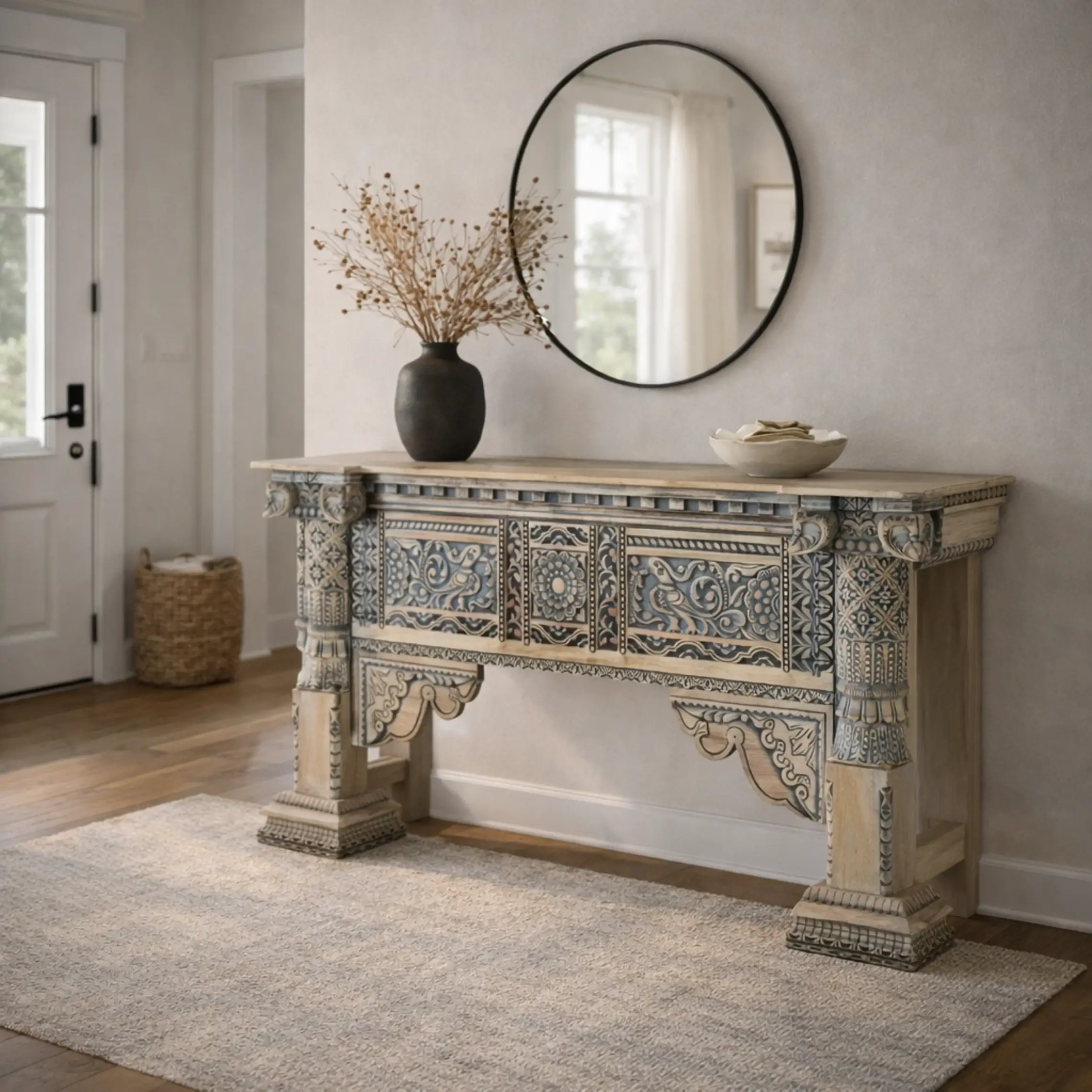 Cada mueble de la colección Nashik se elabora de forma artesanal en India, donde la experiencia de los ebanistas garantiza acabados impecables y una atención minuciosa a cada detalle.