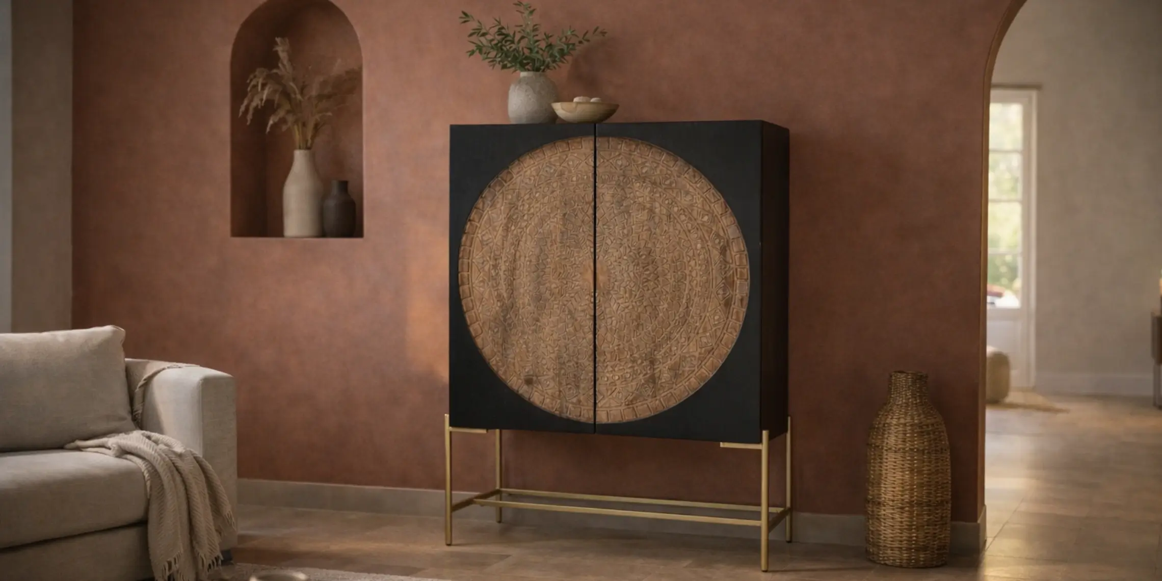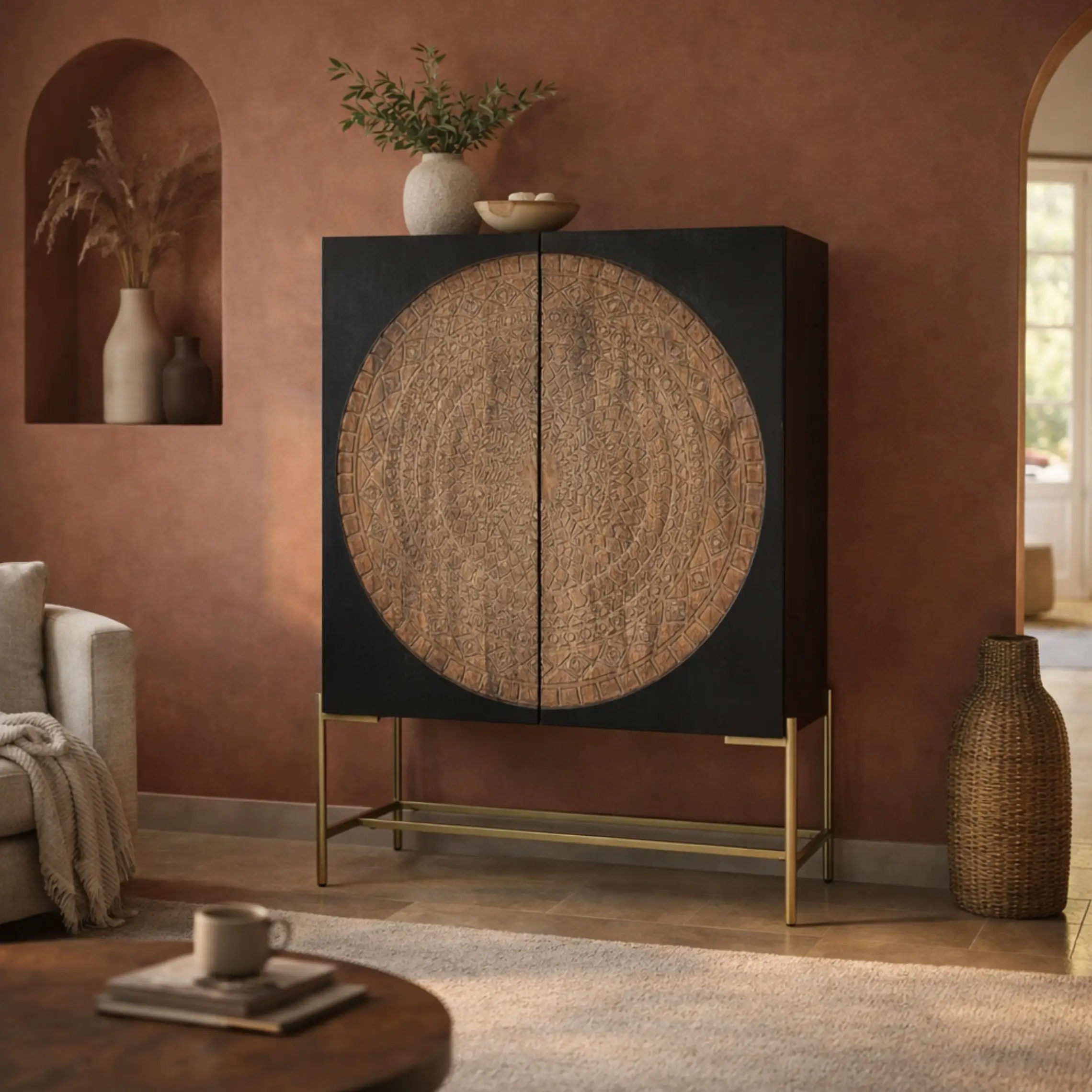 El nogal oscuro de la madera maciza de mango aporta profundidad y un toque clásico, mientras que el dorado de los detalles metálicos introduce luminosidad y sofisticación.