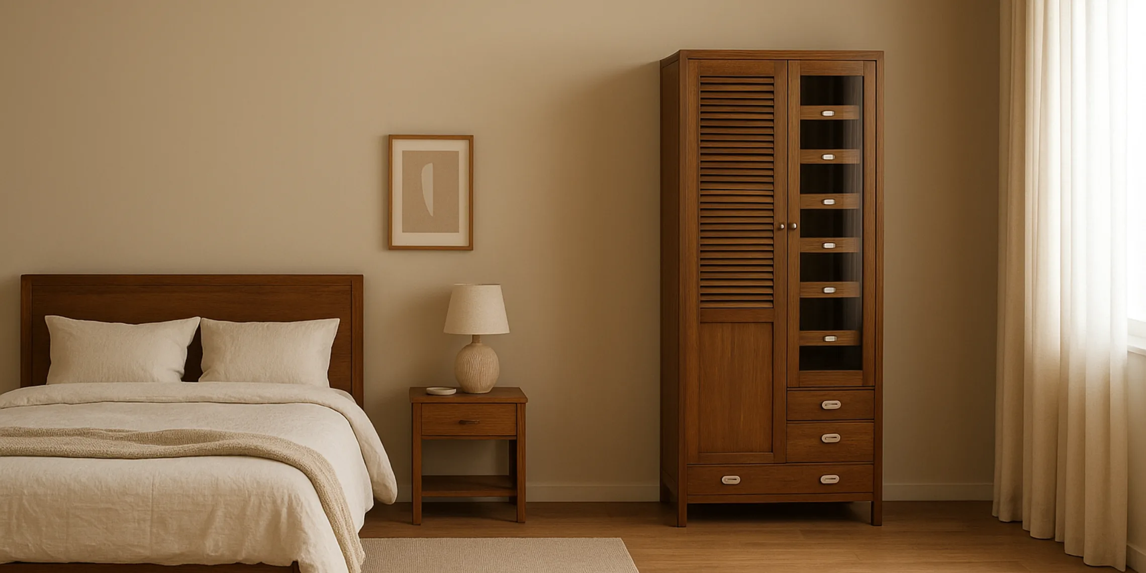 El acabado en color teka es el sello distintivo de esta colección. Se trata de un tono cálido, natural y acogedor que resalta las vetas de la madera de mindi y aporta una sensación de confort inmediato a cualquier ambiente.