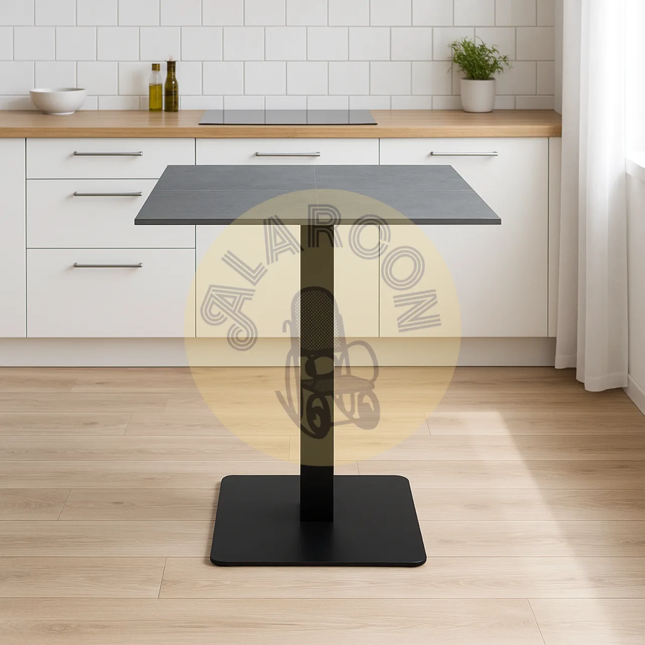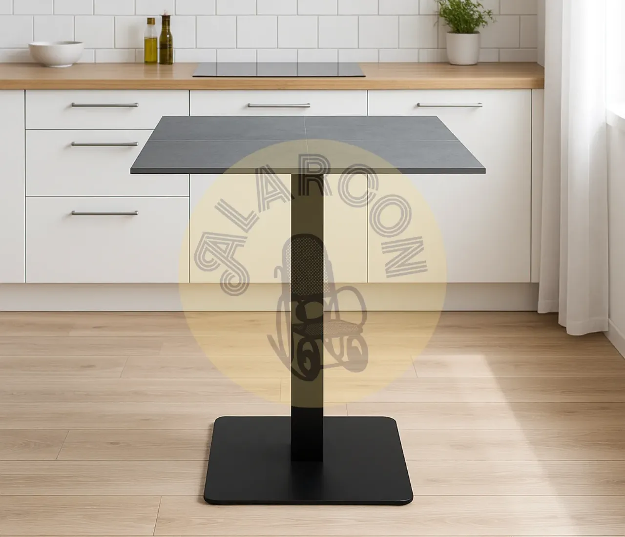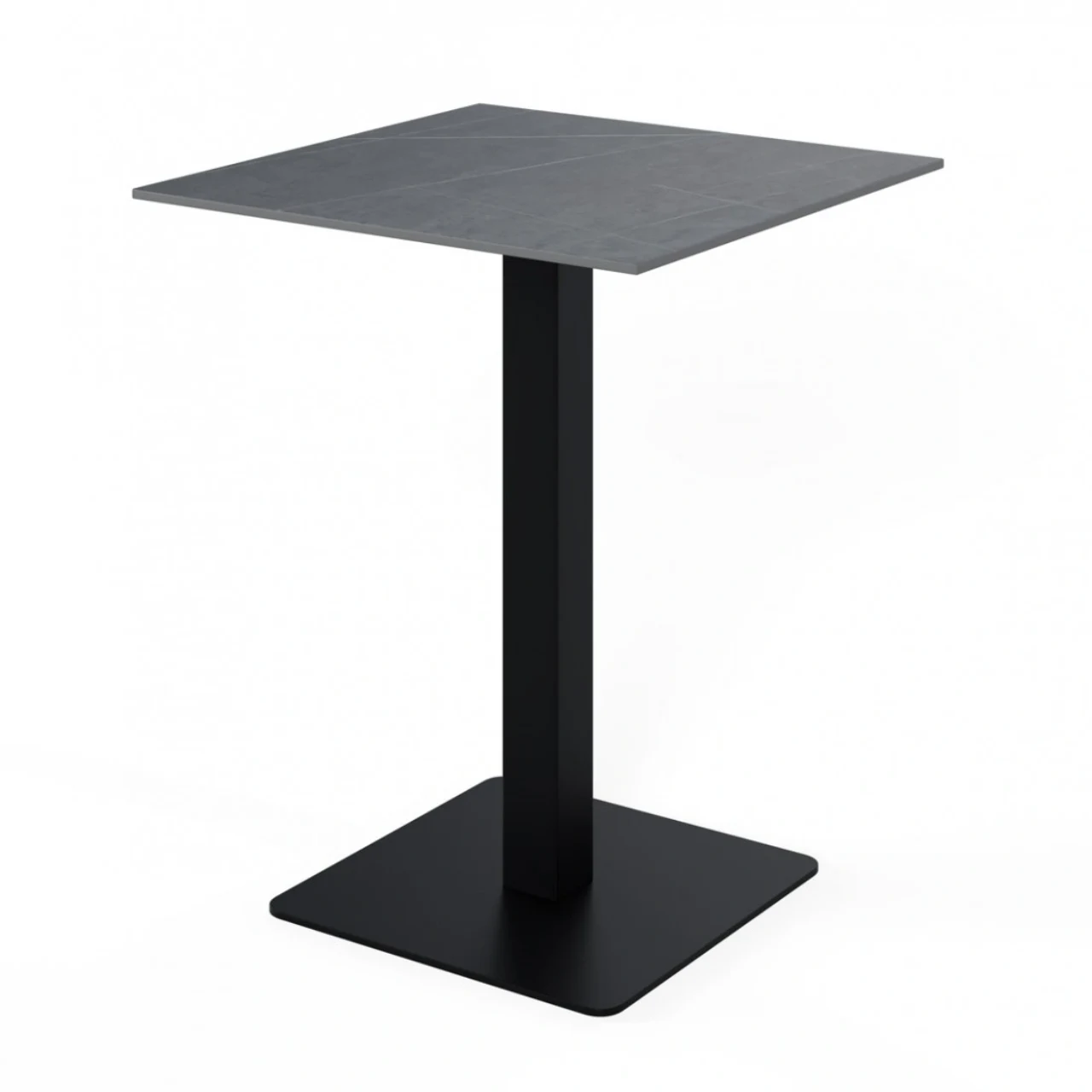 Diseñada para espacios contemporáneos, esta mesa alta cuadrada combina una tapa de porcelánico resistente con una estructura metálica robusta, ofreciendo un estilo moderno y funcional. Su acabado sobrio y su forma compacta permiten integrarla fácilmente en cocinas, terrazas o zonas de reunión.