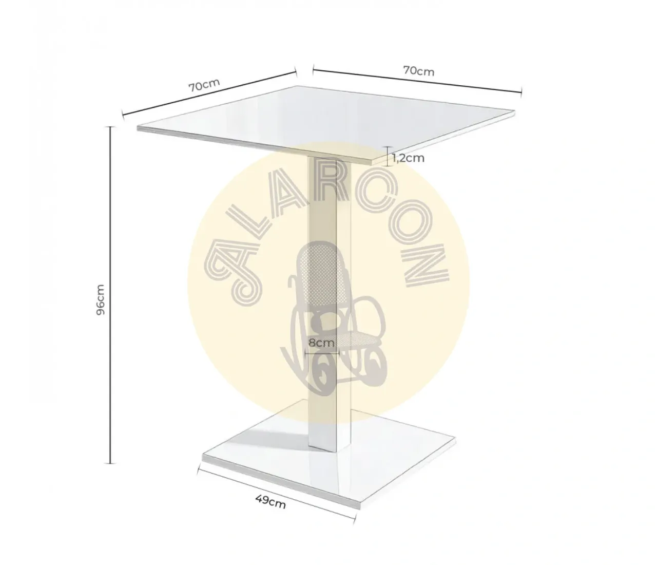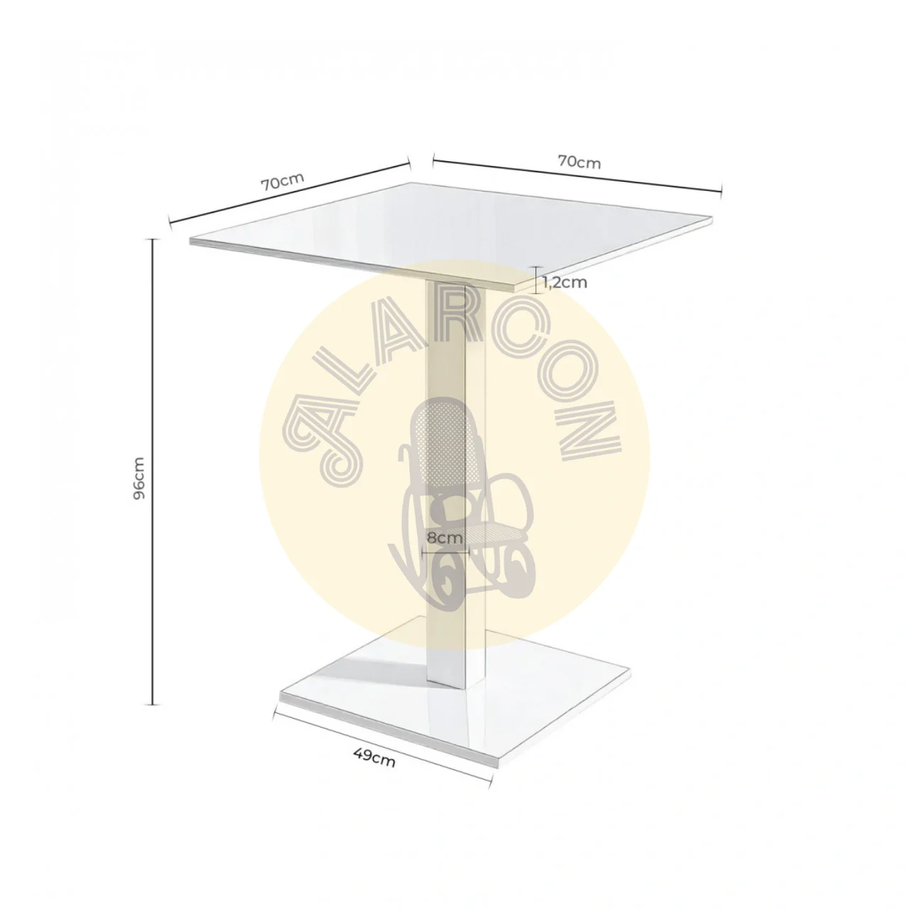 Con medidas de 70x70x96 cm, esta mesa proporciona la altura ideal para un uso cómodo tanto en interiores como en exteriores cubiertos. La base metálica de 40×40 cm garantiza estabilidad y durabilidad incluso con un uso frecuente.