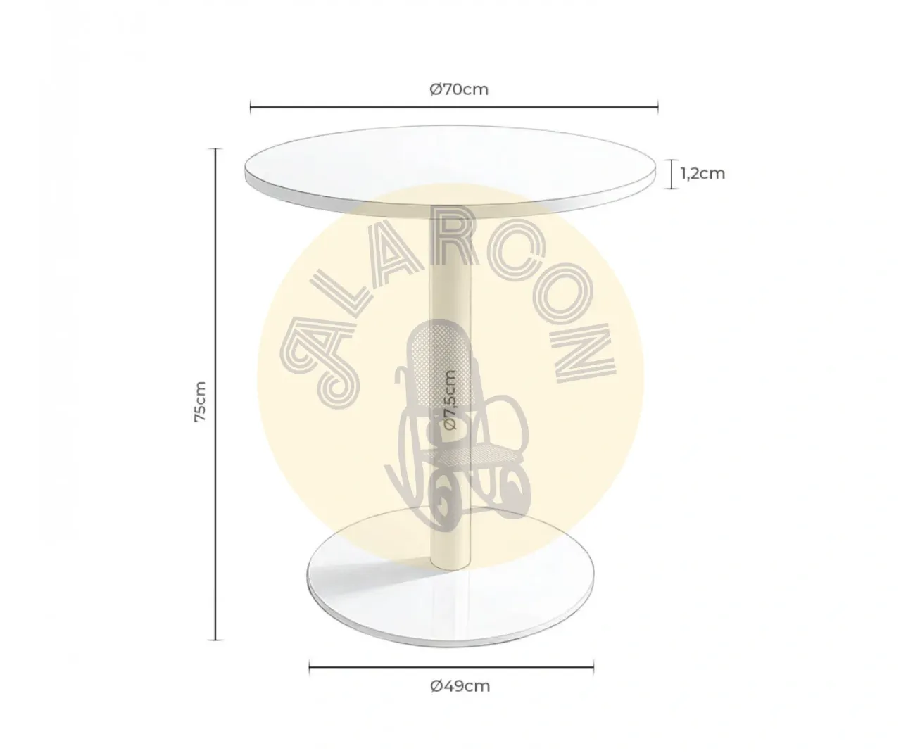 Con un diámetro de Ø70 cm, una altura de 96 cm y una base de Ø49 cm, esta mesa destaca por su proporción equilibrada y su capacidad para integrarse fácilmente en diferentes ambientes.