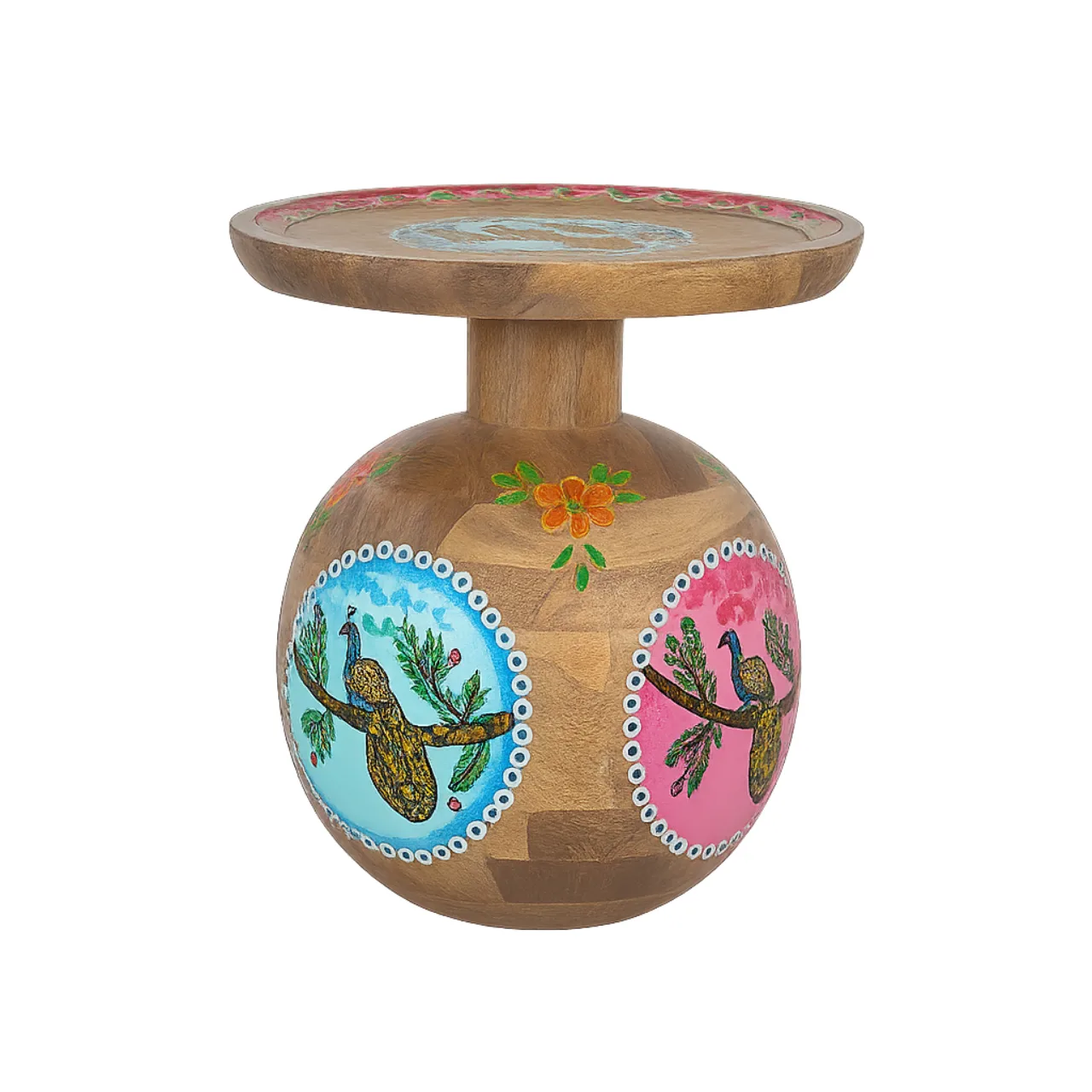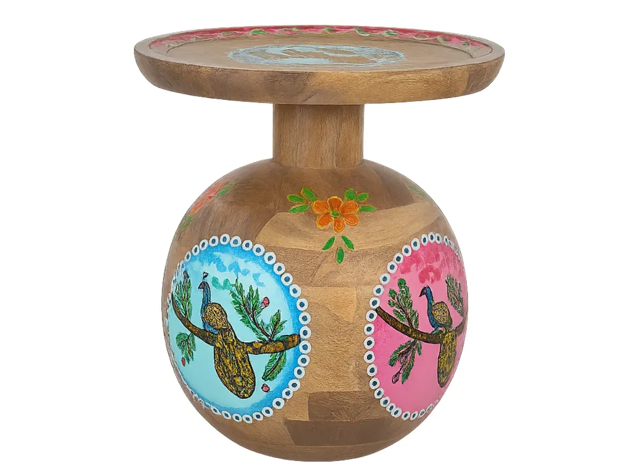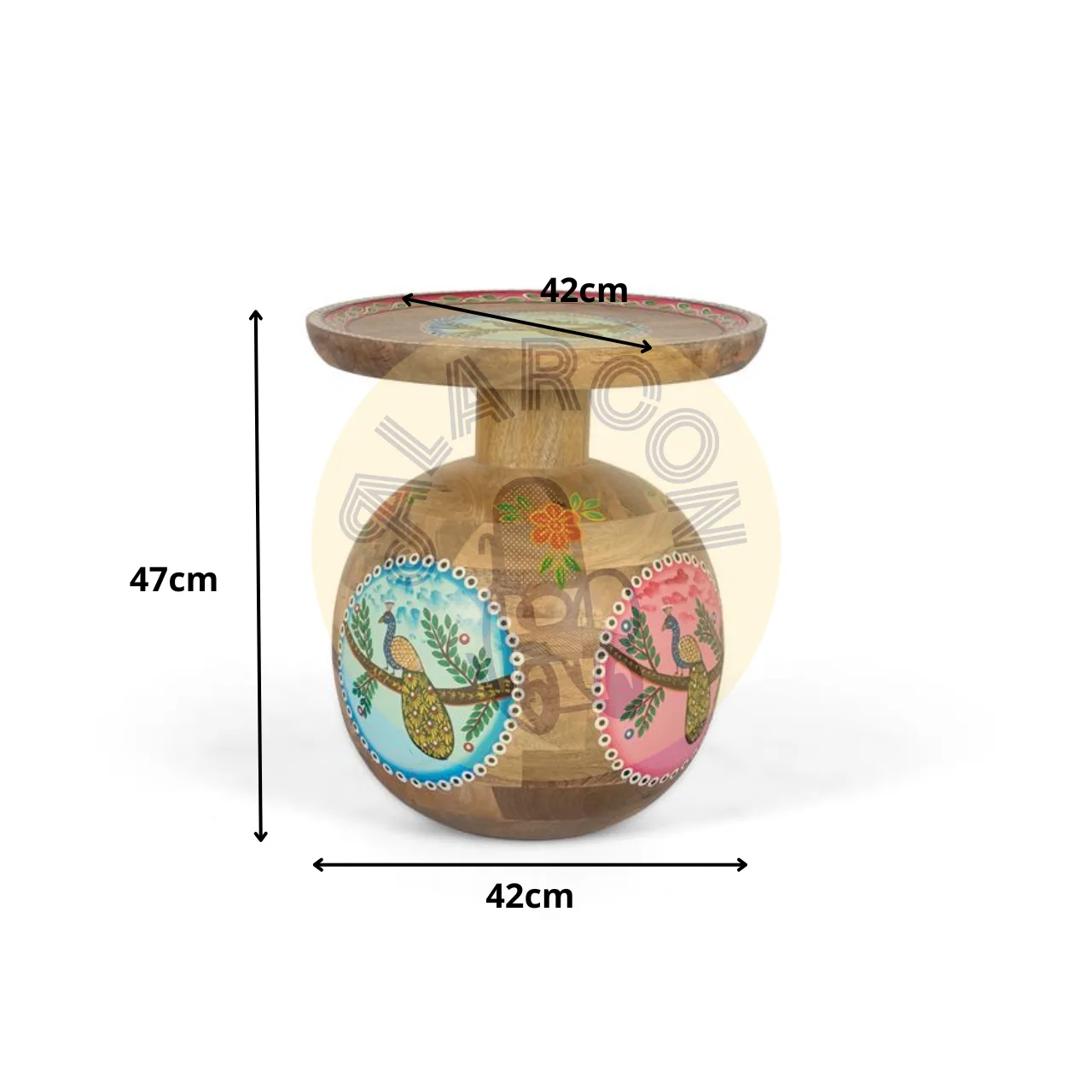 Su base voluminosa y su tablero circular de 42×42 cm con una altura de 47 cm la convierten en una pieza práctica como mesa lateral o decorativa. Cada detalle está cuidadosamente pintado a mano con colores vivos que resaltan su carácter bohemio y artesanal.