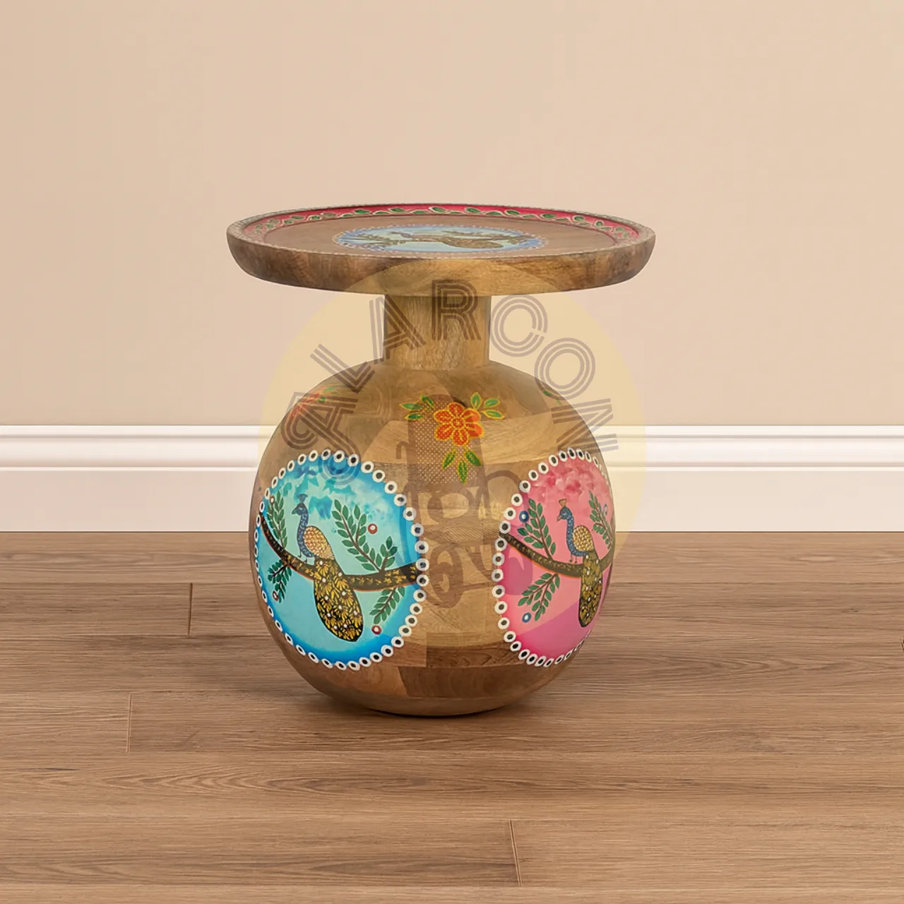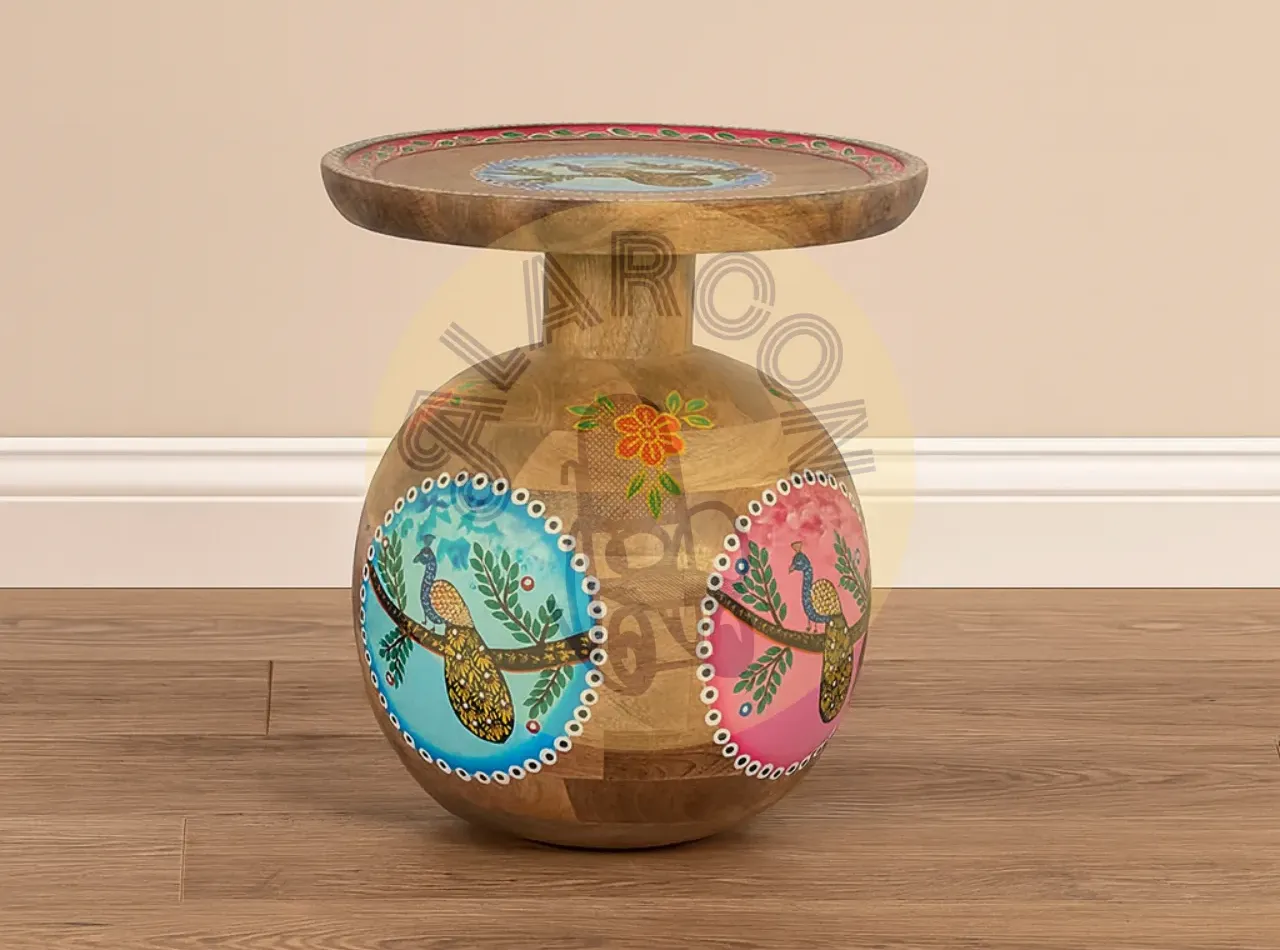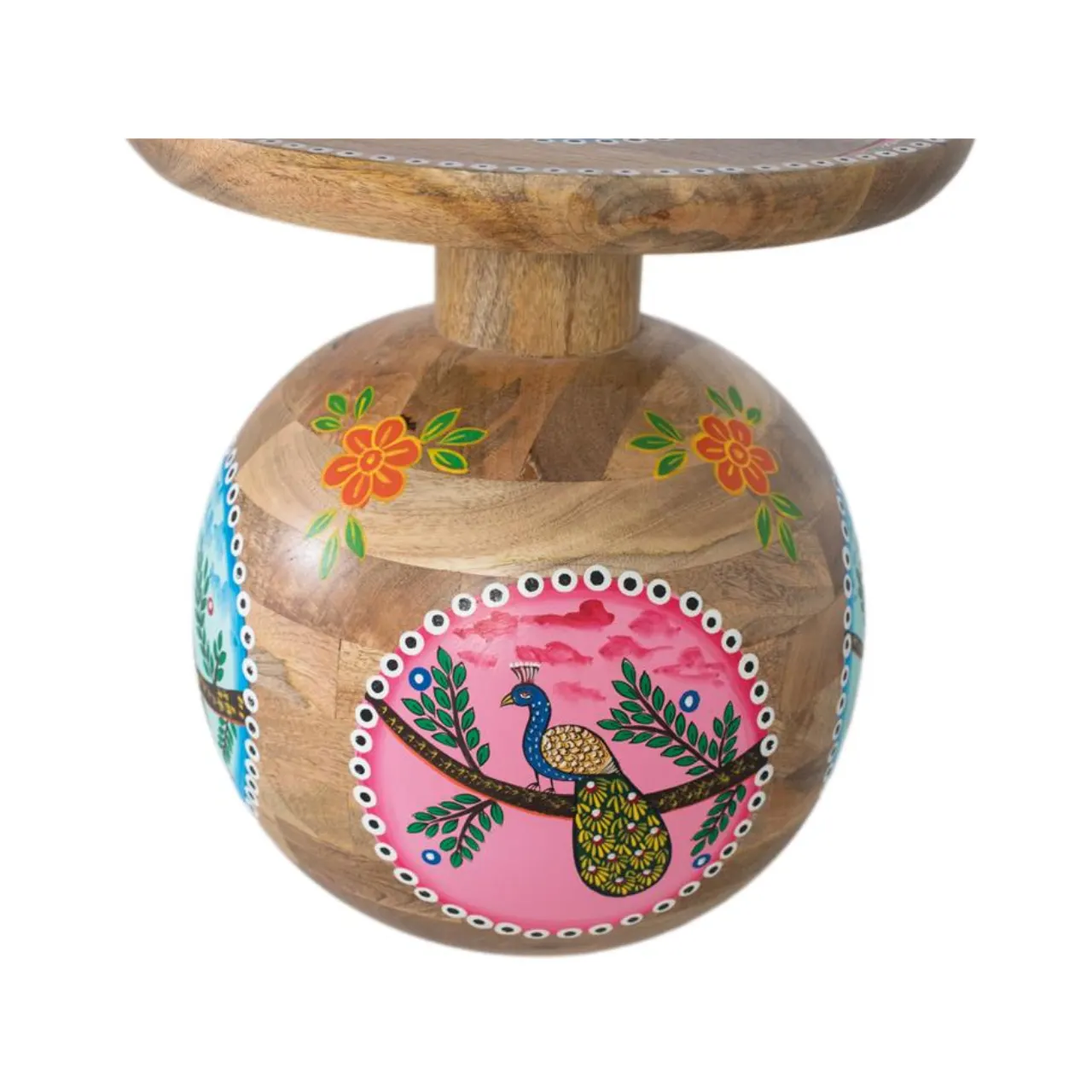 Su base voluminosa y su tablero circular de 42×42 cm con una altura de 47 cm la convierten en una pieza práctica como mesa lateral o decorativa. Cada detalle está cuidadosamente pintado a mano con colores vivos que resaltan su carácter bohemio y artesanal.