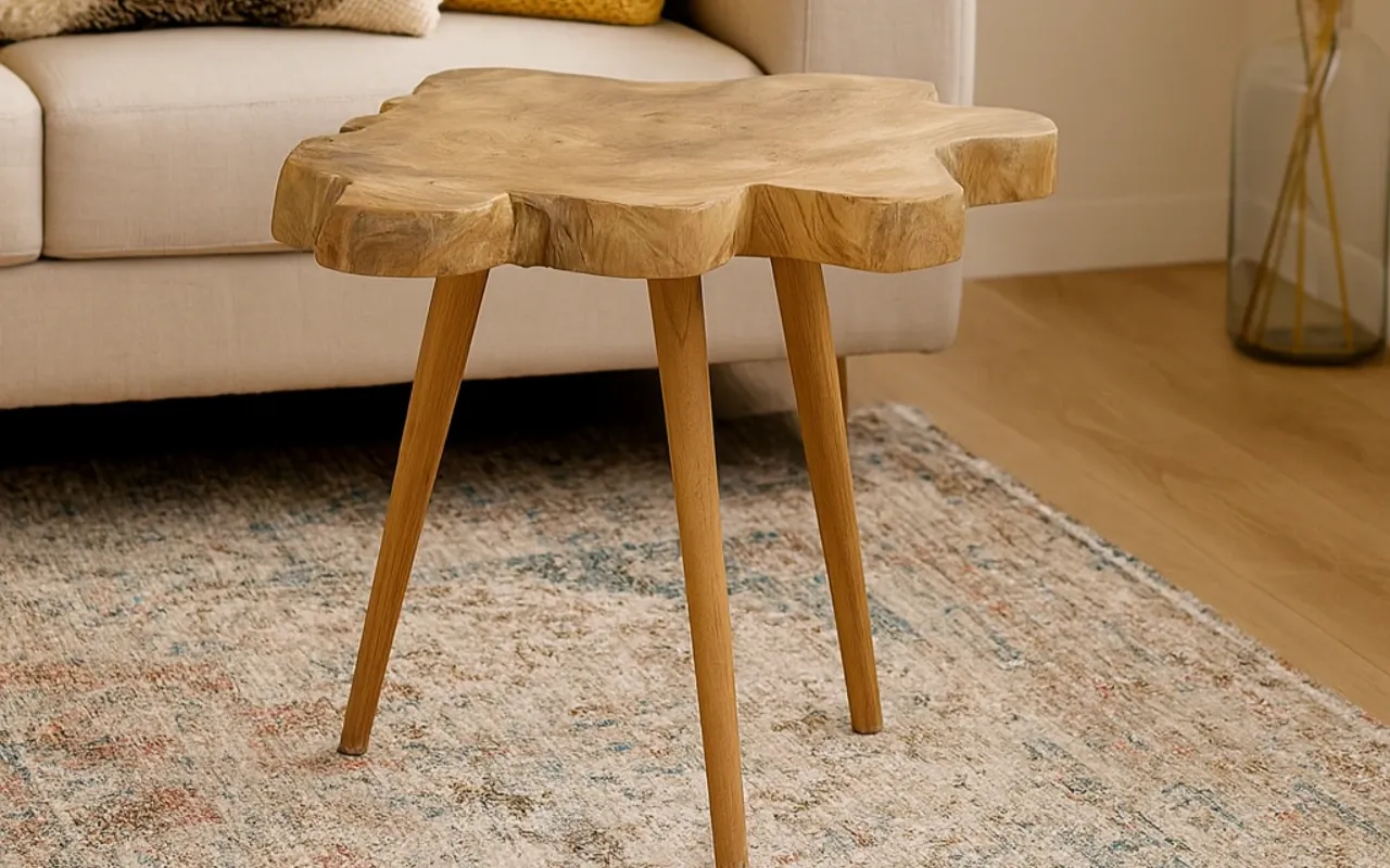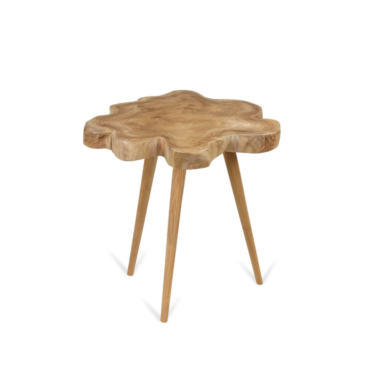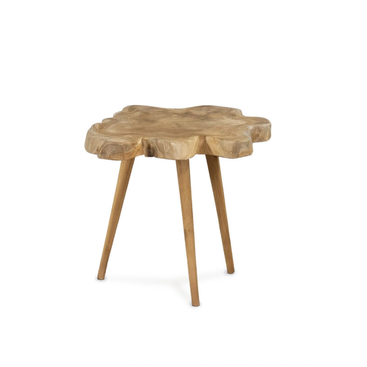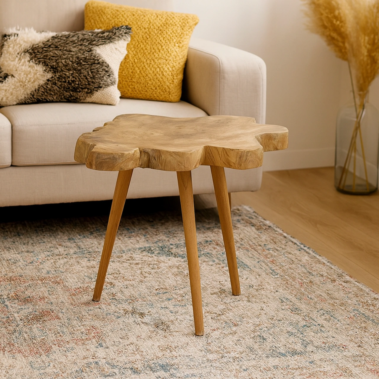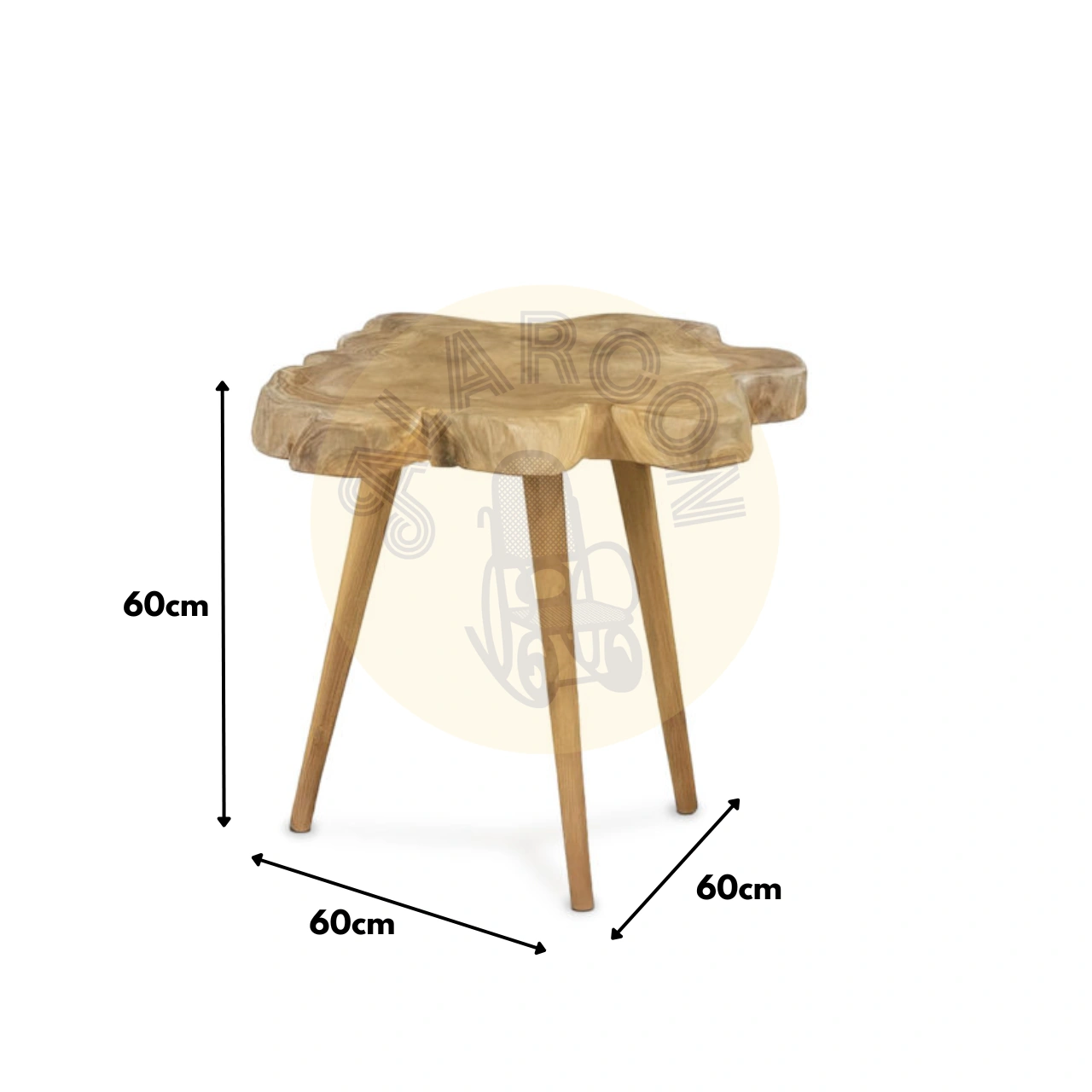 Potencia la identidad del espacio con esta mesa auxiliar de madera de teca, una pieza de carácter natural que destaca por su forma irregular, su textura orgánica y la autenticidad de un trabajo artesanal. Cada unidad es única, ofreciendo un aspecto distintivo ideal para interiores con personalidad.