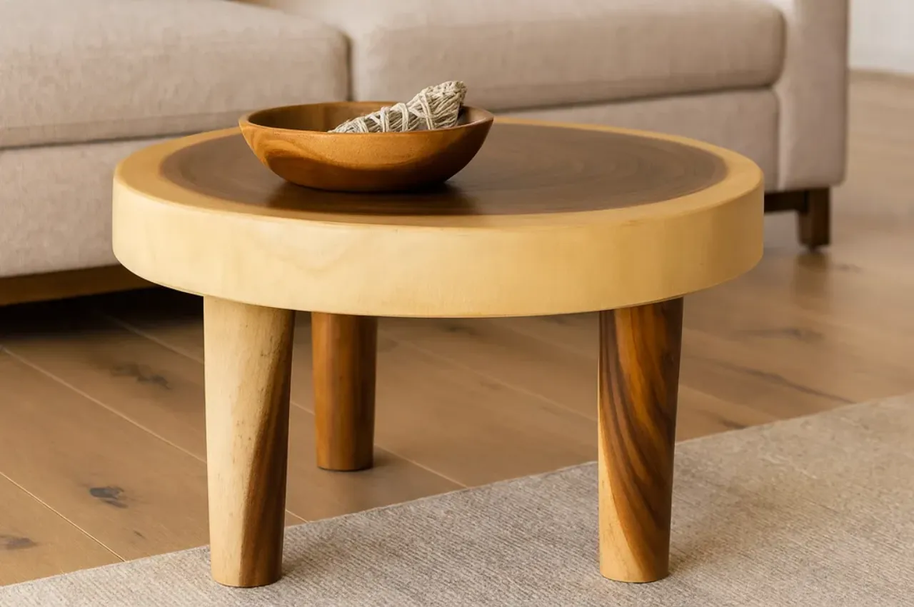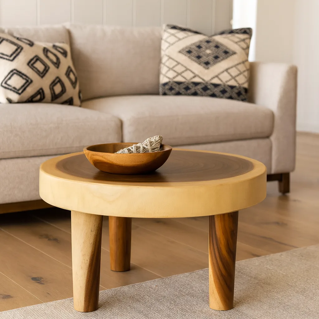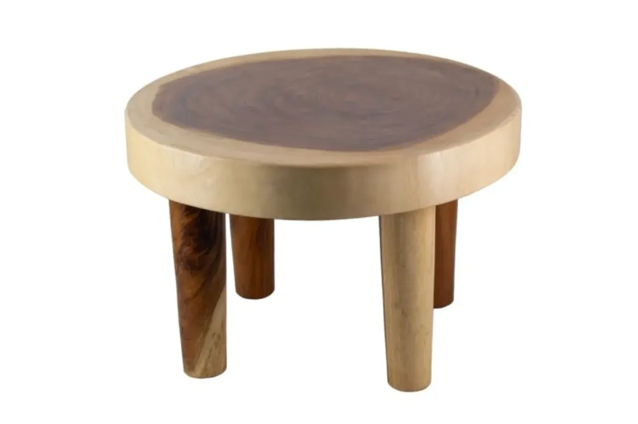 La mesa de centro Suar está fabricada en madera natural, destacando por su resistencia y un diseño artesanal que aporta calidez y autenticidad a cualquier espacio del hogar.