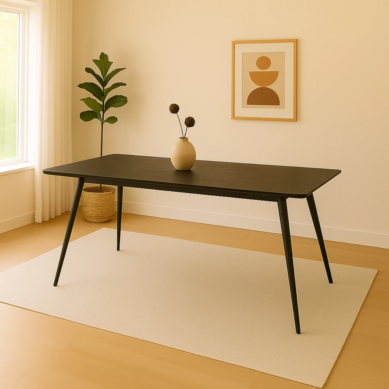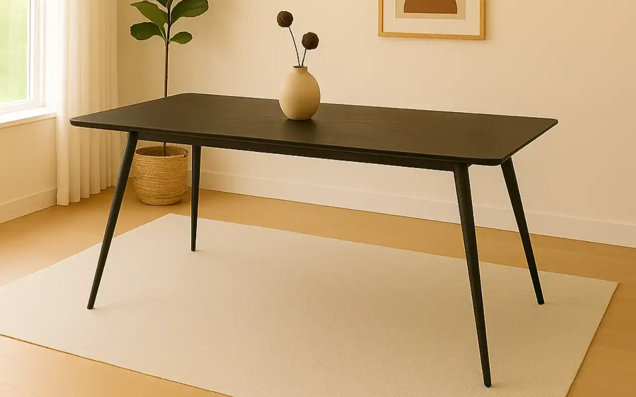 Las patas de hierro pintadas en negro, delgadas y ligeramente inclinadas, refuerzan la estabilidad del conjunto sin sobrecargar el espacio visual. Las esquinas redondeadas suavizan el diseño y contribuyen a una estética limpia y cuidada.