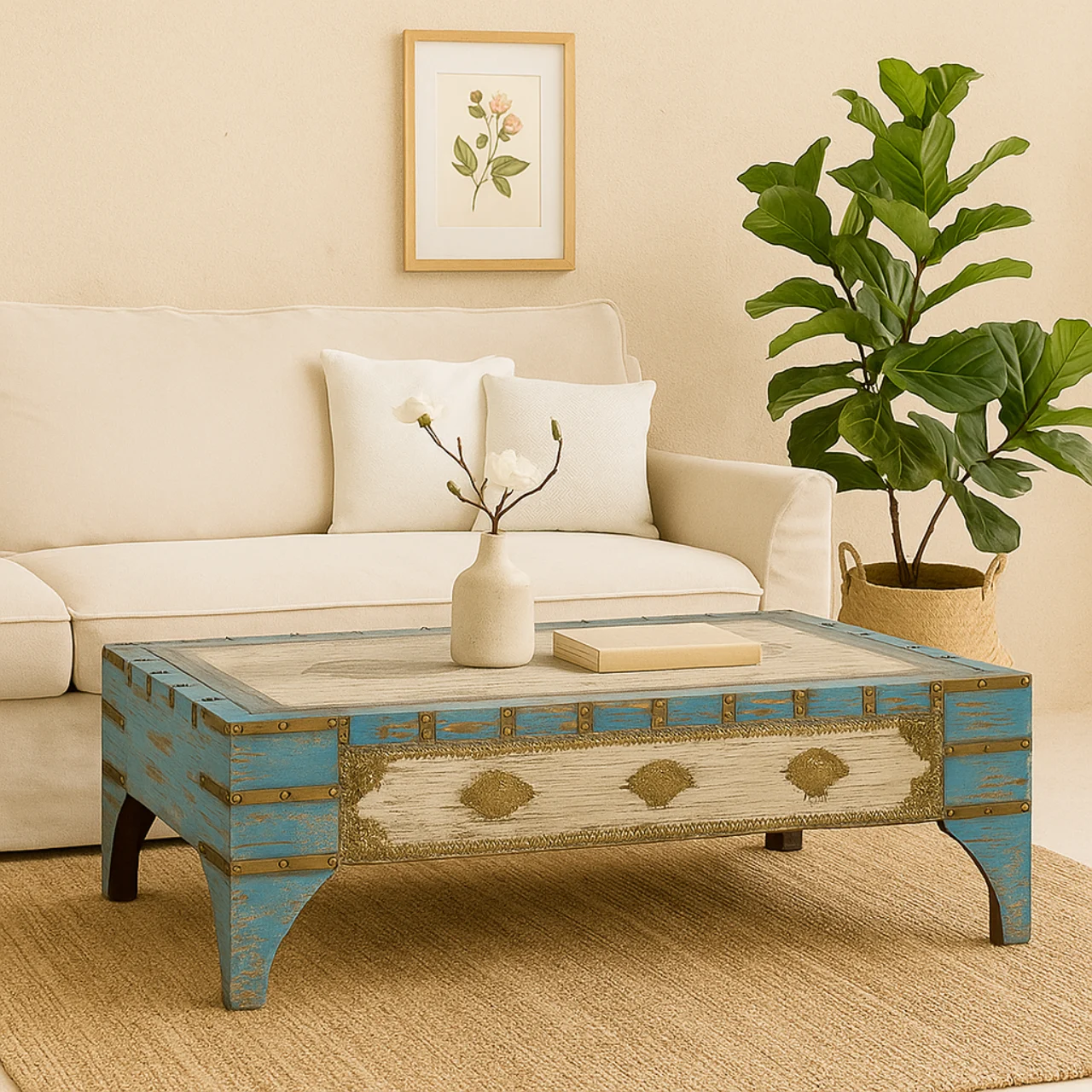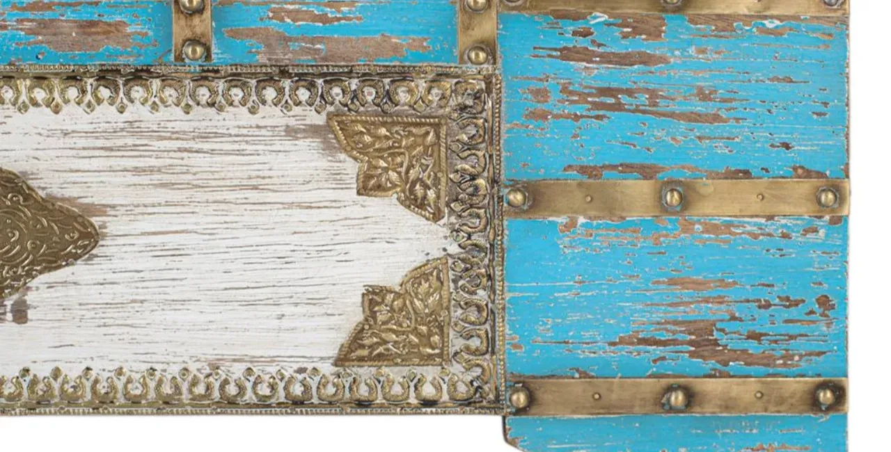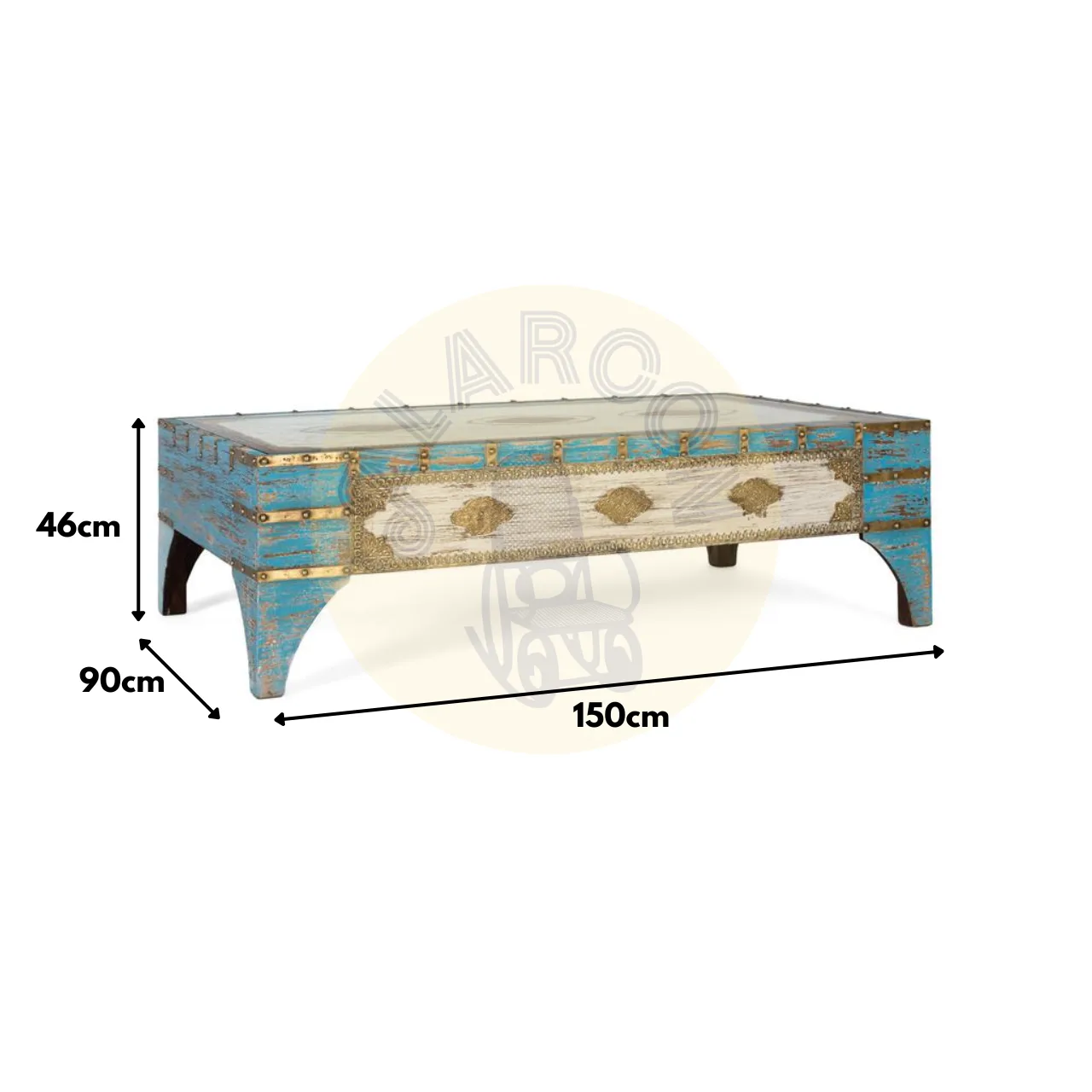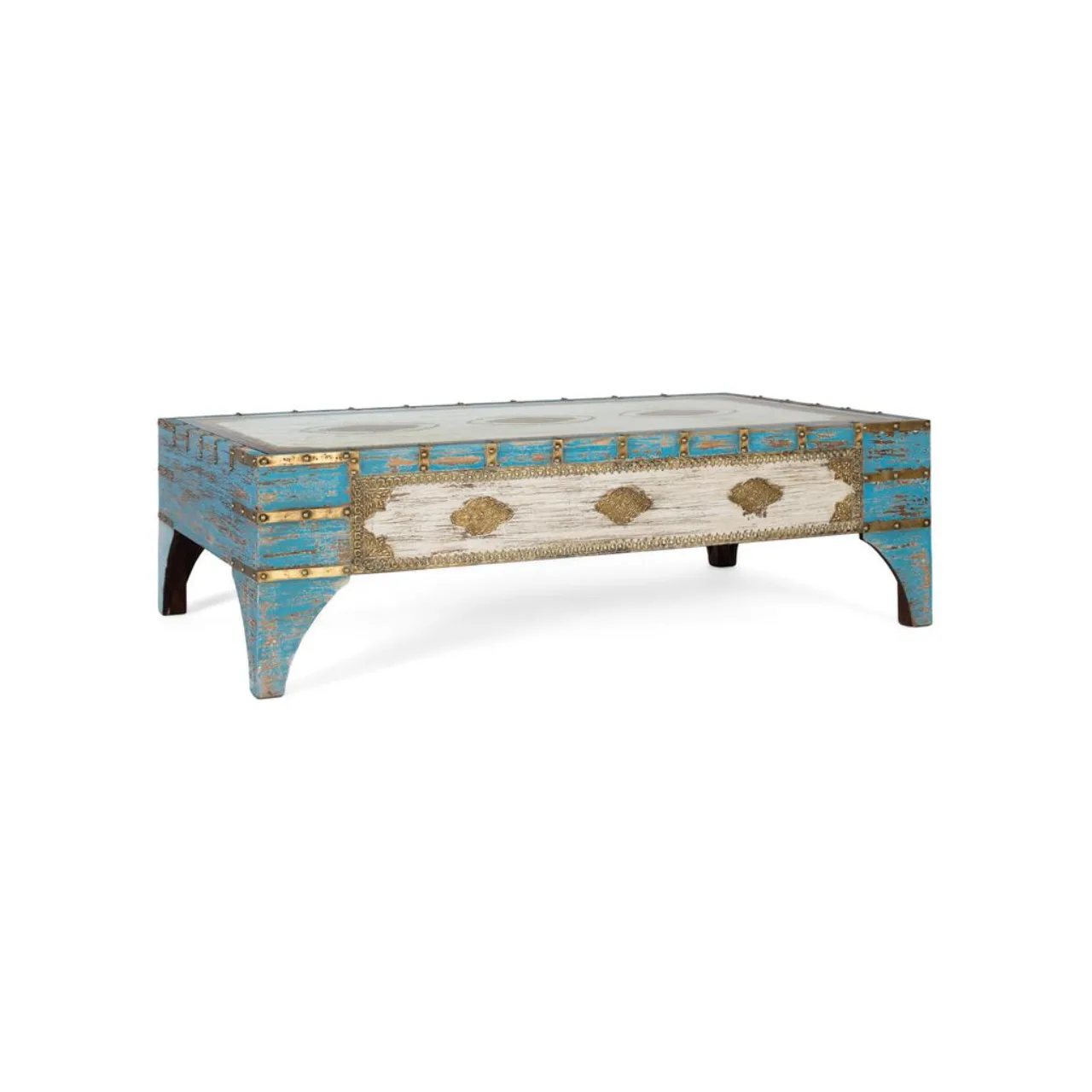 La mesa de centro de madera de mango destaca por su diseño artesanal de estilo rústico y vintage, con un acabado en azul y blanco envejecido que aporta un aire bohemio y auténtico. Su estética desgastada y los detalles troquelados en latón realzan su carácter exótico y decorativo.