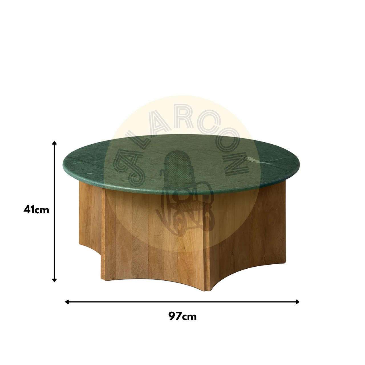 El sobre de mármol verde de 2 cm de grosor aporta textura y personalidad única, ya que cada pieza presenta vetas exclusivas que realzan su carácter natural. Su estructura de madera maciza asegura resistencia y estabilidad sin renunciar a un acabado refinado.