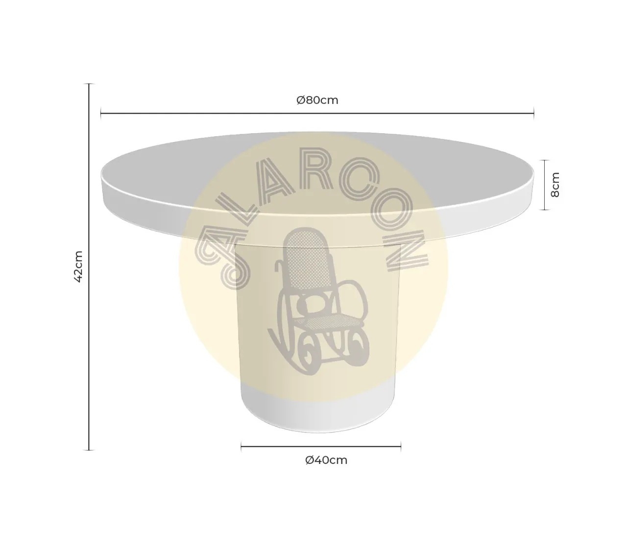 Sus dimensiones de Ø80 cm de ancho y 42 cm de alto ofrecen una superficie amplia y estable para decorar o compartir momentos cómodamente. El cemento reforzado con fibra de vidrio asegura ligereza sin renunciar a la firmeza, ideal para un uso cotidiano.