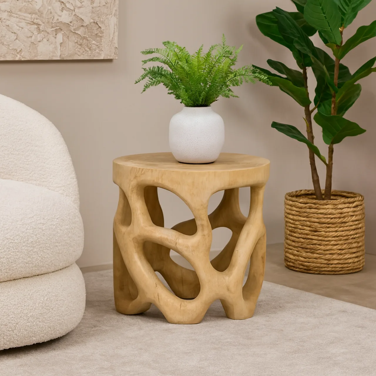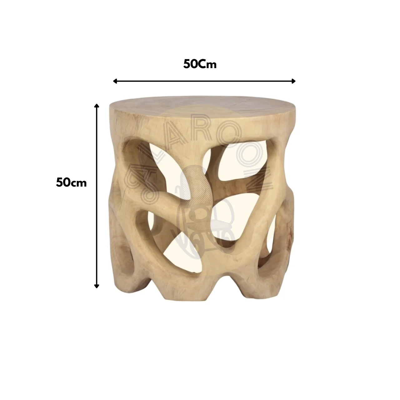 La mesa auxiliar está fabricada en madera de suar con acabado en color natural, ofreciendo un diseño elegante y robusto que aporta estilo y calidez a cualquier espacio.