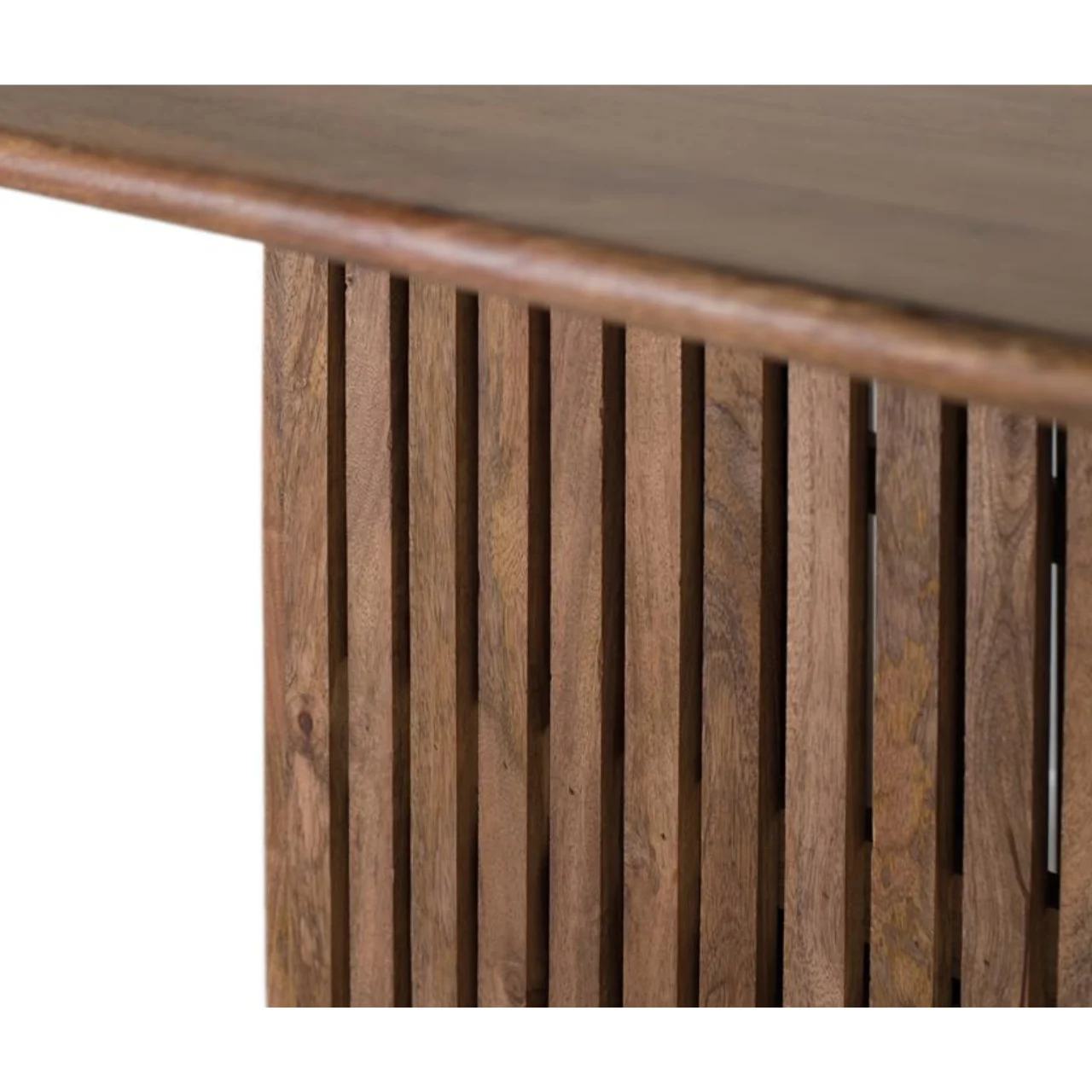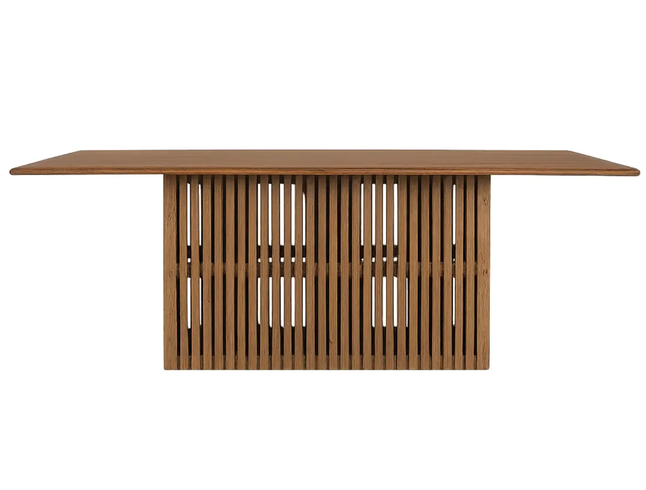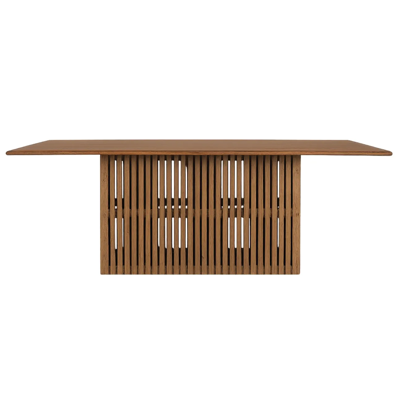 La base central está compuesta por listones verticales que aportan un estilo único y sofisticado. Al concentrar el soporte en un solo bloque, ofrece mayor estabilidad y comodidad al sentarse, optimizando el uso del espacio alrededor.