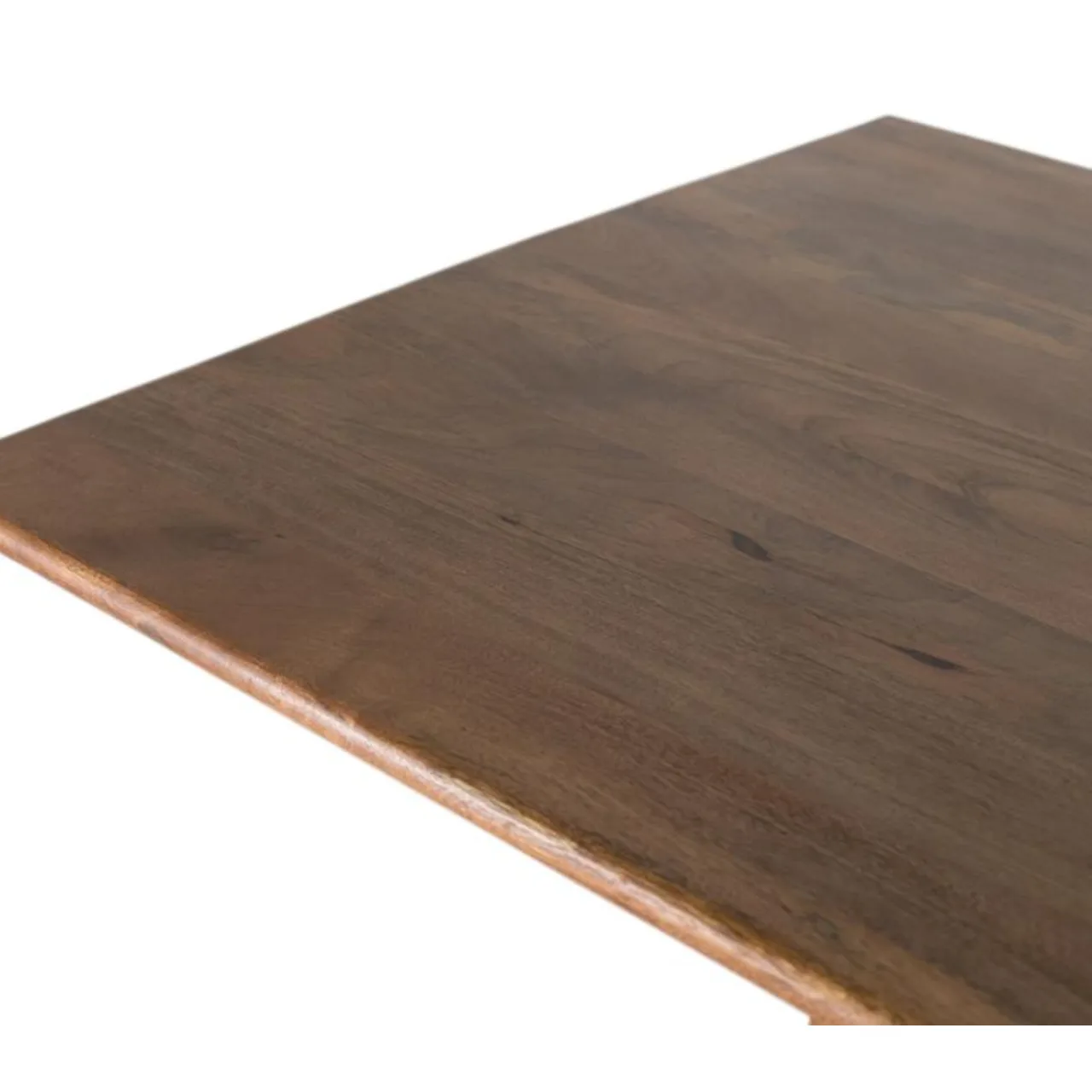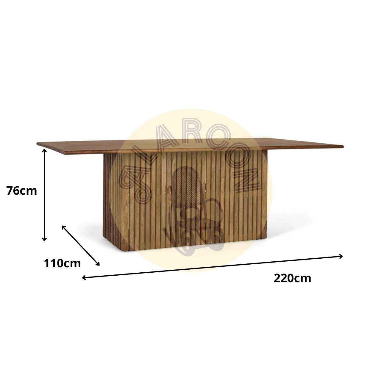 Con un diseño contemporáneo, esta mesa de comedor realza cualquier espacio gracias a su estructura robusta y a la calidez de la madera maciza. Su tapa rectangular de 220×110 cm con bordes redondeados resalta la veta natural, aportando carácter y elegancia a tu ambiente.
