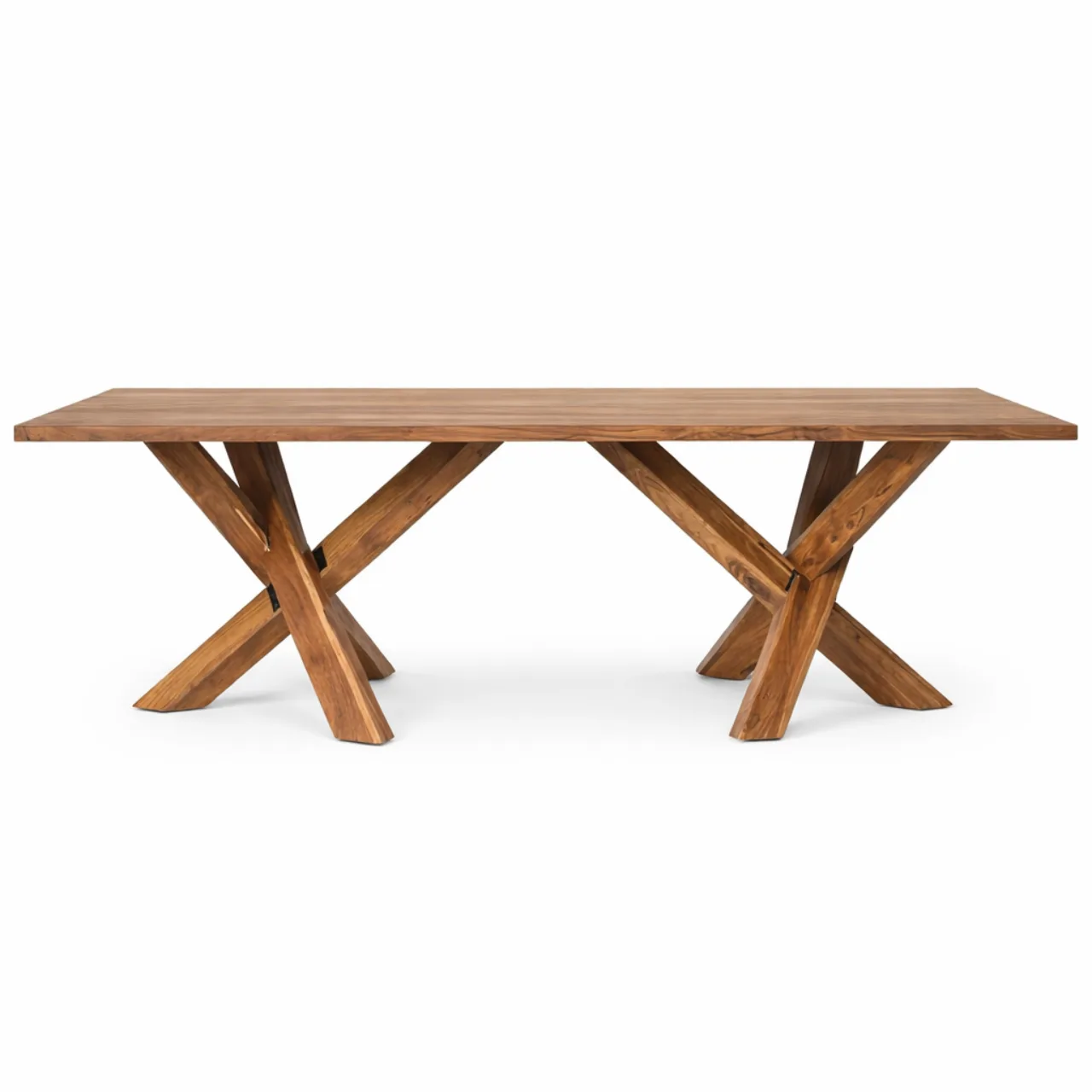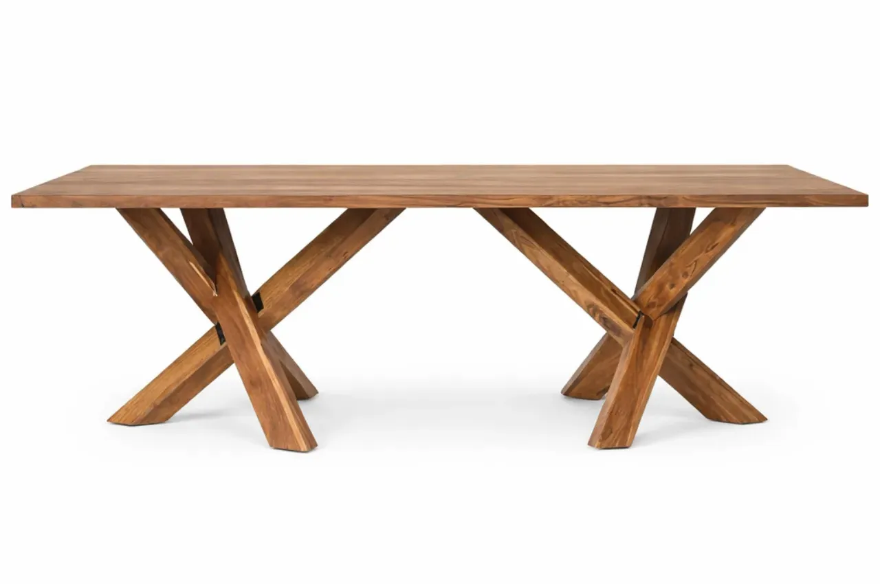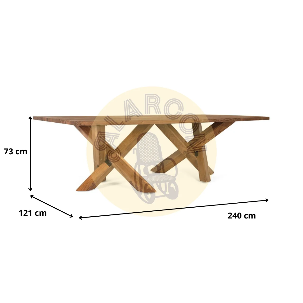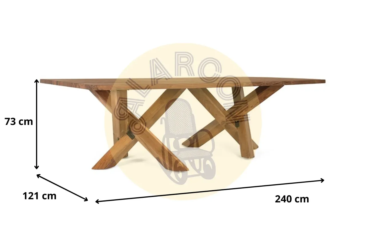 La amplia superficie de 240×121 cm ofrece un espacio cómodo para reuniones familiares o profesionales, mientras que su grosor de 3,5 cm refuerza la sensación de solidez. La base en doble X, también en madera de acacia, aporta un carácter arquitectónico y garantiza una estabilidad óptima en el uso diario.