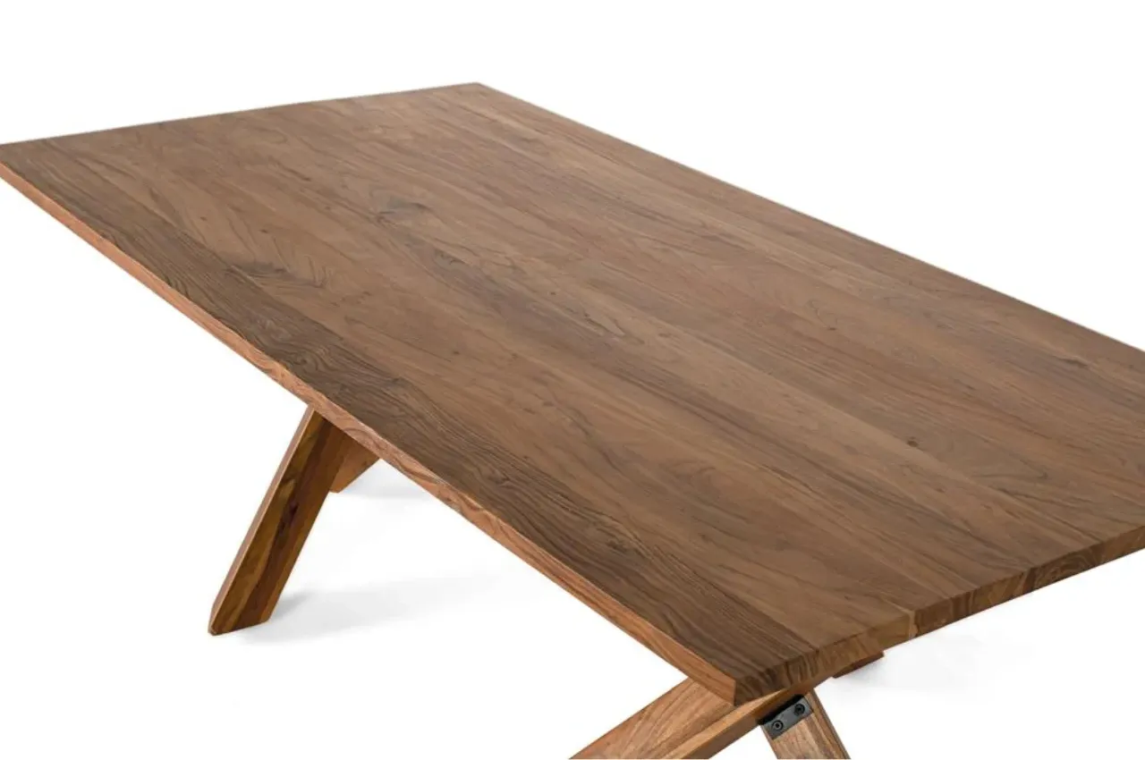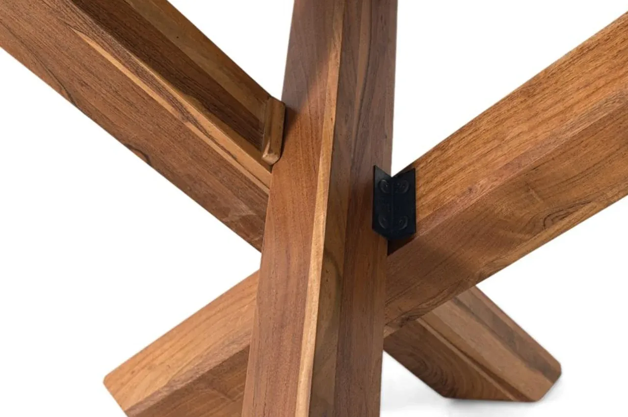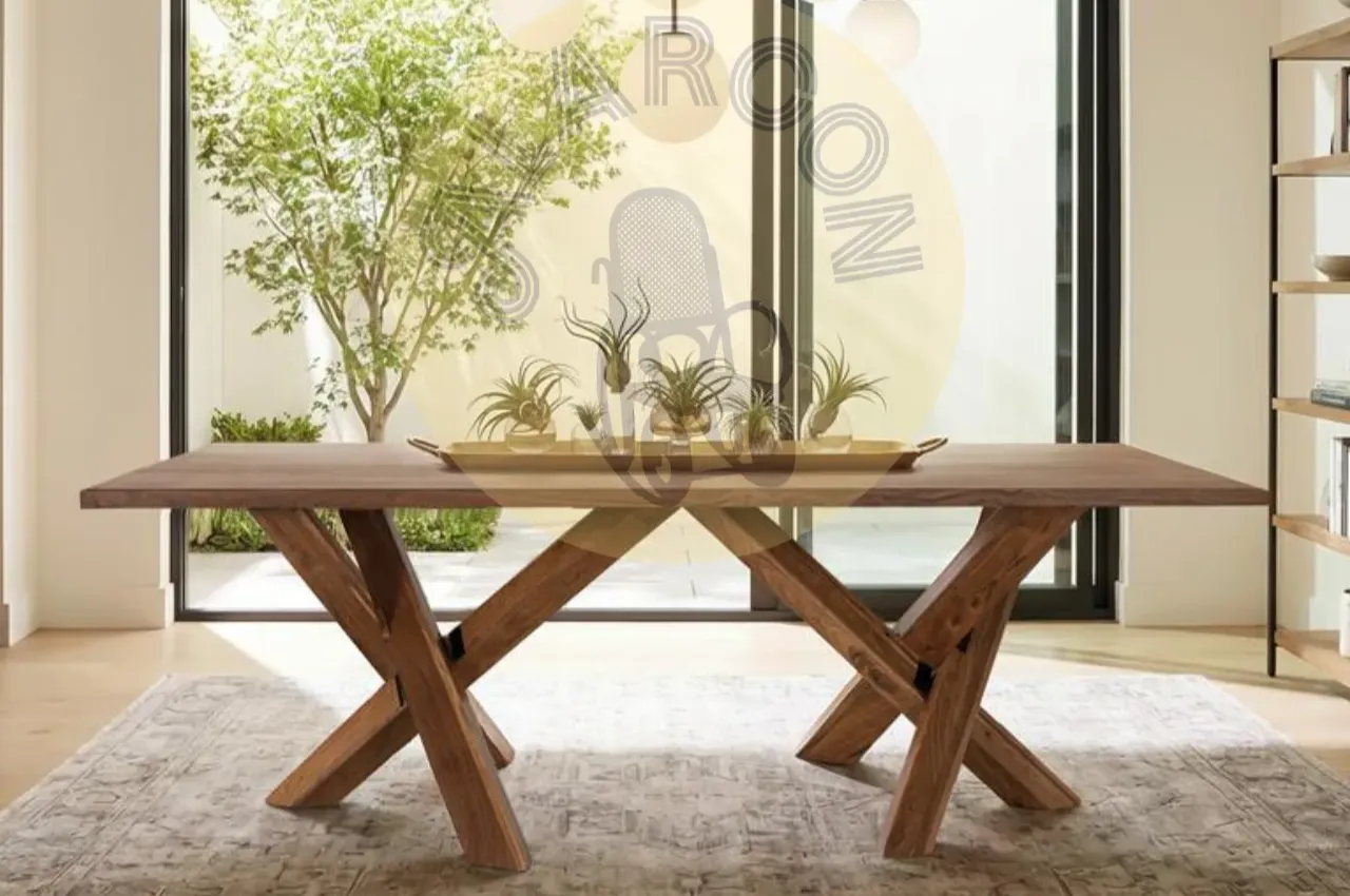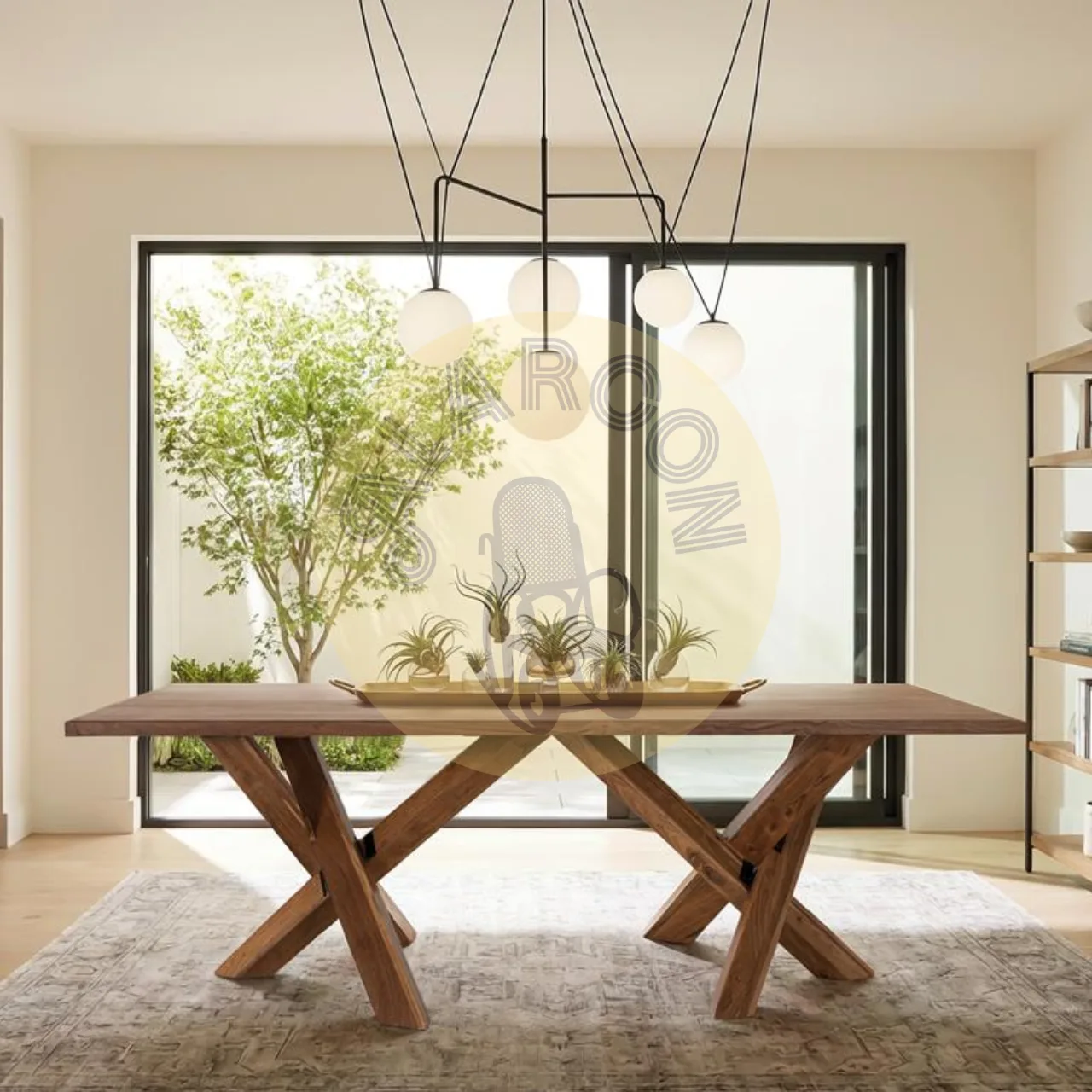 La amplia superficie de 240×121 cm ofrece un espacio cómodo para reuniones familiares o profesionales, mientras que su grosor de 3,5 cm refuerza la sensación de solidez. La base en doble X, también en madera de acacia, aporta un carácter arquitectónico y garantiza una estabilidad óptima en el uso diario.
