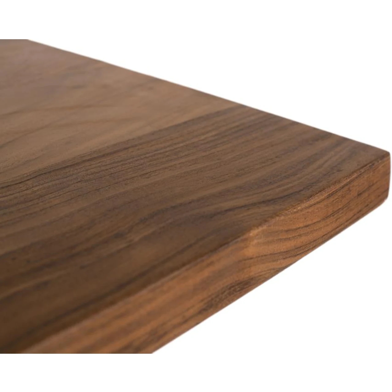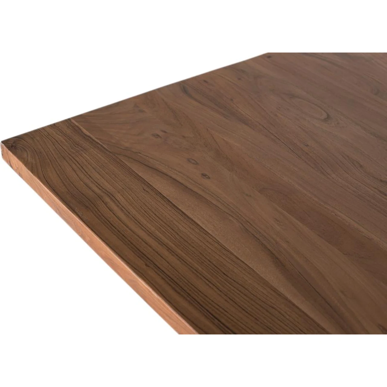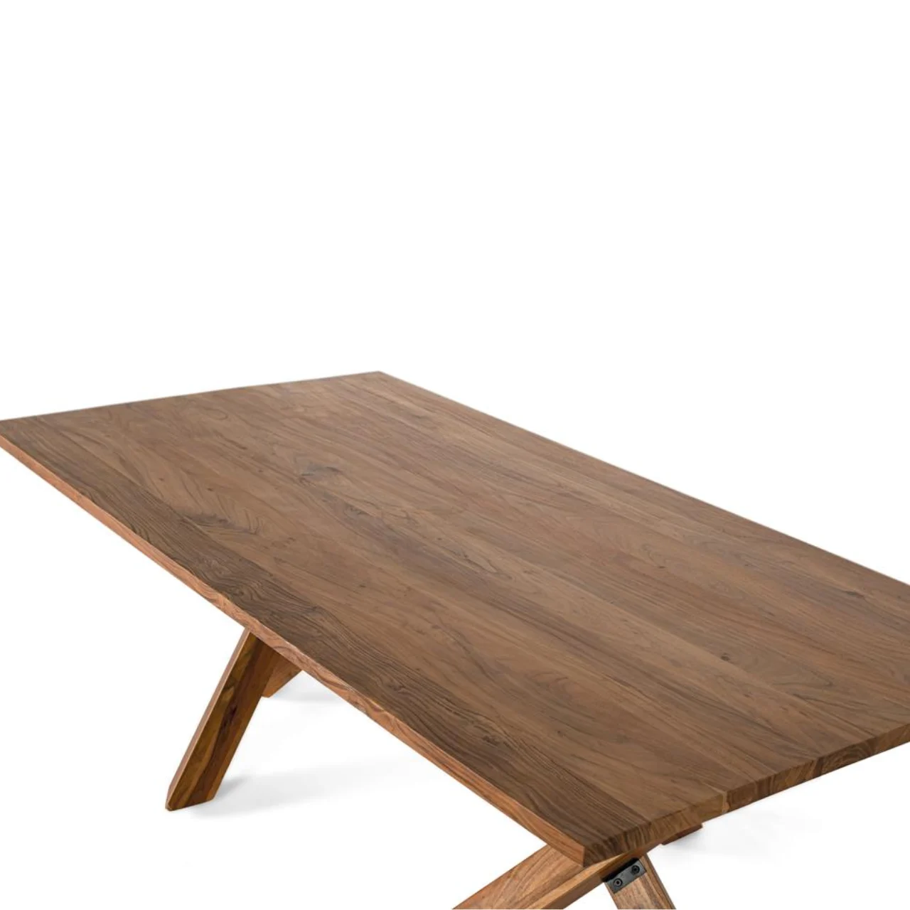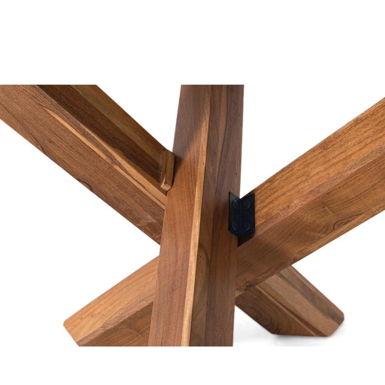 La amplia superficie de 240×121 cm ofrece un espacio cómodo para reuniones familiares o profesionales, mientras que su grosor de 3,5 cm refuerza la sensación de solidez. La base en doble X, también en madera de acacia, aporta un carácter arquitectónico y garantiza una estabilidad óptima en el uso diario.