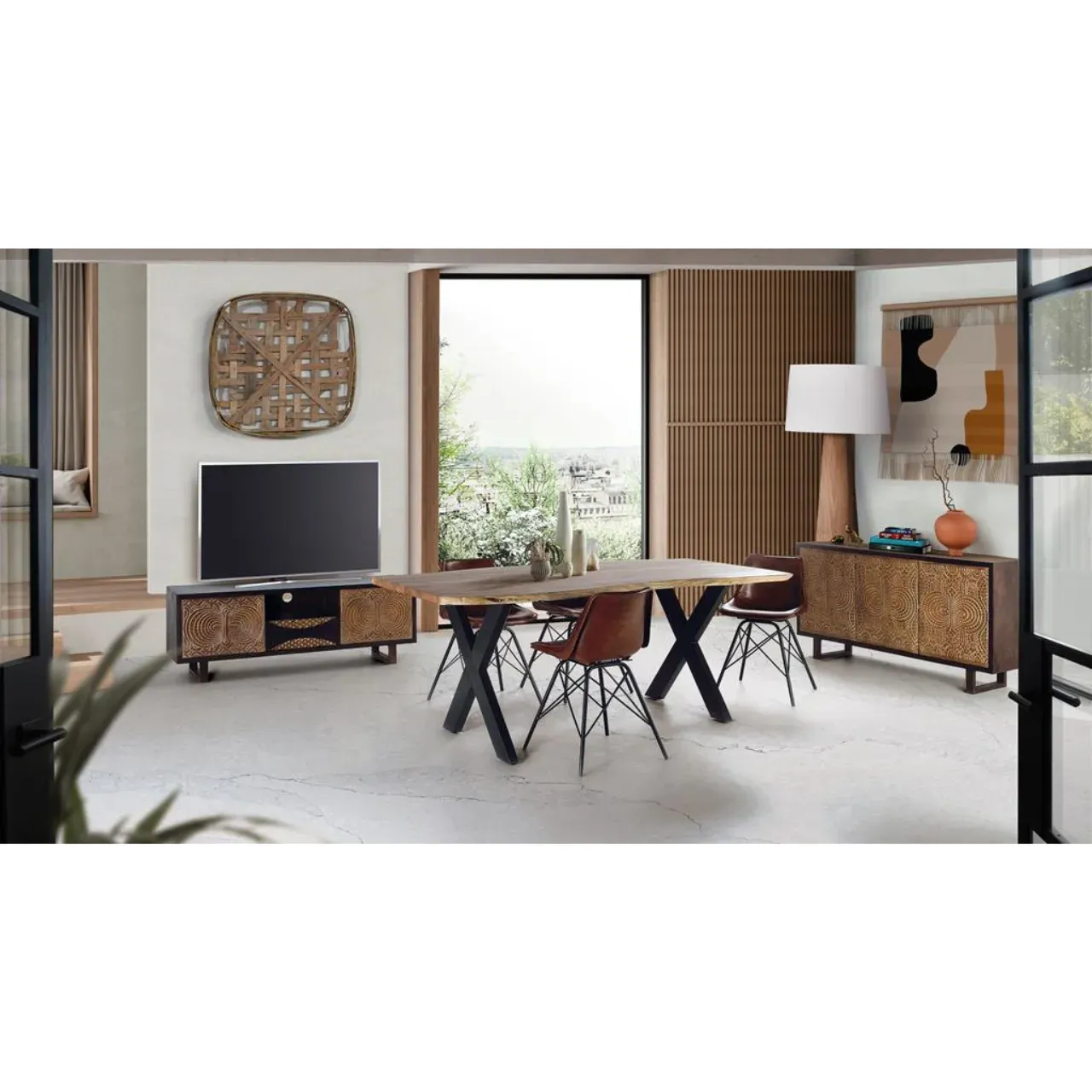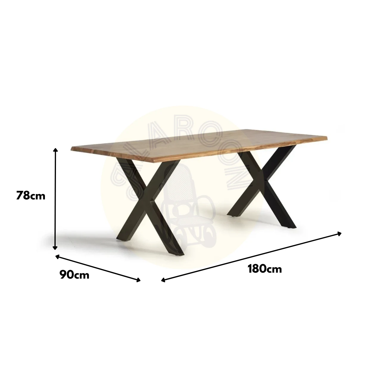 Estéticamente elegante, obra de maestros carpinteros y herreros, esta obra maestra combina el encanto campestre de la madera de Acacia con la resistencia refinada del metal. Lo interesante es, se puede apreciar el grano y la sintaxis única de la madera de Acacia, realza la calidez y el atractivo natural de esta joya central del espacio de comedor.