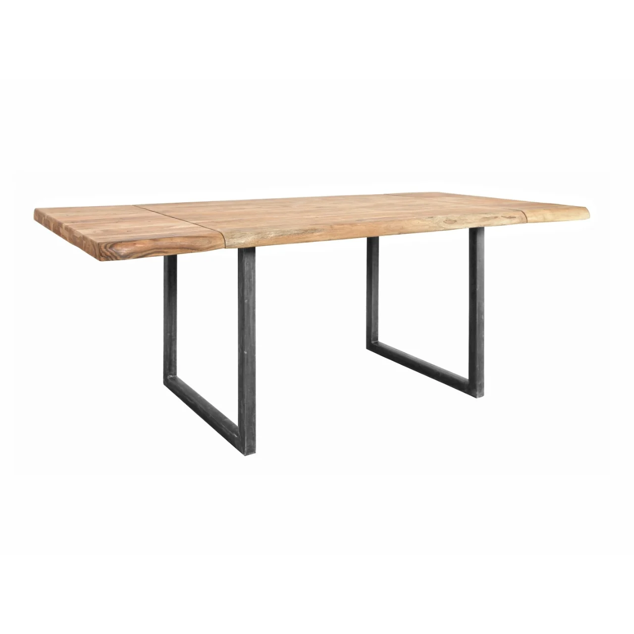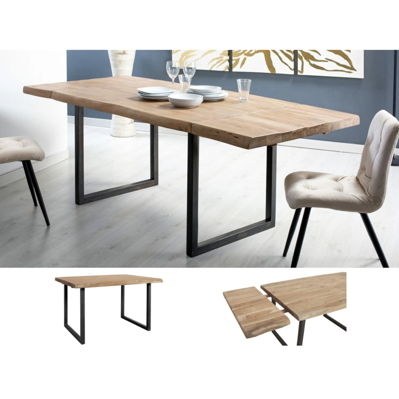 La mesa de comedor combina madera de acacia y estructura de metal, ofreciendo un diseño robusto y moderno que aporta estilo y calidez a cualquier salón. Su acabado en color natural y negro resalta el contraste y la elegancia.