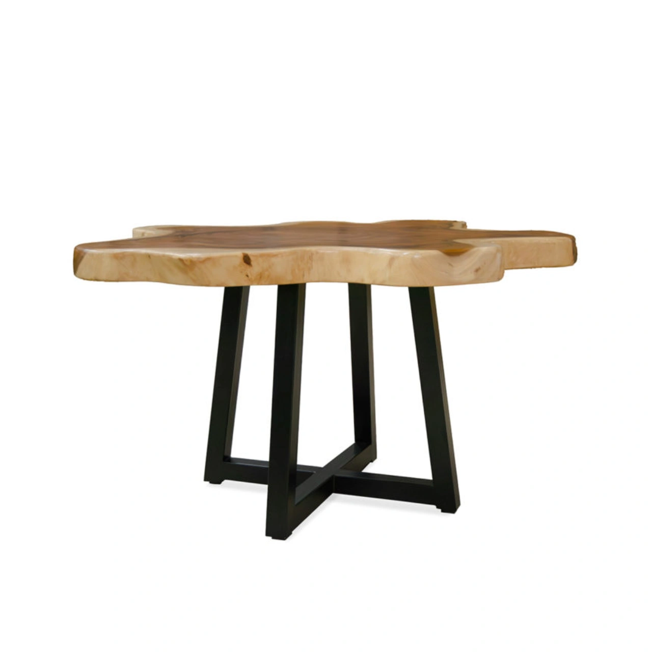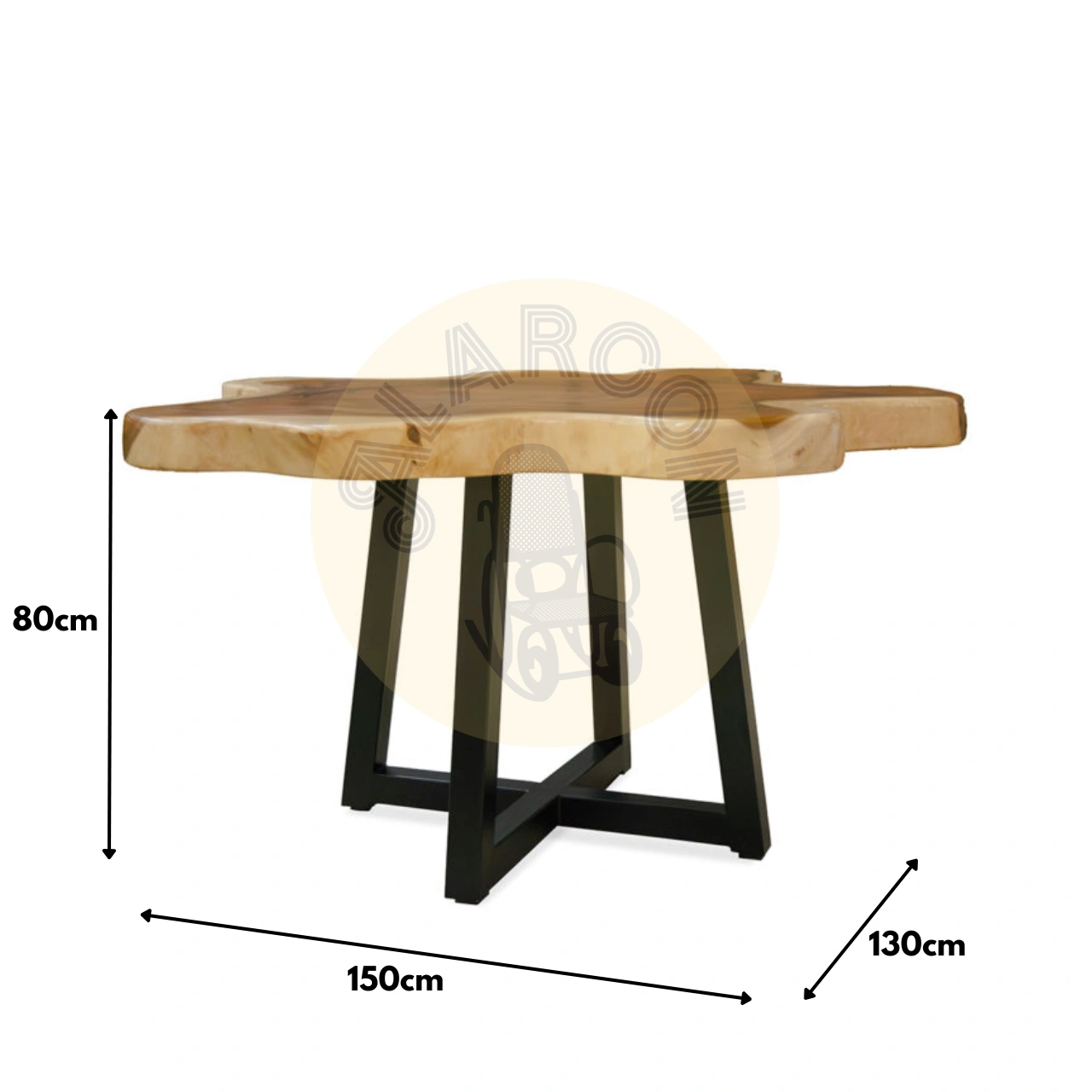 Sus medidas de 150 × 130 × 80 cm y su tablero macizo de 8 cm ofrecen una superficie sólida y visualmente poderosa, sostenida por una base de hierro que aporta estabilidad, contraste y un estilo contemporáneo. Esta combinación de materiales permite integrarla con facilidad en interiores modernos, rústicos o de inspiración natural.