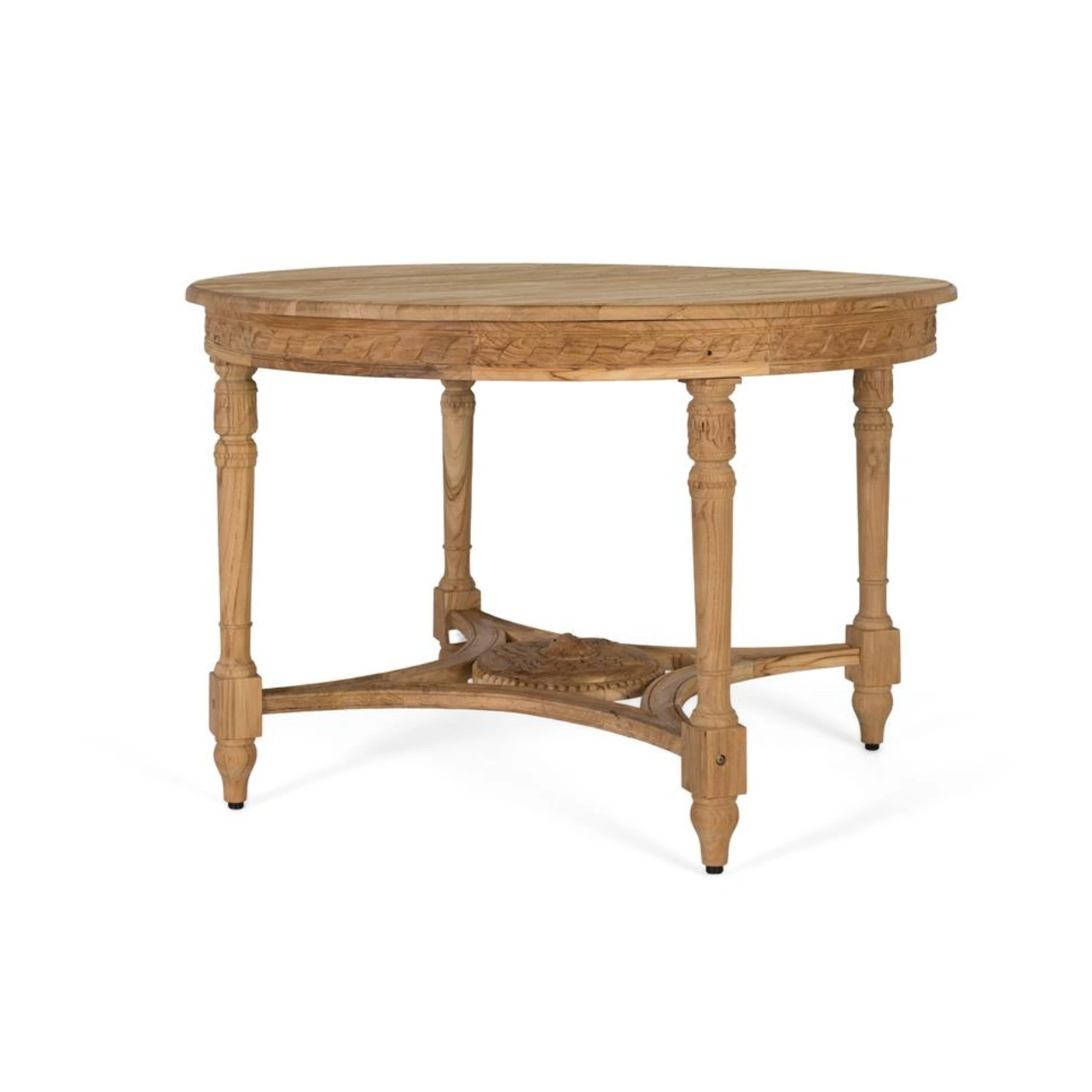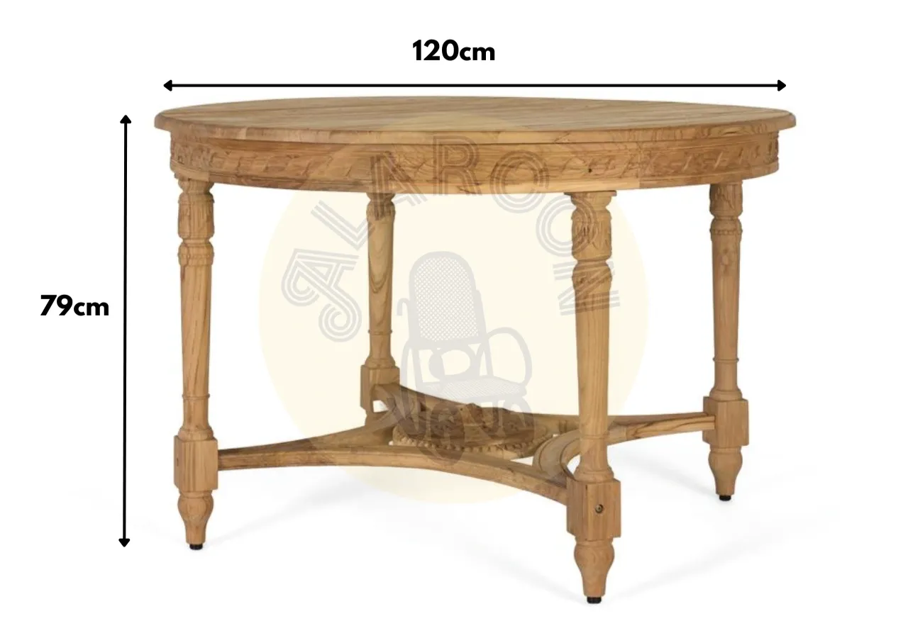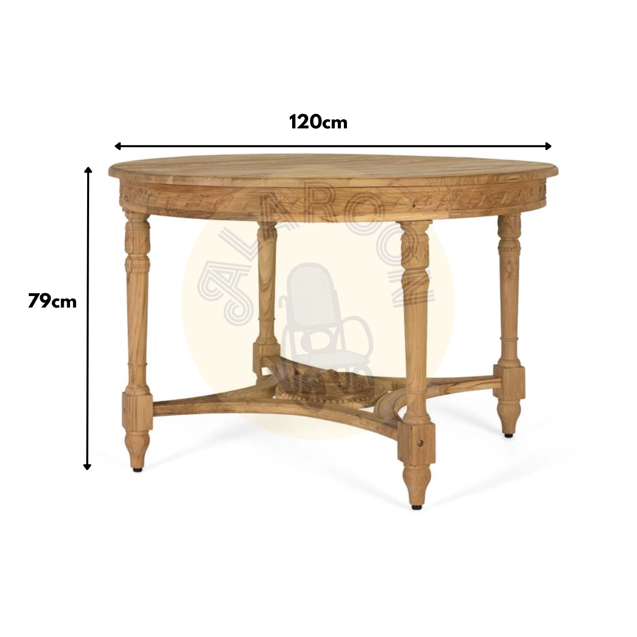 Esta mesa de comedor redonda en madera de teca destaca por su acabado natural, que realza las vetas orgánicas y aporta una estética cálida al espacio. El tablero de 120 × 120 × 79 cm incorpora un borde tallado en relieve, creando un detalle decorativo que refuerza su carácter artesanal.