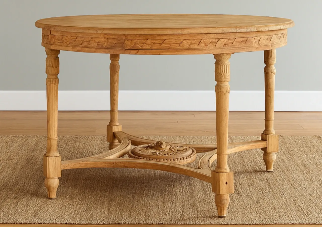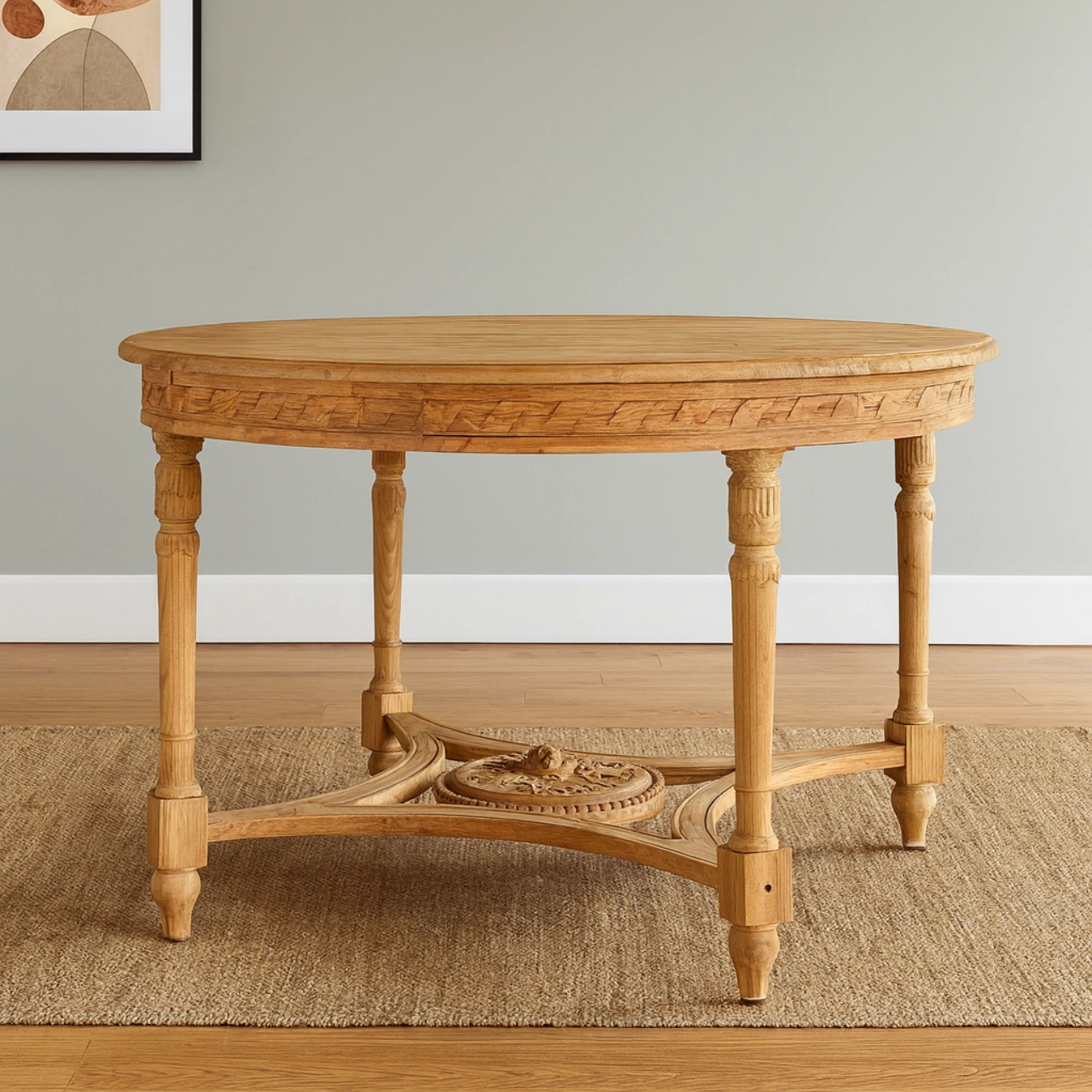 El diseño se sustenta sobre cuatro patas trabajadas a mano, unidas por una cruceta curvada que aporta estabilidad y una presencia sólida. En el centro del tablero, una roseta tallada añade un toque distintivo que complementa su estilo tradicional.