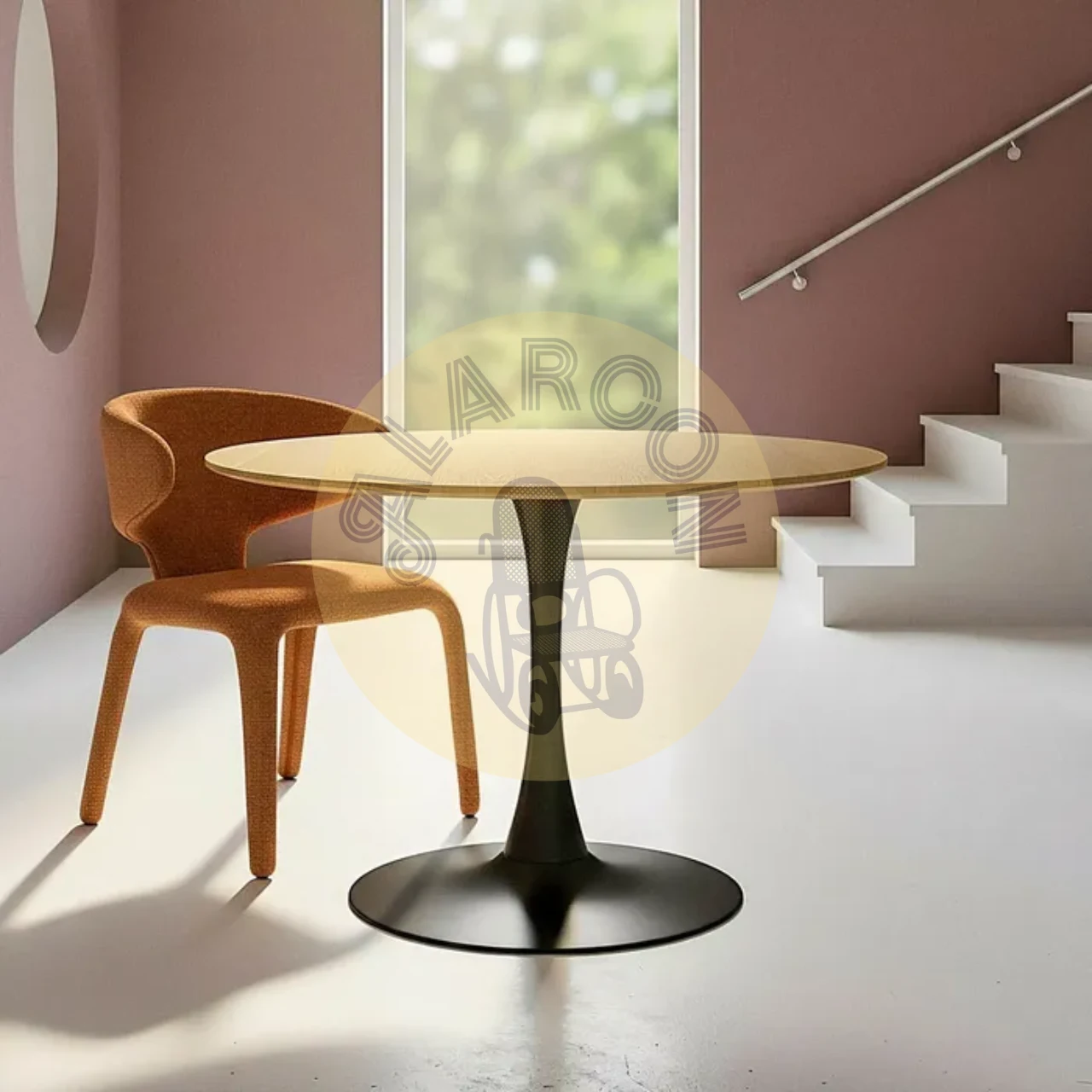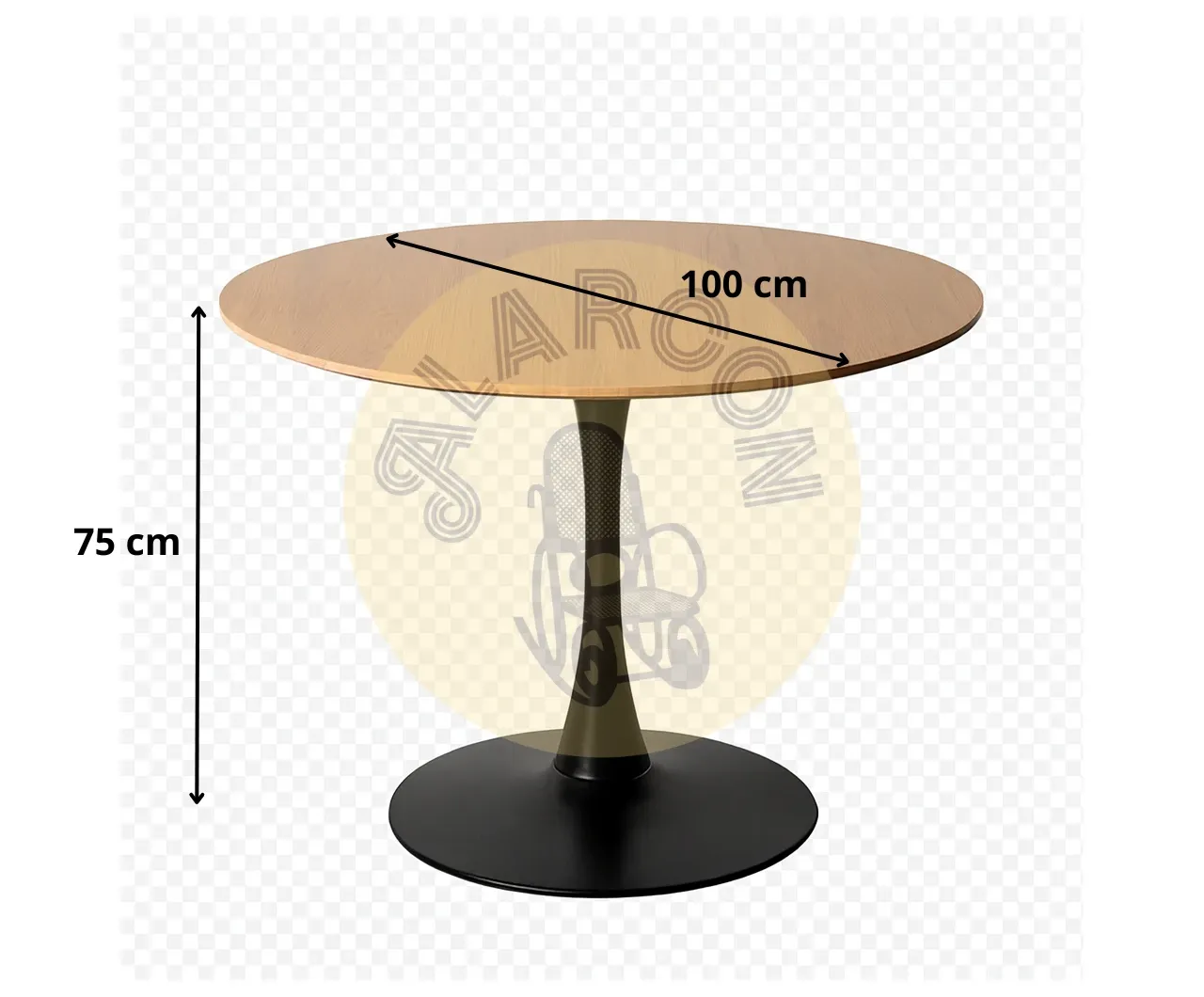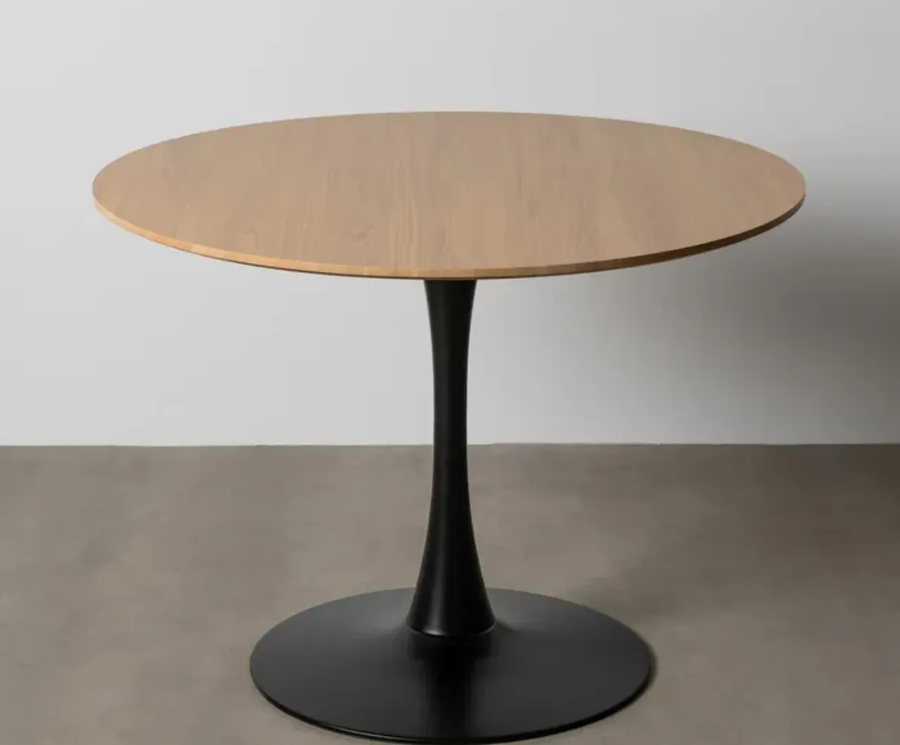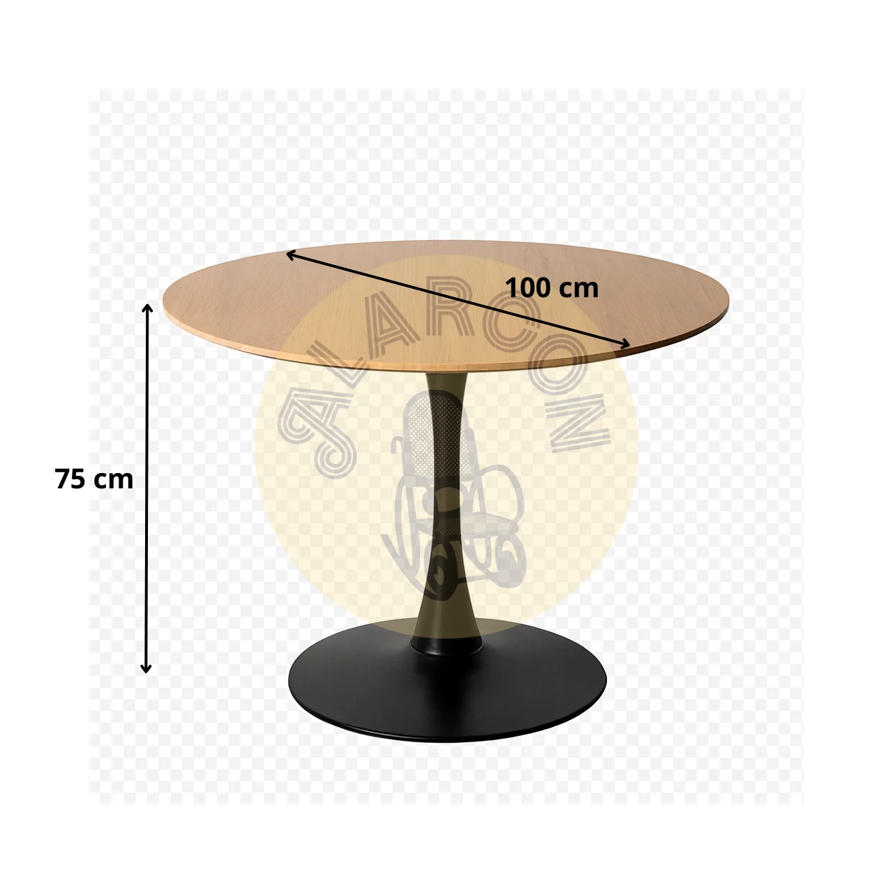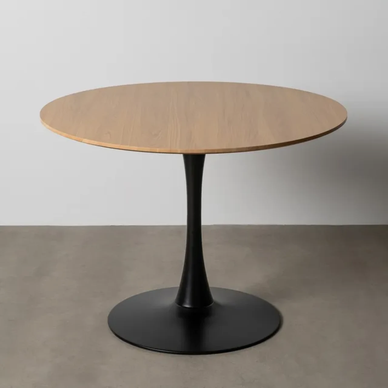Diseñada para espacios contemporáneos, esta mesa de comedor redonda combina la calidez del color natural con la elegancia del metal negro. Su estructura firme y su base central de 60 cm aportan estabilidad y un estilo sofisticado que complementa cualquier ambiente.