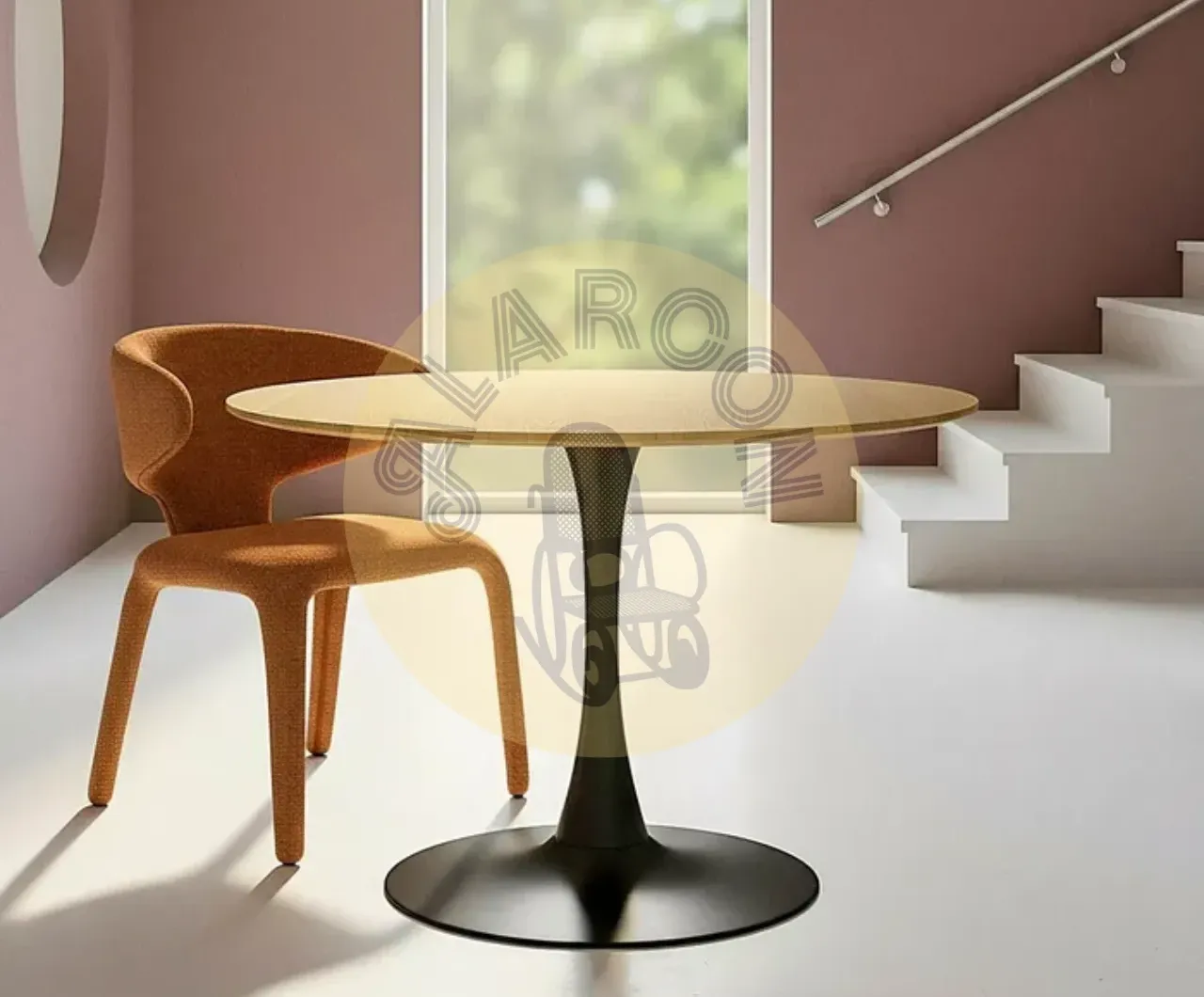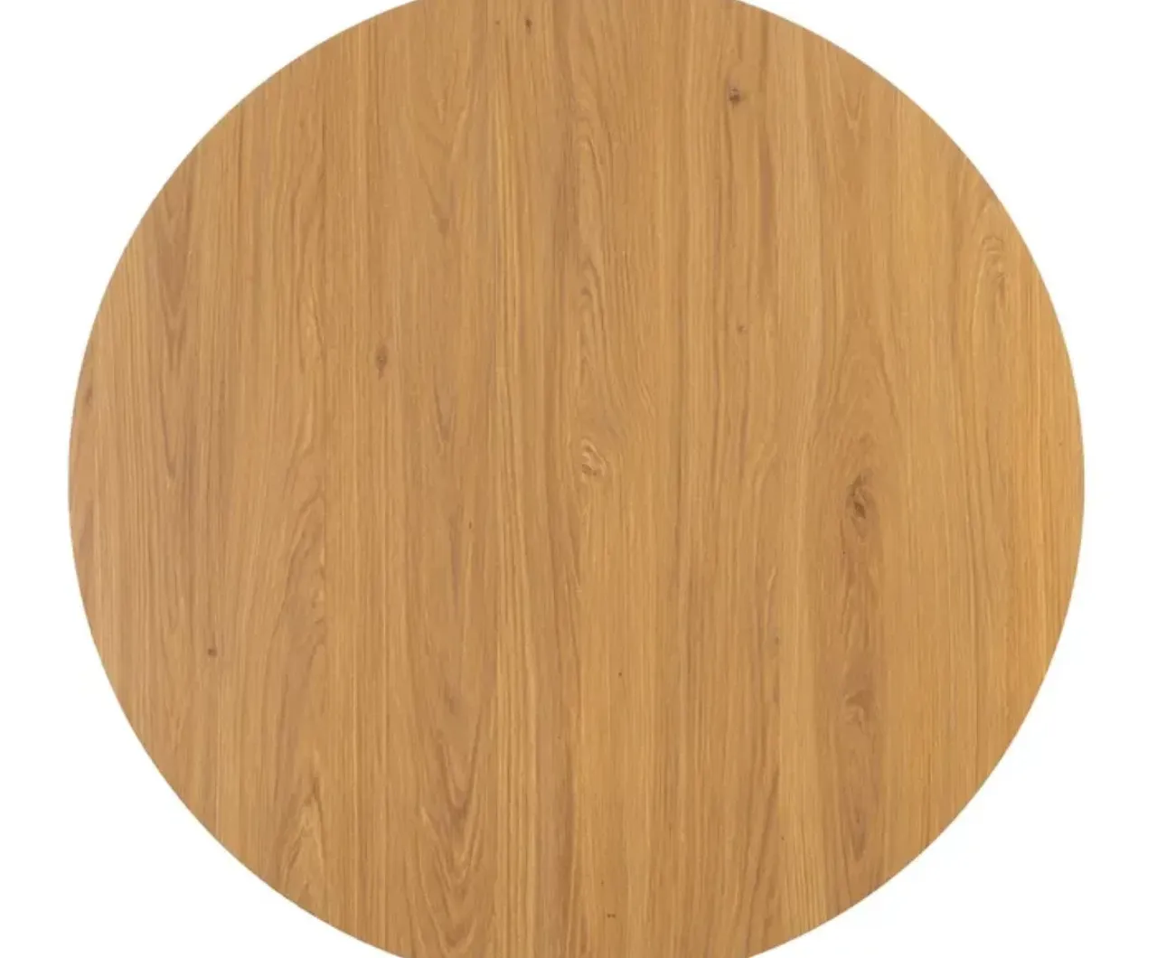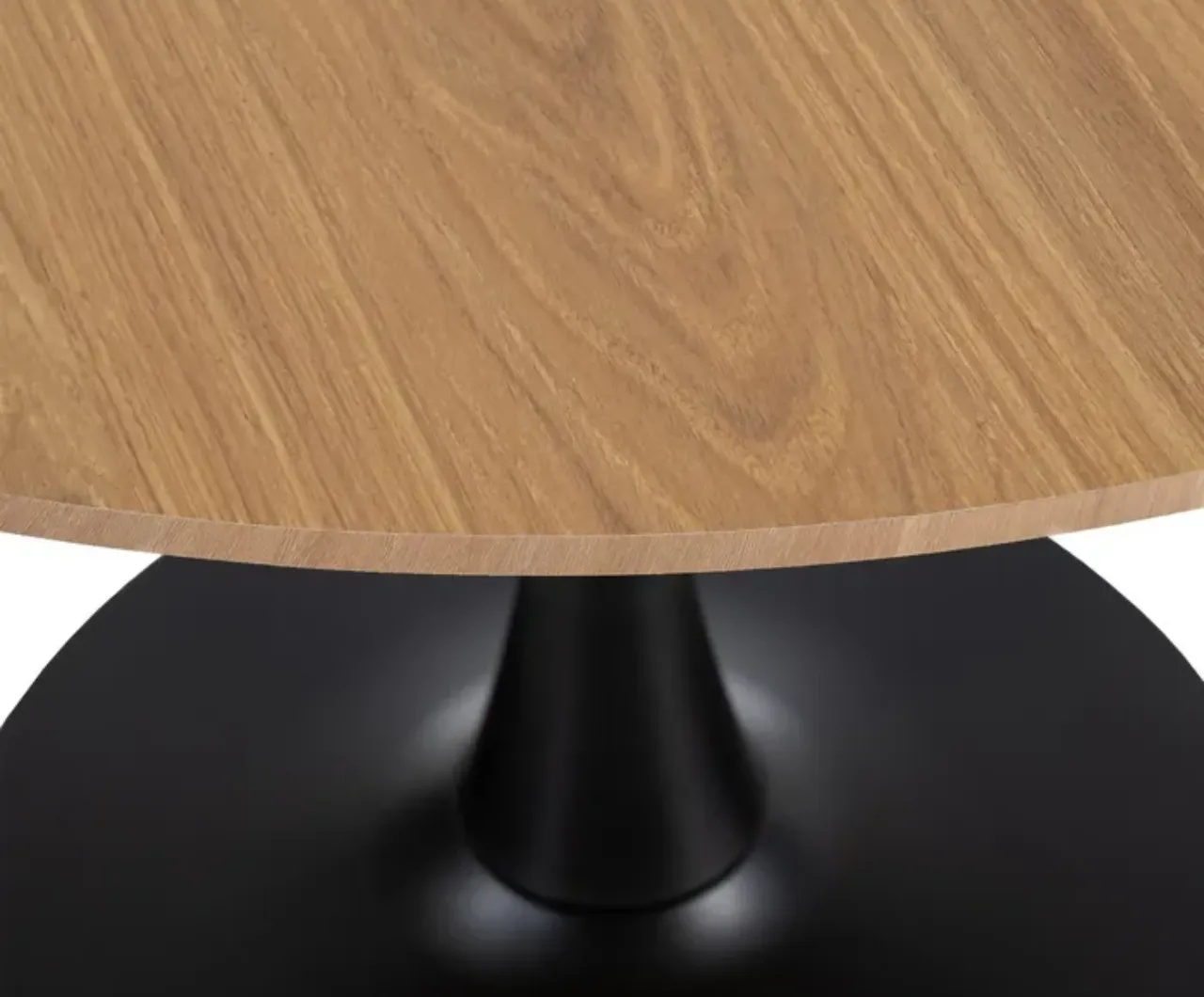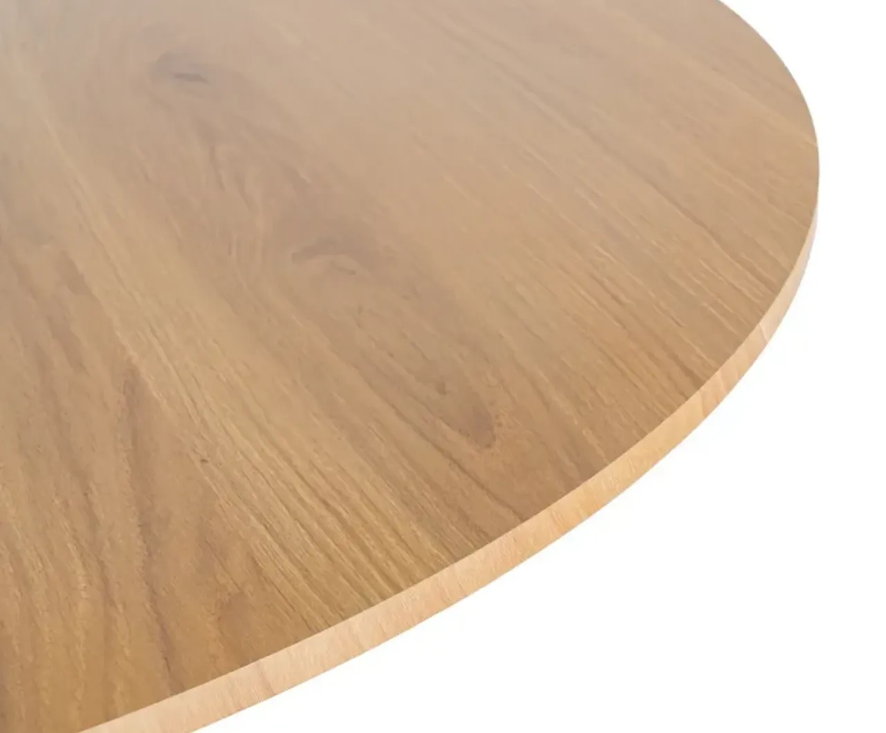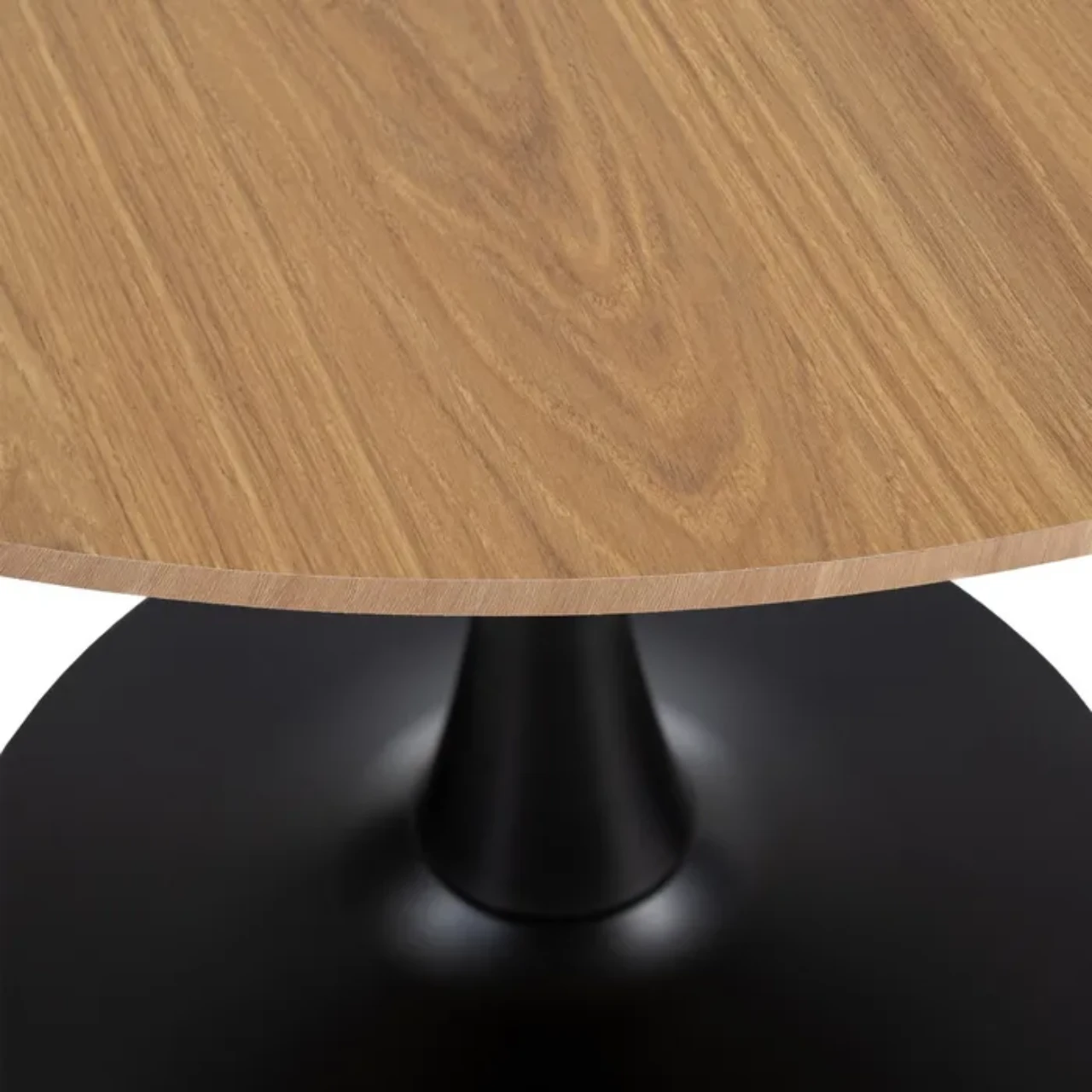 Diseñada para espacios contemporáneos, esta mesa de comedor redonda combina la calidez del color natural con la elegancia del metal negro. Su estructura firme y su base central de 60 cm aportan estabilidad y un estilo sofisticado que complementa cualquier ambiente.