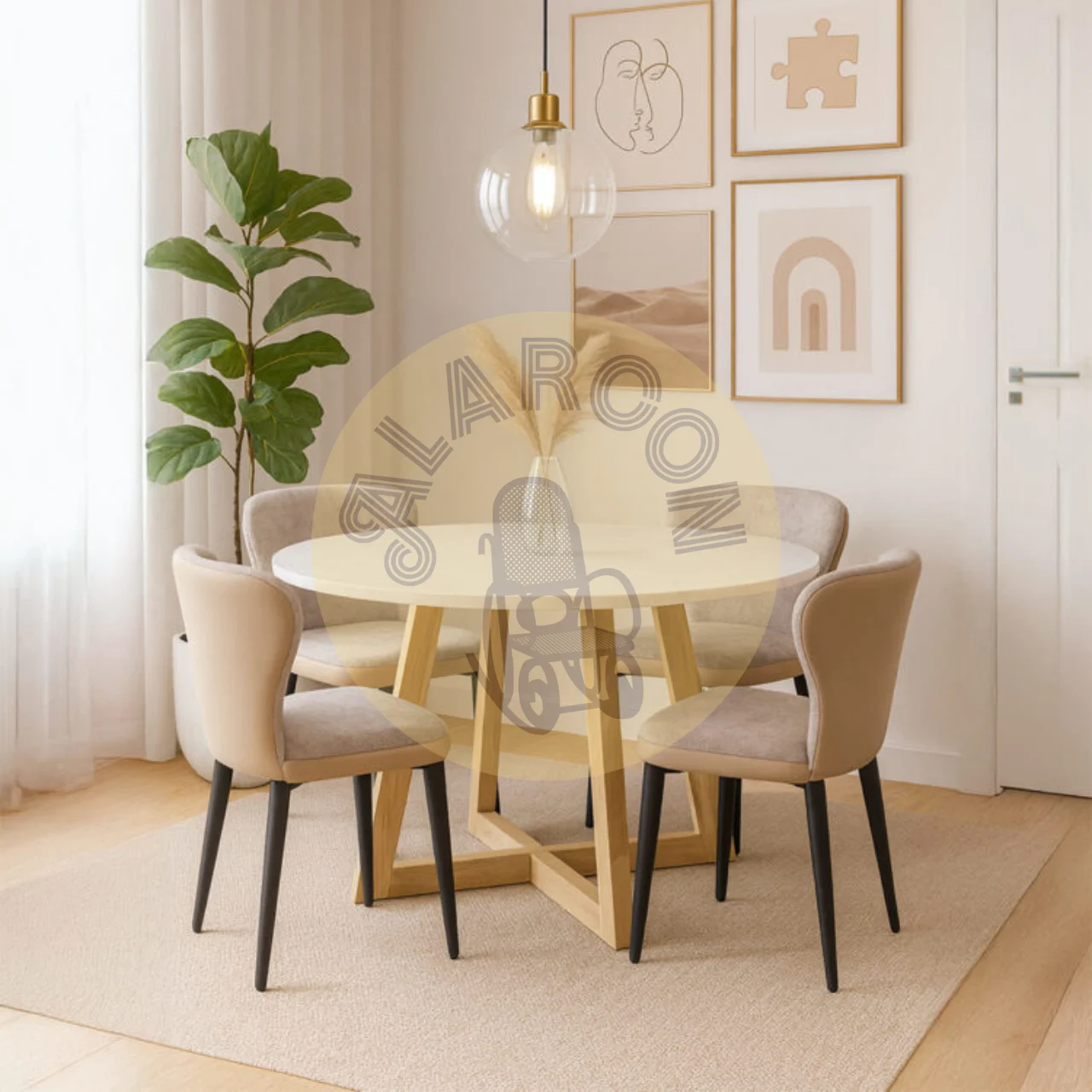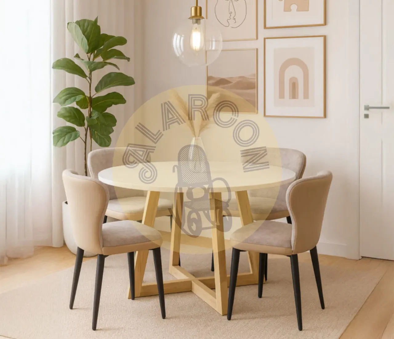 El diseño de esta mesa de comedor redonda destaca por su superficie de microcemento en tono claro, que aporta un estilo moderno y minimalista ideal para cualquier ambiente contemporáneo. Su acabado artesanal la convierte en una pieza única y auténtica, perfecta para quienes valoran los detalles.