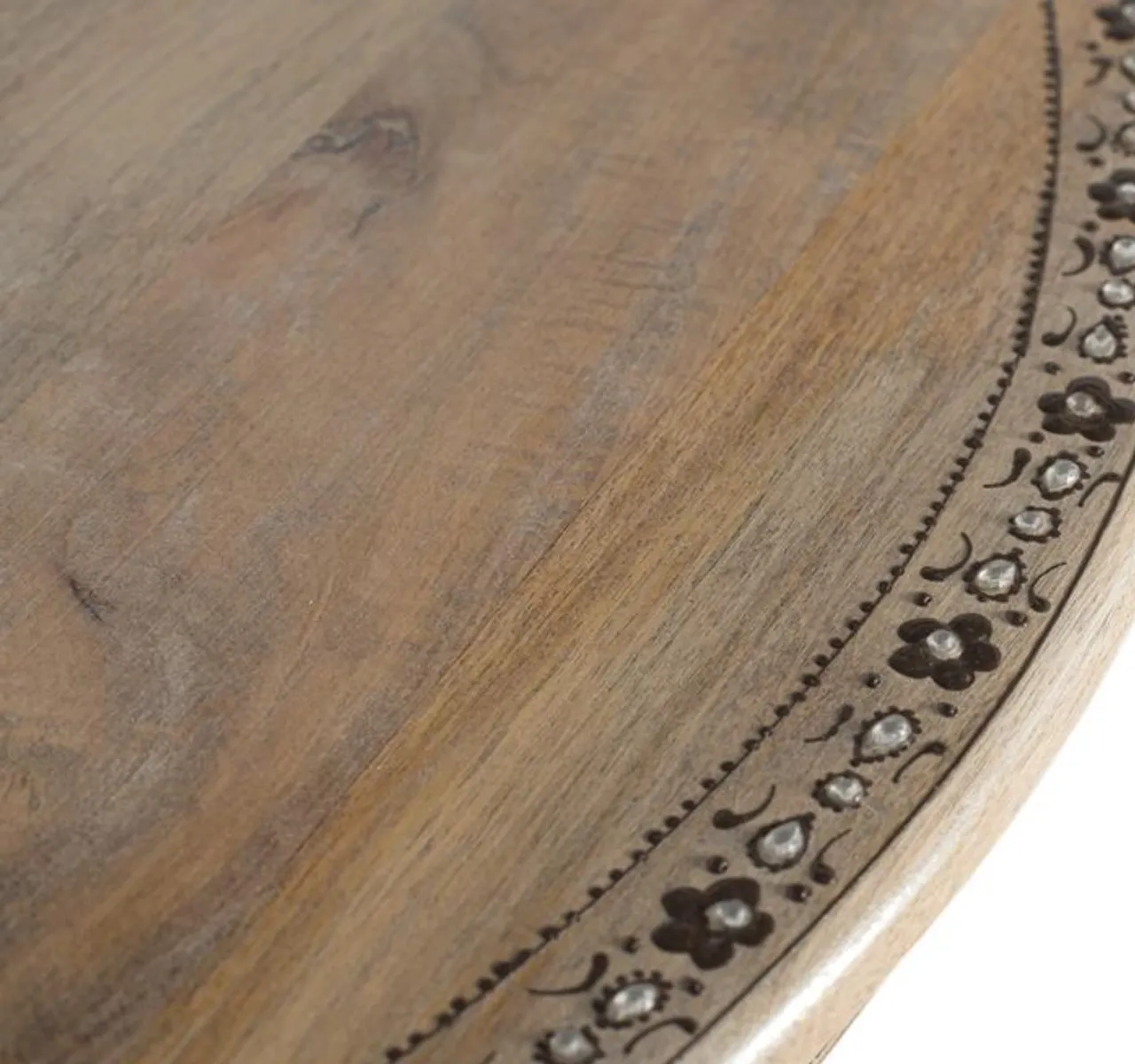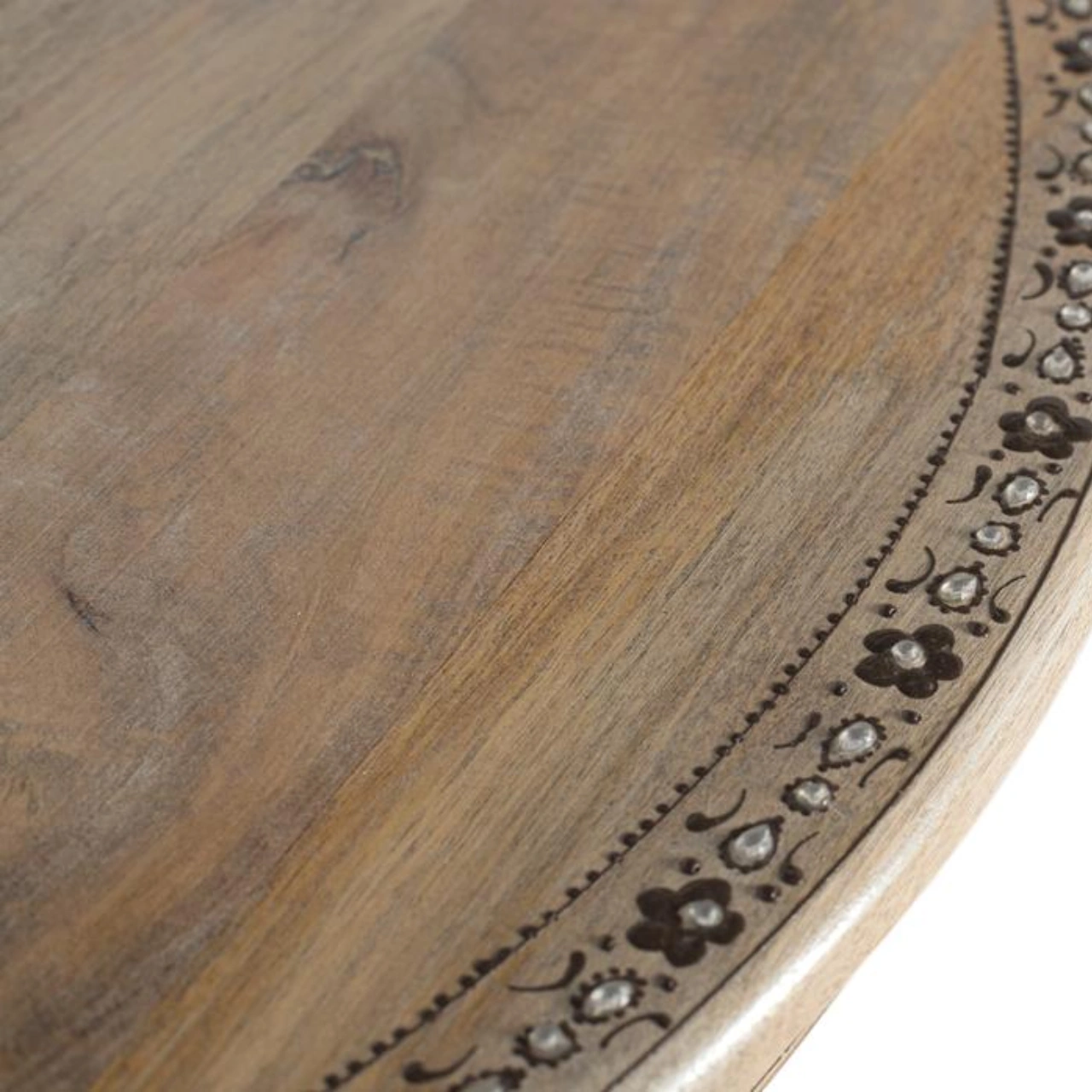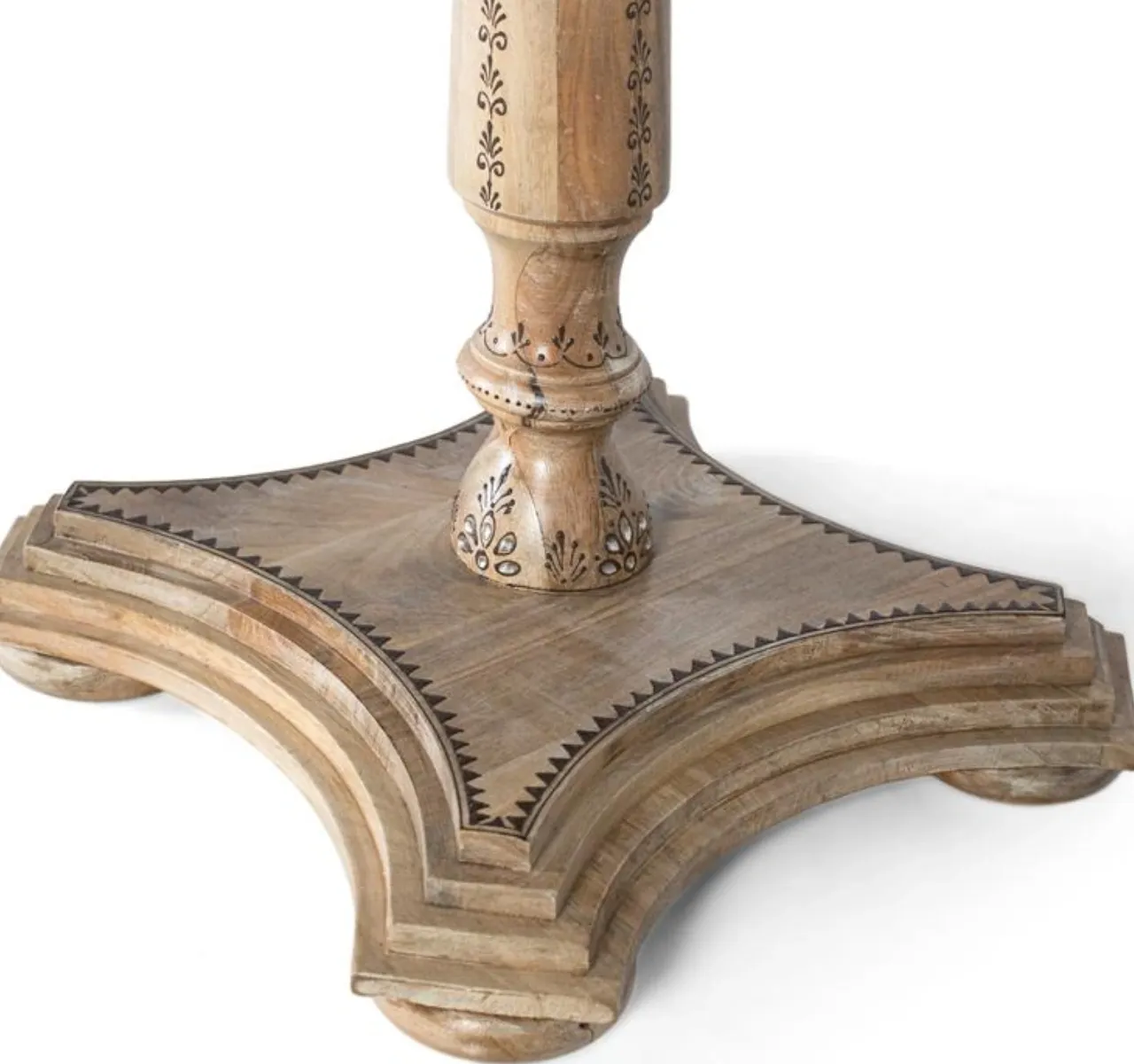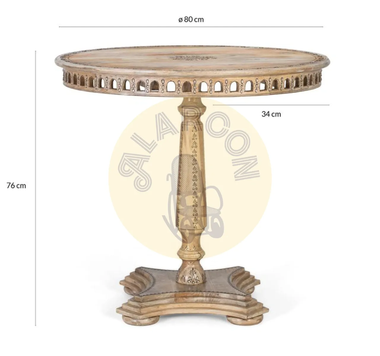 Su sobre con tallas florales y cenefa decorativa aporta un estilo étnico distintivo, mientras que la base pedestal central torneada con forma trilobulada garantiza estabilidad y una estética sofisticada. Con medidas de 80 cm de ancho, 80 cm de fondo y 76 cm de alto, es ideal como mesa de comedor para 4 plazas, optimizando el espacio sin renunciar al diseño.