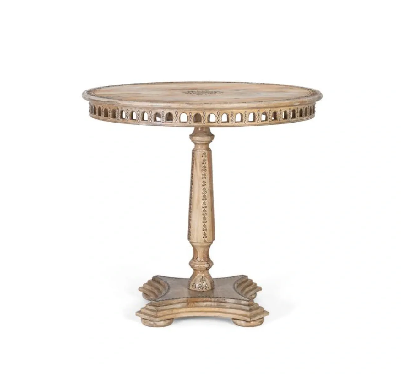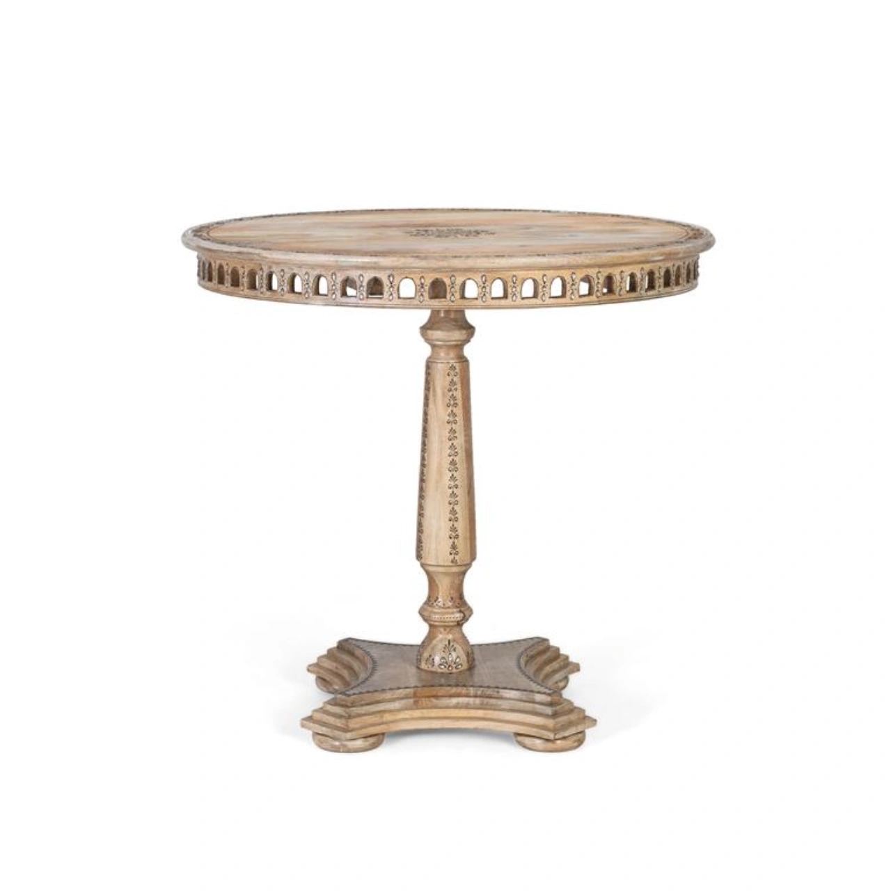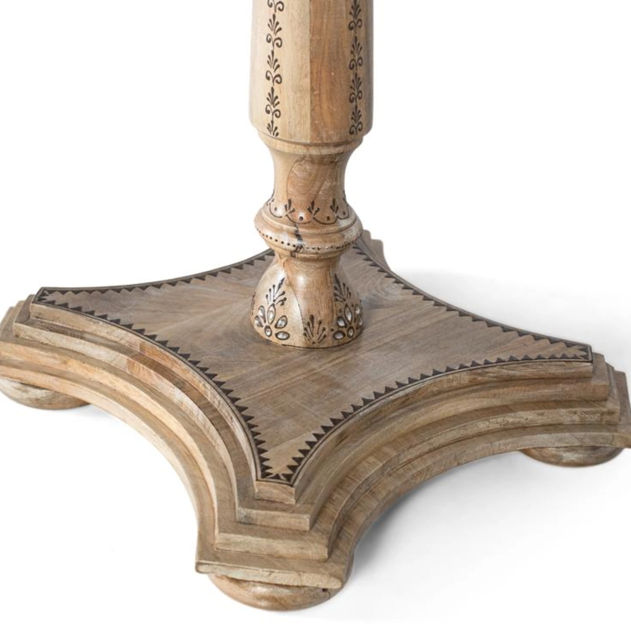 Su sobre con tallas florales y cenefa decorativa aporta un estilo étnico distintivo, mientras que la base pedestal central torneada con forma trilobulada garantiza estabilidad y una estética sofisticada. Con medidas de 80 cm de ancho, 80 cm de fondo y 76 cm de alto, es ideal como mesa de comedor para 4 plazas, optimizando el espacio sin renunciar al diseño.