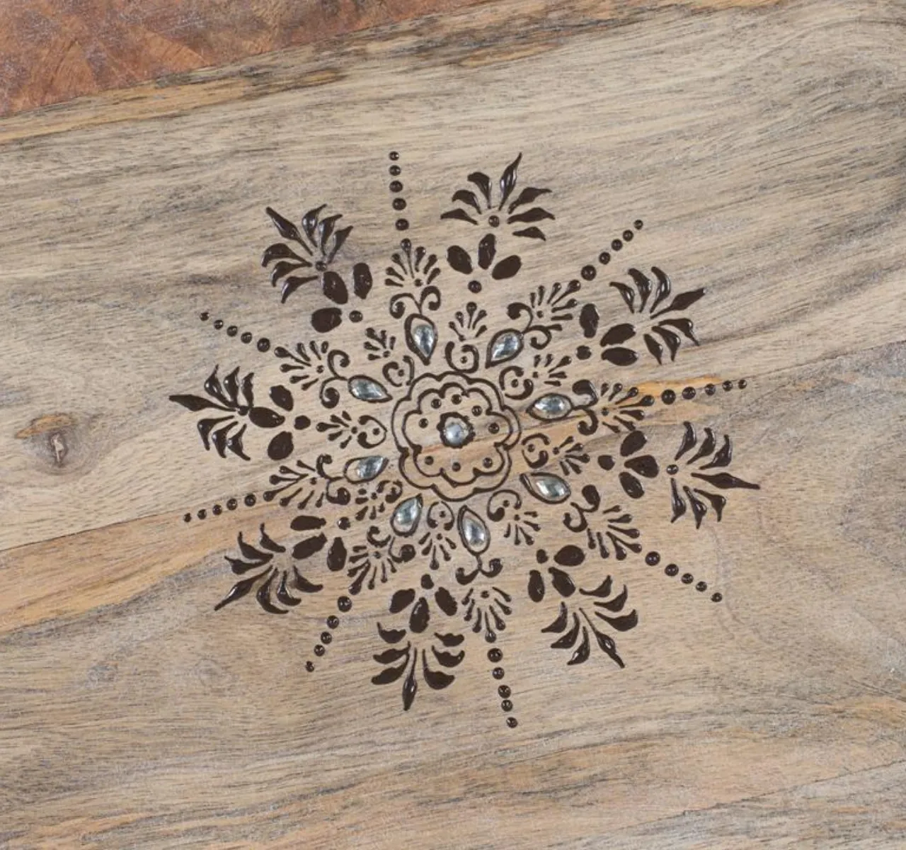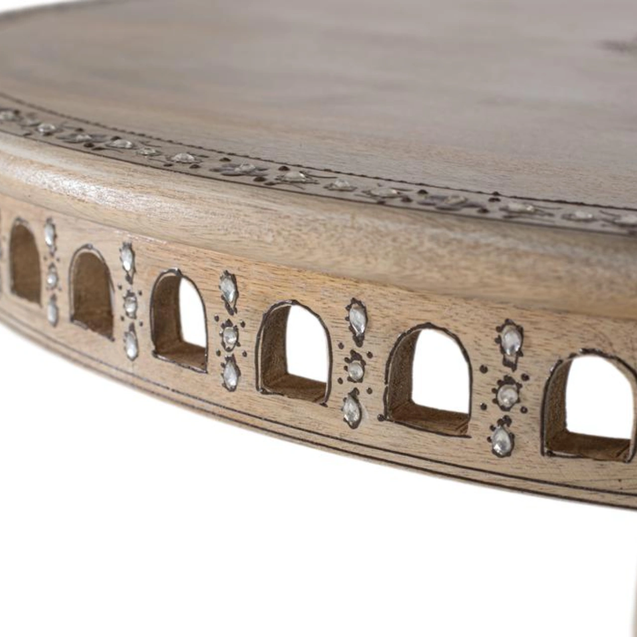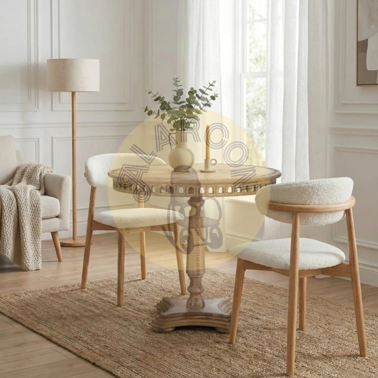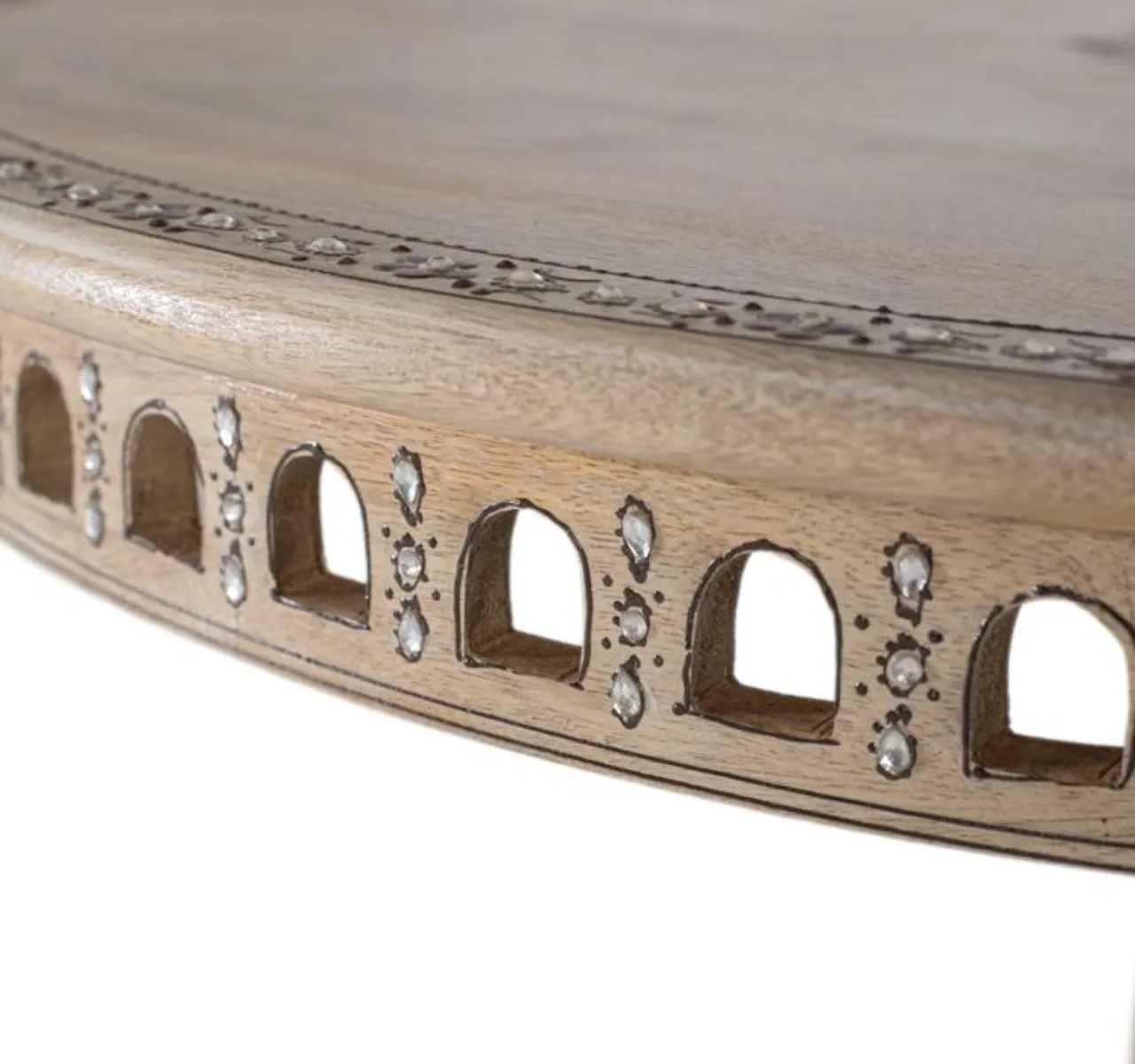 Su sobre con tallas florales y cenefa decorativa aporta un estilo étnico distintivo, mientras que la base pedestal central torneada con forma trilobulada garantiza estabilidad y una estética sofisticada. Con medidas de 80 cm de ancho, 80 cm de fondo y 76 cm de alto, es ideal como mesa de comedor para 4 plazas, optimizando el espacio sin renunciar al diseño.
