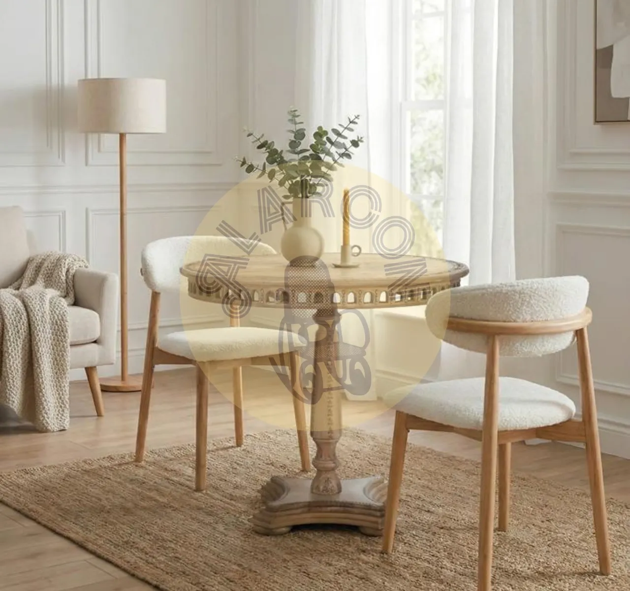 Aporta carácter y autenticidad a tu hogar con esta mesa de comedor redonda fabricada en madera de mango, un material natural, resistente y lleno de personalidad. Su acabado en blanco lavado realza la veta natural y aporta luminosidad, creando una pieza elegante y atemporal perfecta para cualquier salón o comedor.
