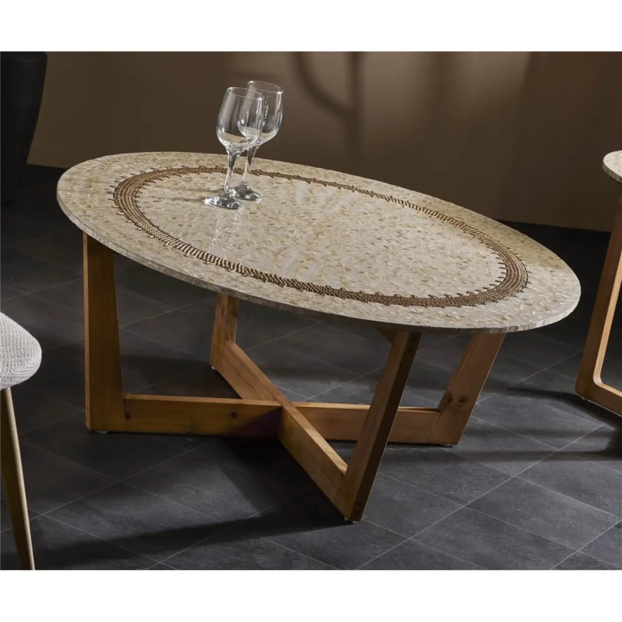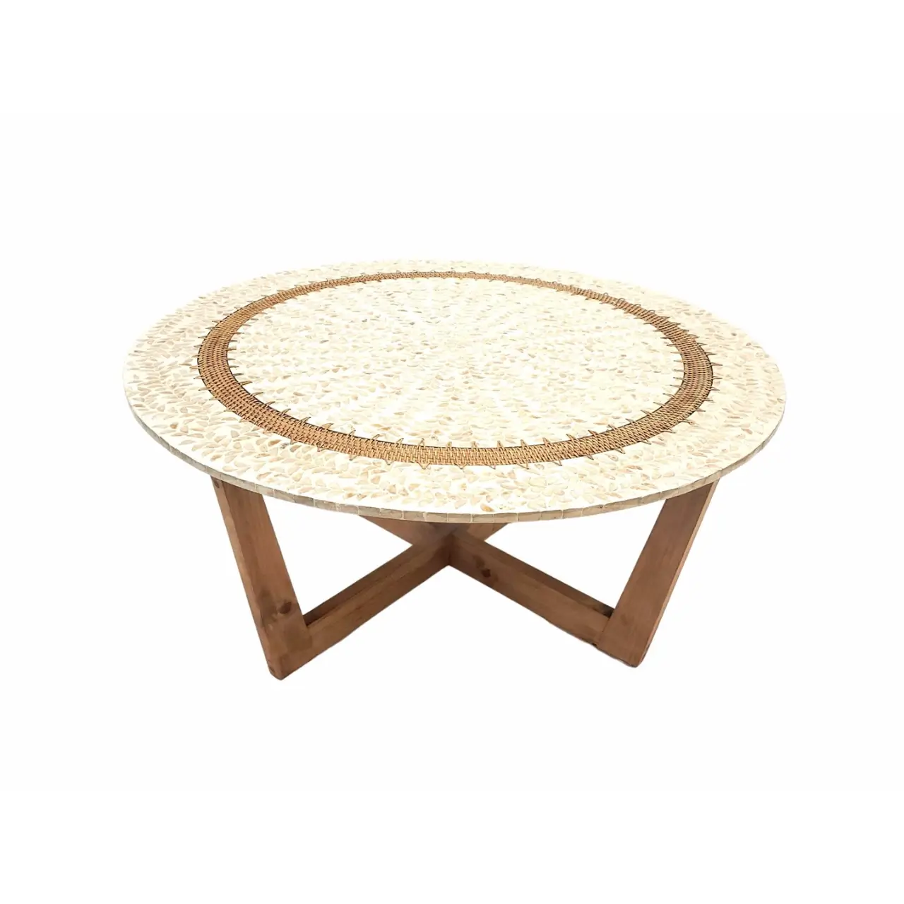 Esta mesa de centro redonda combina madre perla, madera de pino y rattan, creando una pieza elegante y única para tu hogar. Su diseño en tonos naturales y perla se adapta a diversos estilos, aportando un toque sofisticado a cualquier espacio.
